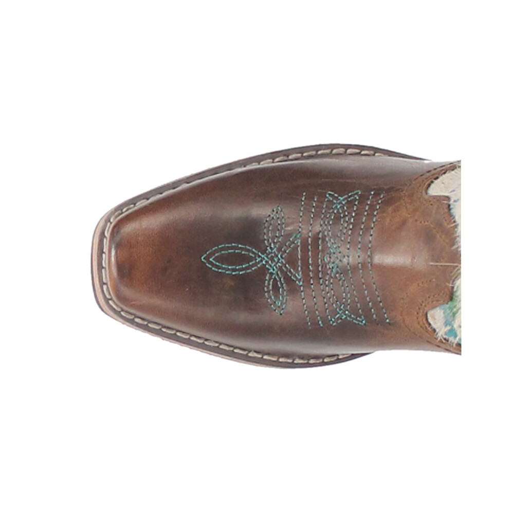 Rumi Cow Metallic Square Toe Cowboy Boots (Big Kid) Product Details Leather upper Cushioned insole Rubber Outsole Heel Height: 1 inch, Shaft Height: 8 inches, Circumference: 9 inches The upper design is inspired by modern artists for an explosion of color. Pops of color are random on the hair-on-hide leather. The blue trim brings the look together. Features cowboy square toe, cowboy heel and rubber outsole Additional Details Color: White Occasion: Casual Gender: Girls Age: Youth Brand: Dan Post Boots