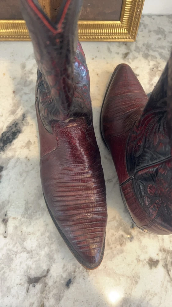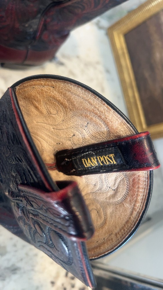 extreamly well made in USA Dan Post cowboy boots. (Im not sure which animal skin it is!) BUT I believe it's a lizard skin or something along the lines of that. Made with real leather and a dark cherry colorway. Has usual worn factors.