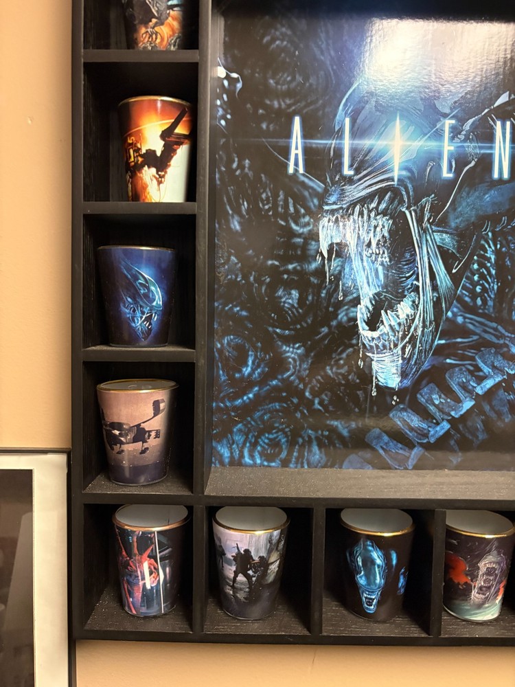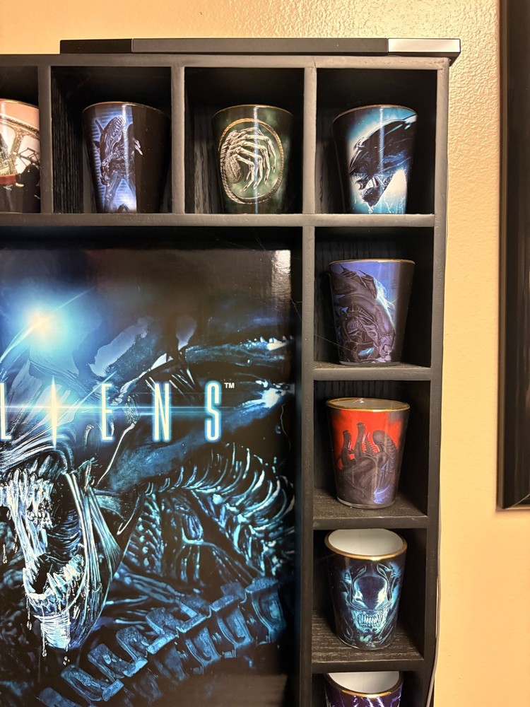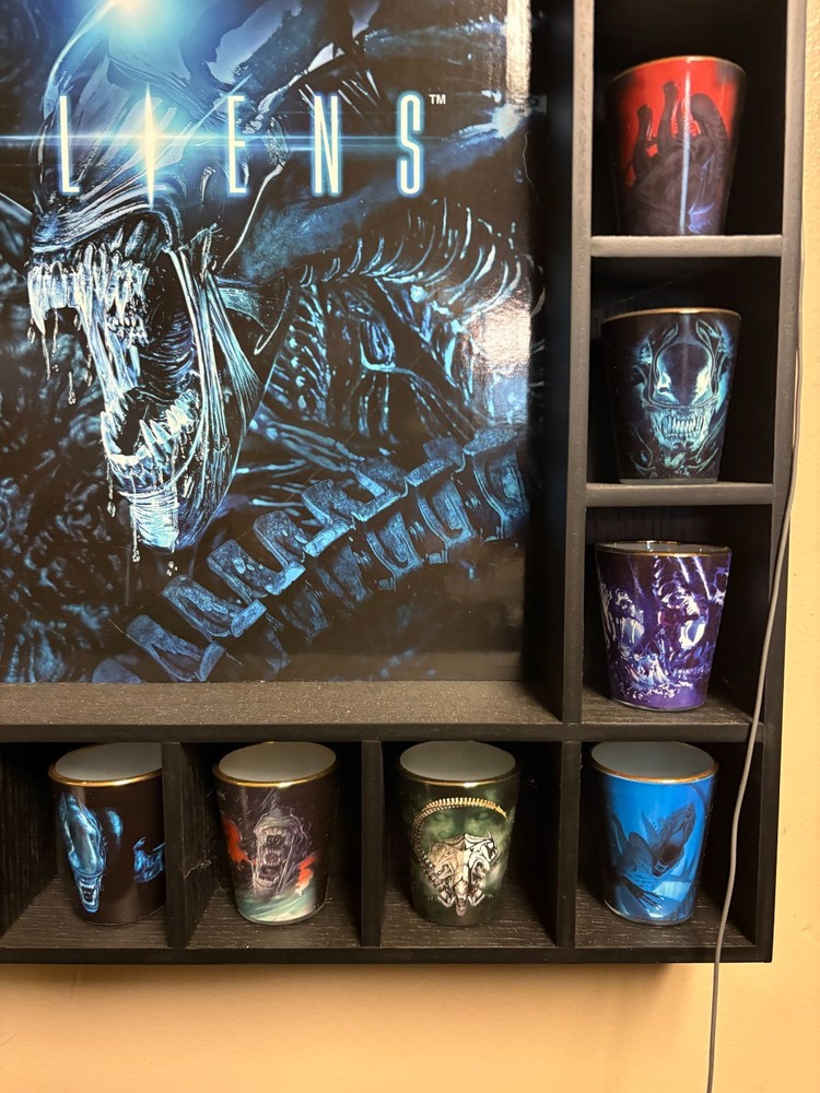 Danbury Mint ALIENS Shot Glass Collection & Display case! There are 20 shot glasses that can fit within the display case that can be wall mounted. Each glass is Gold plated on the rim of the glass and the collection actually has a complete 24 shot glasses (4 are not in photo as they are not on display). This is a Limited Edition collection that is complete. All paperwork for the glasses themselves is also included to authenticate the items. Due to the nature of this collection, it will need to be shipped in 2 separate boxes hence the high shipping rate.