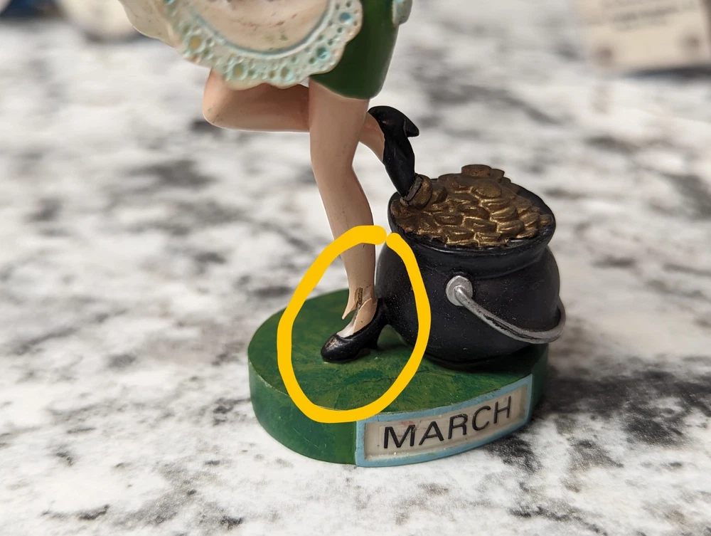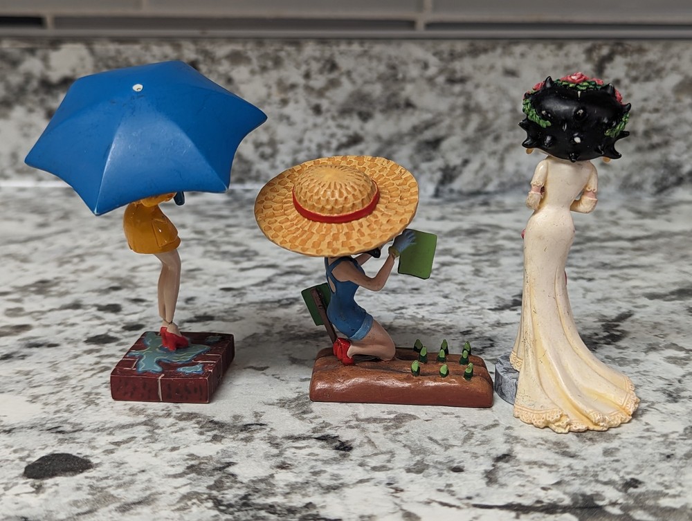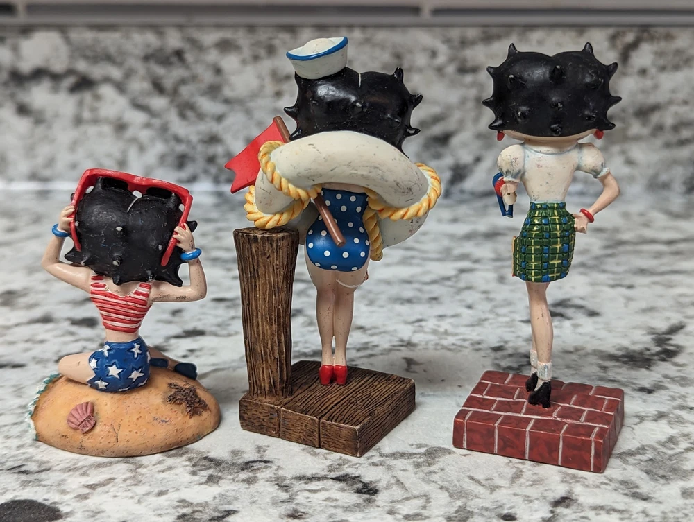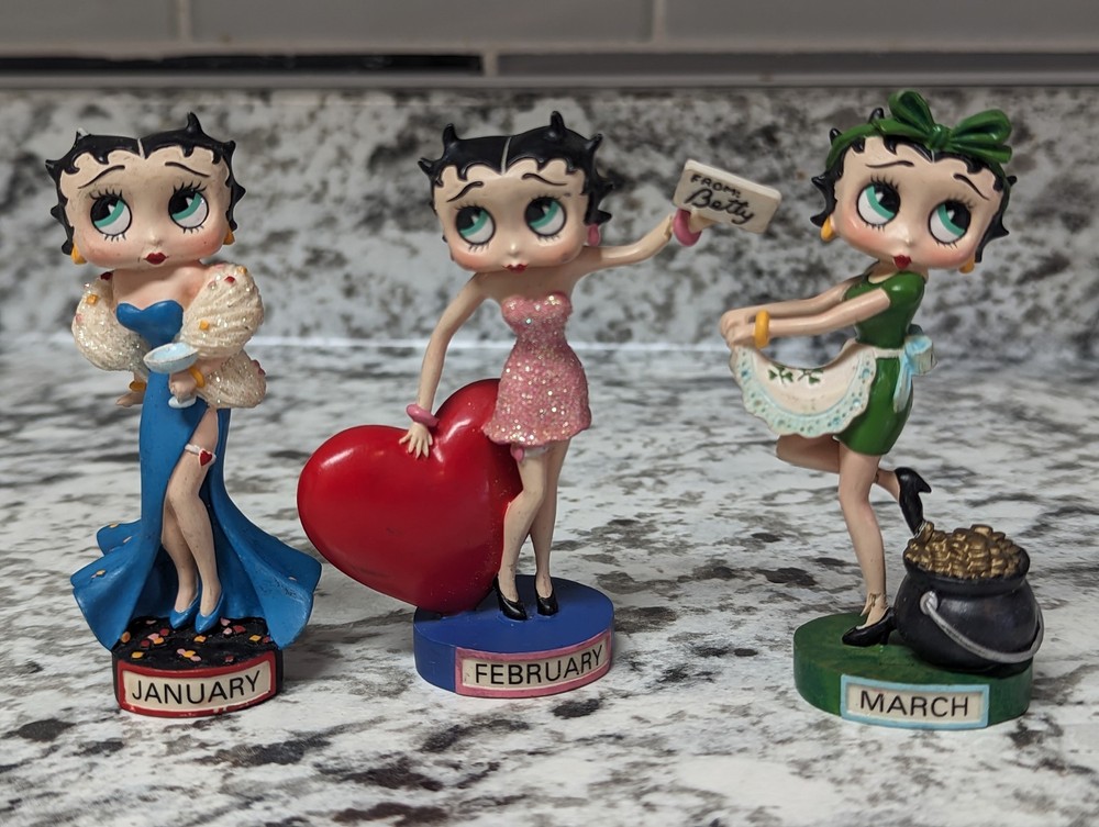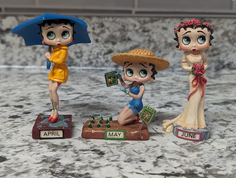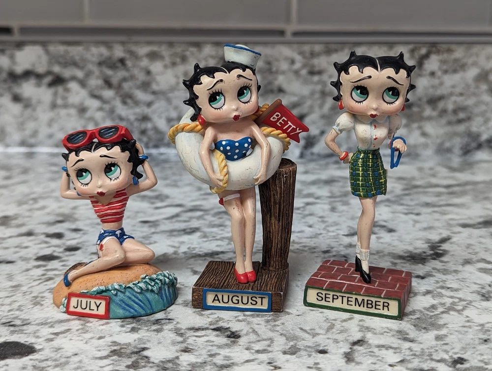 The Danbury Mint Betty Boop Calendar Mth Figurine Booping Through The Years 12. Out of the 12 figures 5 of the months have some slight damage to them. The months of February, March, April, September, and October are the ones with damage, can see in the pictures. The rest of the figurine months are in good condition.