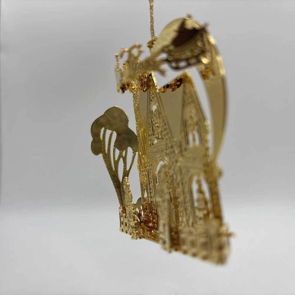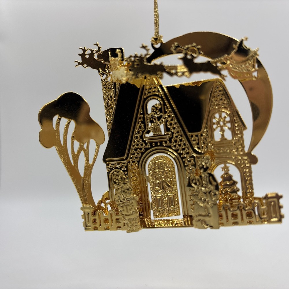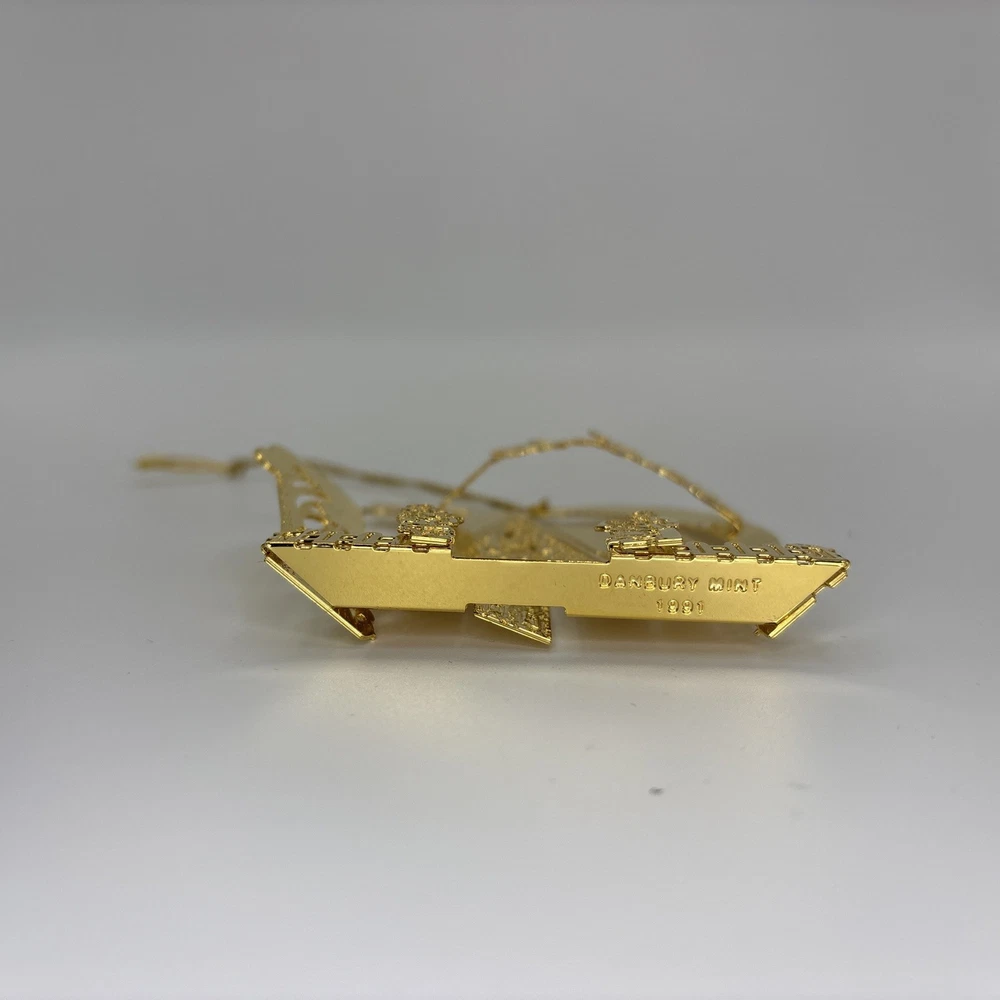 The Danbury Mint Christmas Ornament from 1991 features a charming Santa Claus design with a reindeer sleigh, perfect for adding a touch of holiday cheer to your Christmas tree. This gold-plated vintage ornament is a special addition to any ornament collection, with intricate details and a classic Christmas theme that will be cherished for years to come. Made of gold and metal, this ornament showcases the craftsmanship and quality of Danbury Mint, making it a cherished collectible for any Christmas enthusiast. This item does not come in original packaging/box.