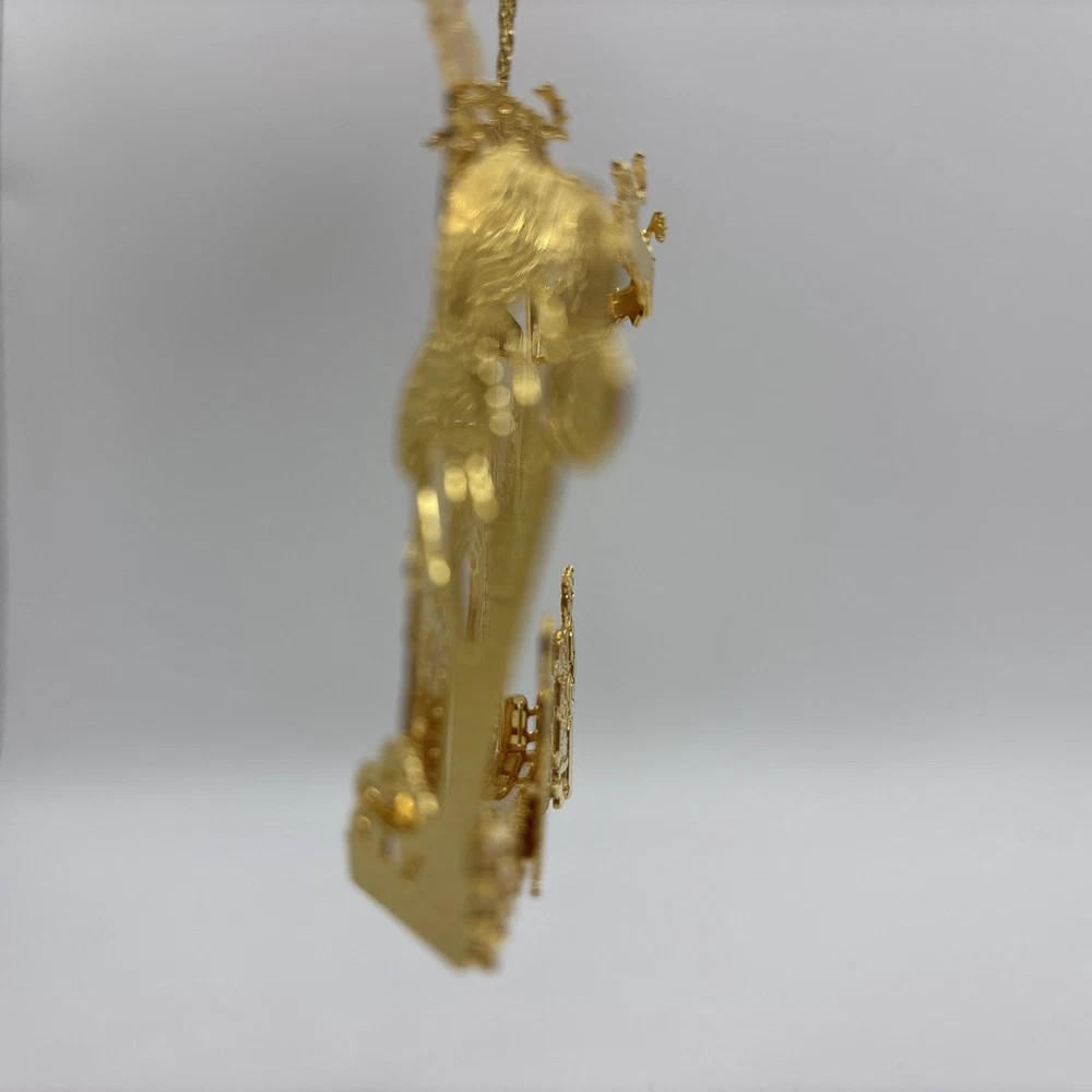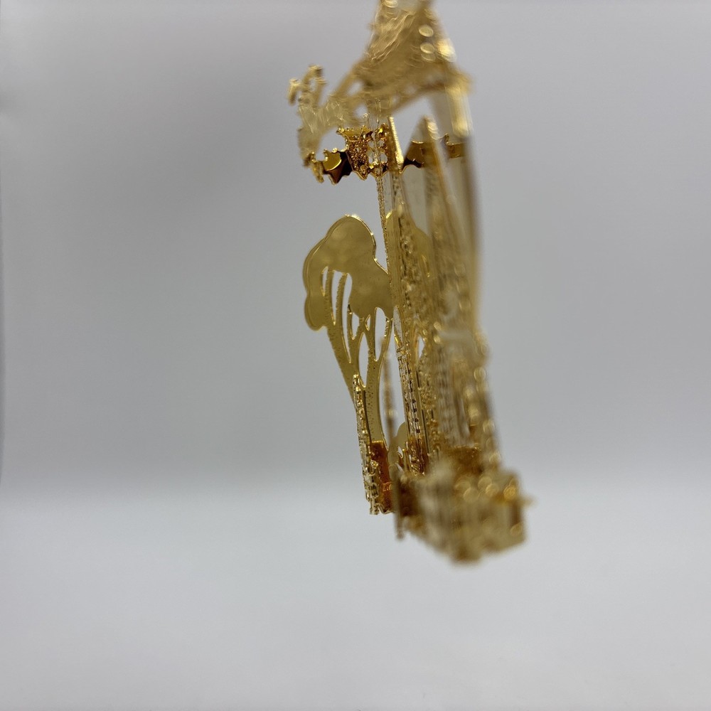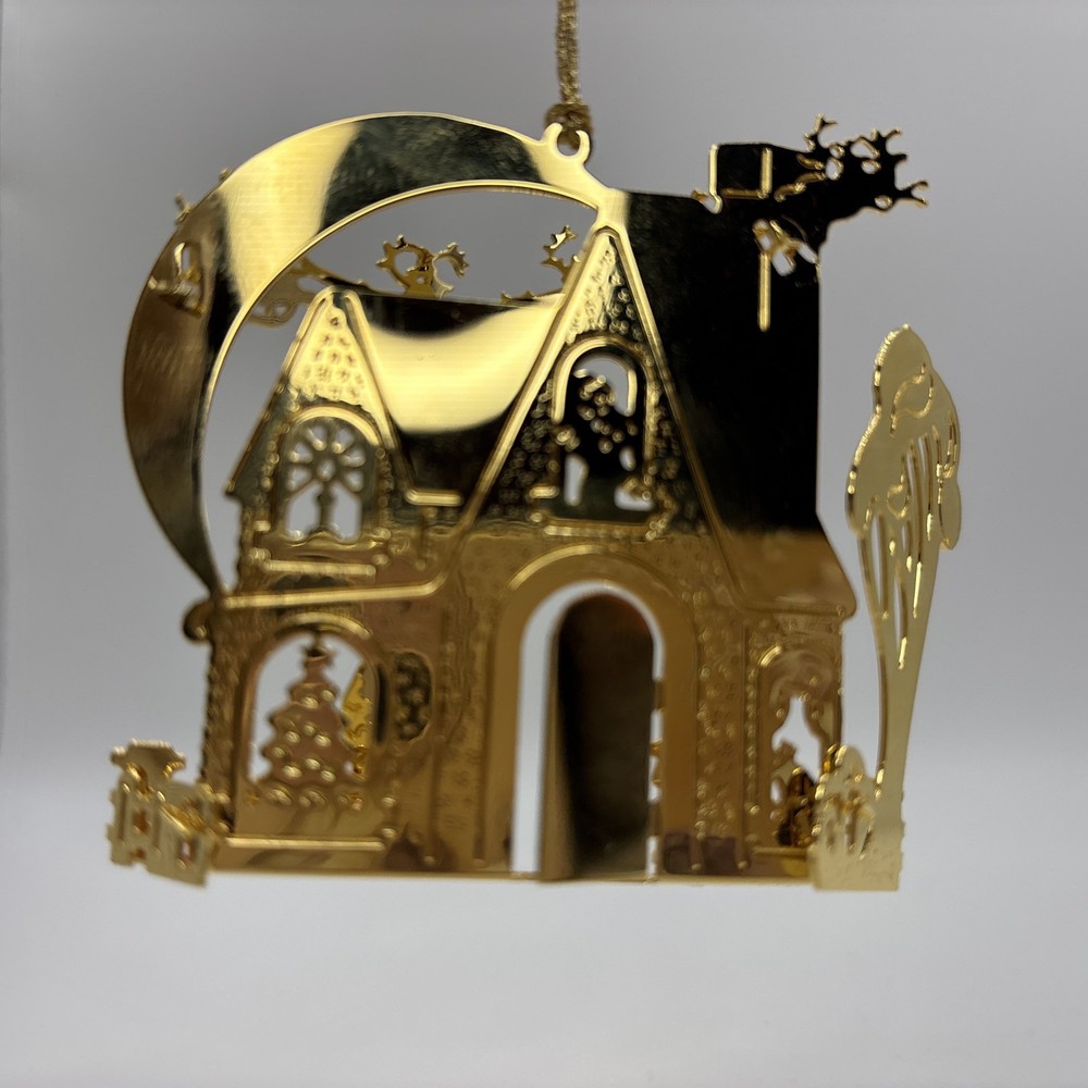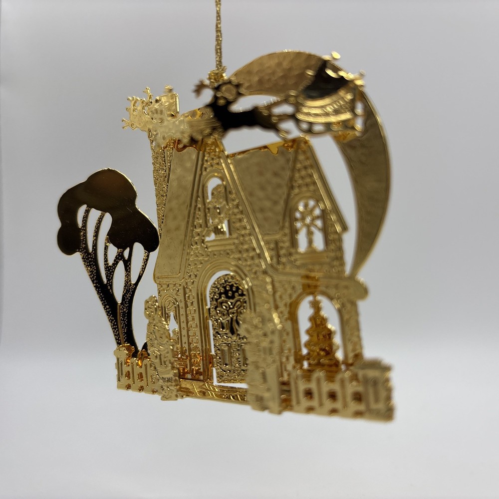 The Danbury Mint Christmas Ornament from 1991 features a charming Santa Claus design with a reindeer sleigh, perfect for adding a touch of holiday cheer to your Christmas tree. This gold-plated vintage ornament is a special addition to any ornament collection, with intricate details and a classic Christmas theme that will be cherished for years to come. Made of gold and metal, this ornament showcases the craftsmanship and quality of Danbury Mint, making it a cherished collectible for any Christmas enthusiast. This item does not come in original packaging/box.