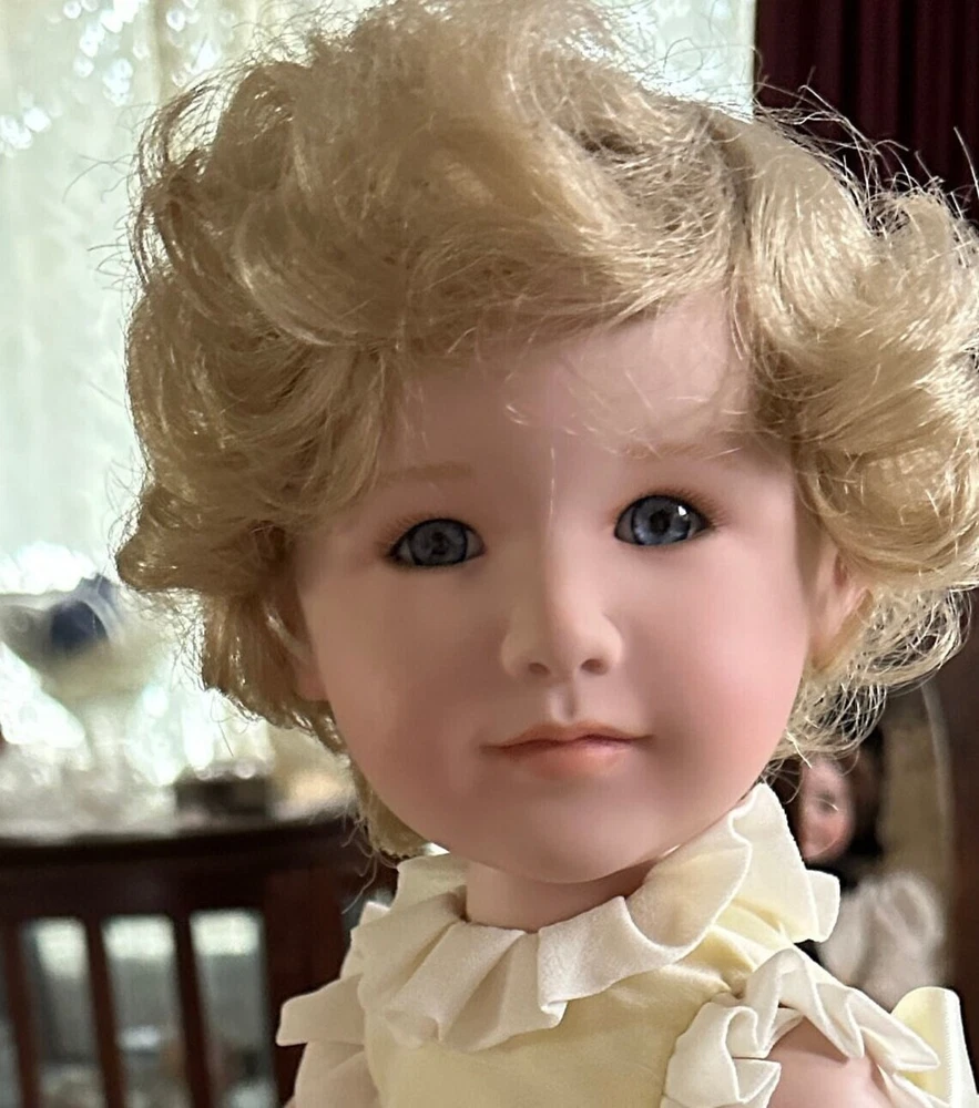 Danbury Mint Little Elizabeth Portrait Doll & Boyds Bear --Made in celebration of Queen Elizabeth's Diamond Jubilee (Includes original doll box and COA.) This exquisite doll is made with high-quality porcelain and fabrics. Her "Lilibet" face is so charming it will steal your heart away. The sheer ruffle-layered frock is so sweet in soft yellow, tied in the back in a lovely bow. She loves to hold her cuddly teddy bear, another high-quality product (an original, jointed Boyd's Bear collectible). She is approx. 18" long and sits about 12" high. Her face, breast plate, arms, and legs are made of the finest porcelain and painted with realistic detail. Her body is stuffed cotton, weighted to sit in an adorable toddler position. Underneath she is wearing crisp-white ruffled bloomers and the sweetest shoes (with coordinating yellow bows) and anklets. Her hair is styled in the sweetest baby waves and her baby-blue, glass eyes have the most adorable expression. She will be carefully packed (and tucked in) to travel safely from my clean, smoke-free, pet-free home to yours. Thank you for your interest! Happy to answer any questions.