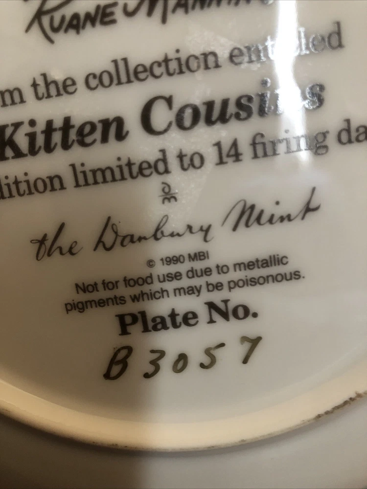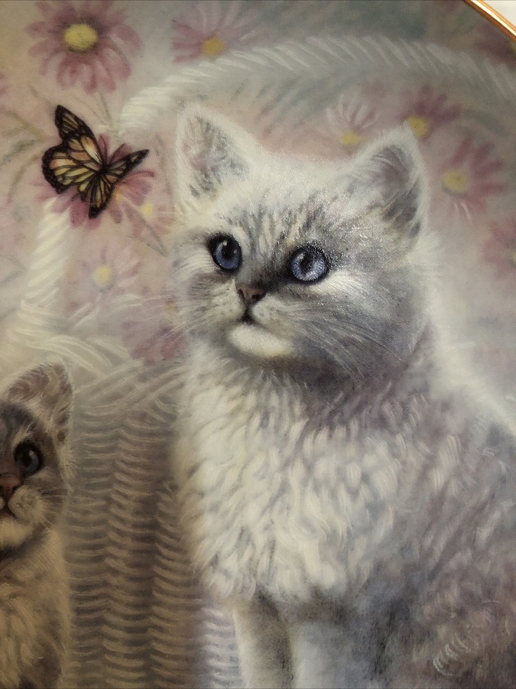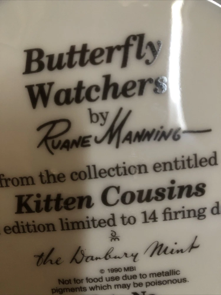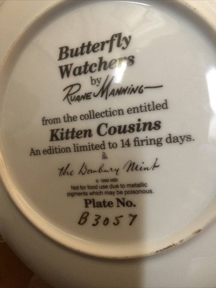 Danbury Mint Vintage 90’s ‘Butterfly Watchers’ Cat Plate Limited Edition Kitsch Butterfly watchers by Ruane Manning from the collection entitled Kitten Cousins. An edition limited to 14 firing days. The Danbury Mint. Plate no B3057. 8 in