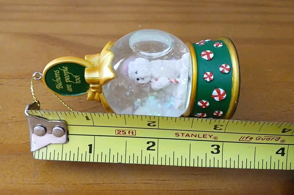 Add a touch of Christmas spirit to your holiday decor with this Danbury Mint Dog collection Bichon Snow Globe Ornament. "Bichons are people too," Ornament . The medium-sized ornament features a cute dog shape with a snow pattern and multicolor design, perfect for any adult recipient over the age of 18 years. The vintage ornament is part of the Danbury Mint product line and comes with a 3-inch length, 3-inch height, and 2-inch width. Celebrate the holiday season with this unique and beautiful ornament that will surely become a part of your collection. The Danbury Mint Bichon Snow Globe Ornament Collection is a perfect addition to your Christmas decorations and is sure to bring joy to your home. Pre-owned and in good condition.