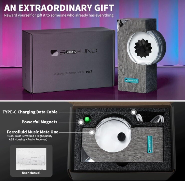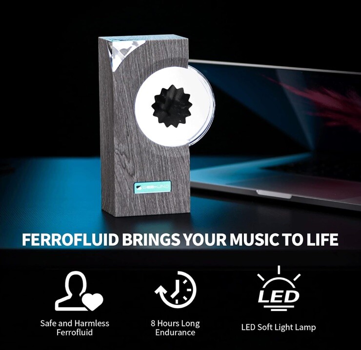 Design inspiration】Ferrofluid is known as the prototype substance of the Marvel movie "Venom". The design purpose is to make the ferrofluid in the glass bottle jump out of different postures with the rhythm of the external sound/music, so that the sound/music can be visualized. 【Material】Note:Does not contain speaker will not make a sound. High strength ABS plastic shell,Imitation oak grain design,crystal diamond decoration,high transparency glass,nano iron powder,pure water,environmentally friendly and non-toxic. Built-in MIC,white LED backlight,can be used without connecting to any line,built-in battery,can last 8 hours when fully charged. 【Usage scenarios】It can be used as a music mate/sound partner for HI-FI speakers and Bluetooth speakers, desktop creative gift toy ornaments, ferrofluid displays, relieve tension toy, ferrofluid dancing lamp, and can also be placed on the piano surface as a piano Metronome.