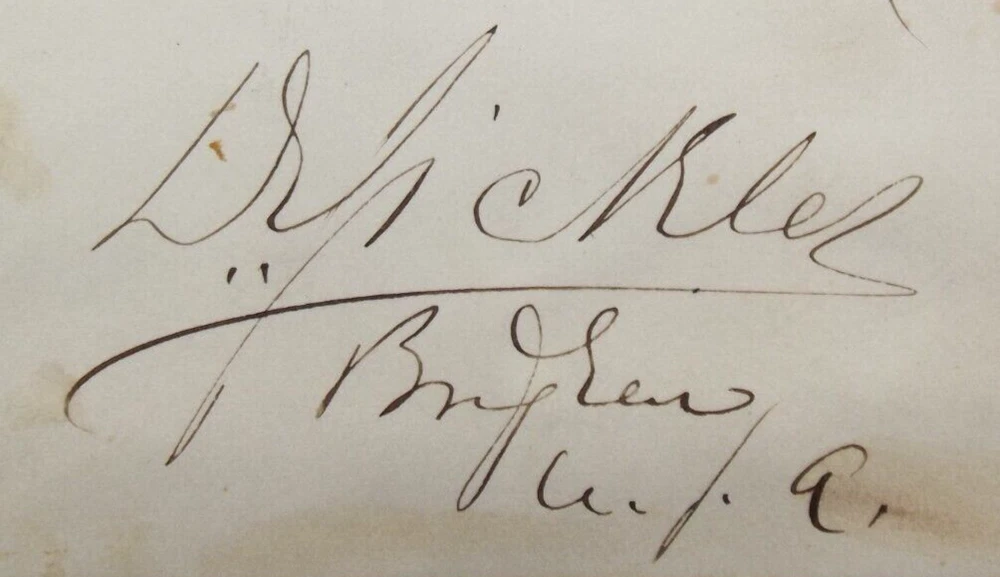 General Daniel Edgar Sickles [1819 1914] was an American politician, soldier and diplomat. Sickles was appointed as a Brigadier General at the opening of the American Cilil War and was later promoted to Major General. General Sickles commanded at the Peninsula Campaign, the Seven Days Battle, the Battle of Fredericksburg, and the Battle of Gettysburg. Listed for auction is the autograph of general Daniel Edgar Sickles signed on a card. The autograph is inscribed and signed '' D.E. Sickles Brig Genl U.S.A'' in black fountain pen. The card measures 3.25 x 2.25 inches, it has toning otherwise is in very good condition. The autograph is authentic and is a nice example of this prominent Union Army commander. Dear Collector, we are regularly adding autographed framed displays to our eBay Store. The following is a sample of our inventory, Harry Houdini, Marilyn Monroe, George Custer, Elvis Presley, U.S. Presidents John F. Kennedy, Harry S. Truman, Franklin D. Roosevelt, Theodore Roosevelt, James Garfield, James Monroe, Erwin Rommel, Robert Oppenheimer, Bela Lugosi, Boris Karloff, Ernest Hemingway, Abner Doubleday, Auguste Bartholdi, Buffalo Bill Cody, Walt Whitman, Charles Dickens, Margaret Mitchell, Thomas Edison, Charles Lindbergh, Amelia Earhart, Alexander Graham Bell, Laurel & Hardy, Charlie Chaplin, George Patton, Gutzon Borglum, Samuel F. B. Morse, Brigham Young, Wernher von Braun, Lon Chaney Jr, P.T. Barnum, Apollo Astronaut crews, and many more. Please have a look and feel free to contact us with any questions. Happy collecting from collectors.view Autographs. Authenticity/Return Policy/About Us. Dear collector, we are lifetime autograph collectors and an autograph dealer with over 20 years of autograph sales on eBay. We believe the purchase of an autograph is a monetary investment. Our policy is simple, all our autographs are researched and guaranteed authentic with ''No'' time limits. All sales will be accompanied with our Certificate of Authenticity, and we also offer a 30-day unconditional return policy, If the autograph or display you purchased is not as stated or is not to your expectation simply return and we will refund your full purchase price along with your return shipping costs. We are also a Top-Rated eBay seller with thousands of satisfied customers. We feel you should be comfortable with your purchase and our policy reflects this. United States and Overseas Shipping/Handling. Please Read.... Dear collector, shipping in the U.S is free unless otherwise noted in the auction description. Your auction will be well packed and shipped United States Postal Service 1st class with delivery tracking with the exception of larger framed items which will be shipped United States Priority Mail with signature confirmation. To our overseas customers shipping is as follows, your auction will be shipped through eBay's Global Shipping Program. Note, the limit for shipping an auction overseas is 2500.00 dollars, any auction above this price cannot be shipped. We do combine shipping on paper items [letters, photographs, album pages, etc.] purchased together. Also please note we do not have control over a package once it has shipped and import duties, taxes and custom charges are determined by the Global Shipping Program. Thank you for your purchase, your auctions will be well packed and shipped upon payment.