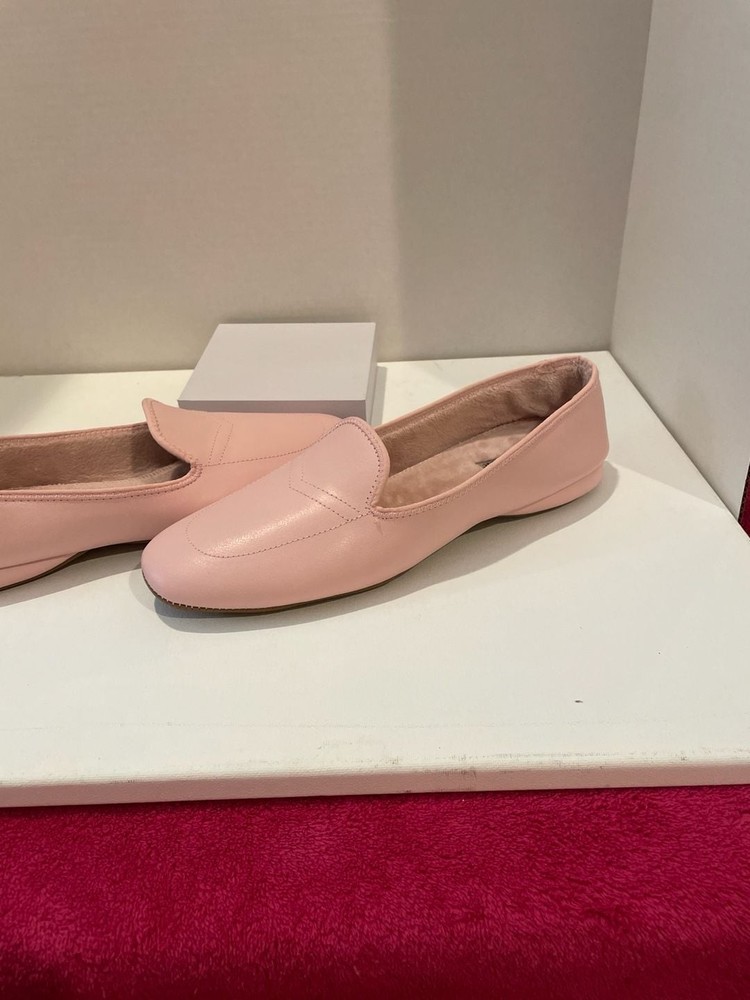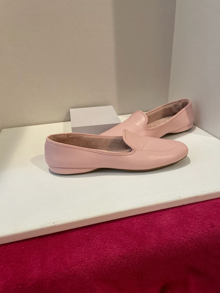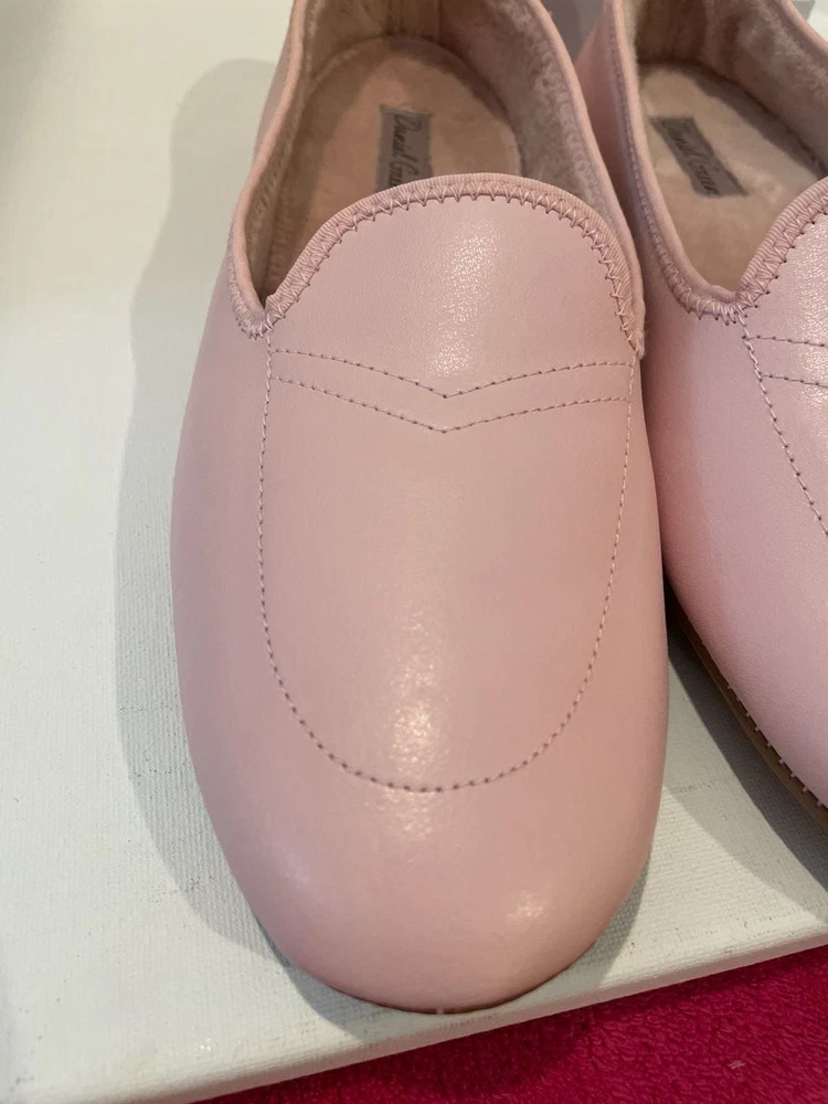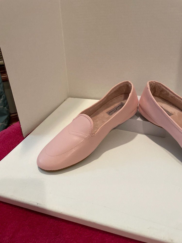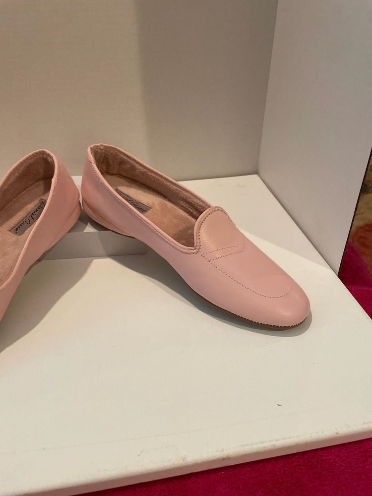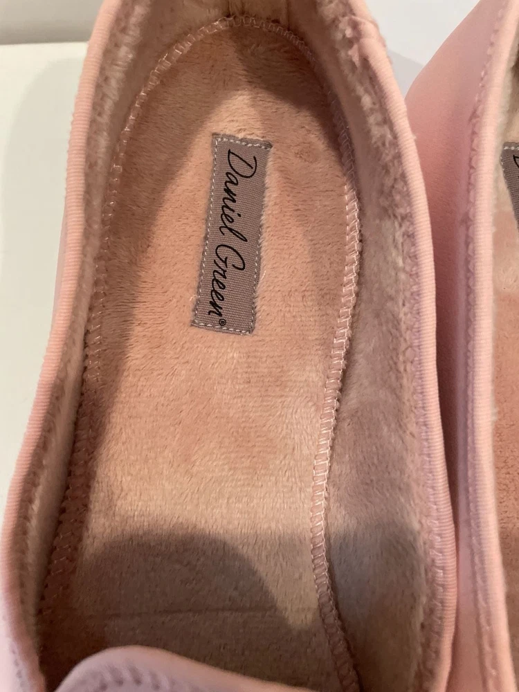 Daniel Green Meg Slipper Shoes in Pink Leather. Super soft inside! Women's Size 10. These classic slip-on slippers feature a soft leather upper and a comfortable, cushioned footbed. Crafted with a durable sole suitable for indoor wear, these flats offer a timeless silhouette with subtle topstitching details. A perfect choice for lounging in style and comfort. New w/out box. No signs of wear as shown in the photos.