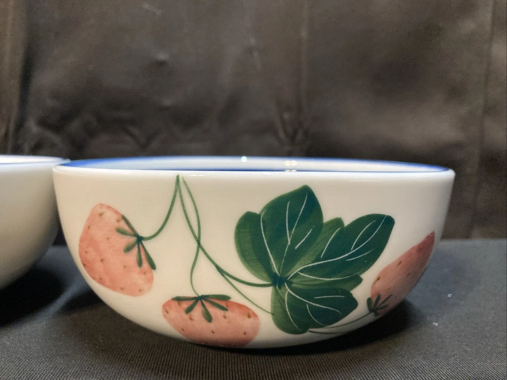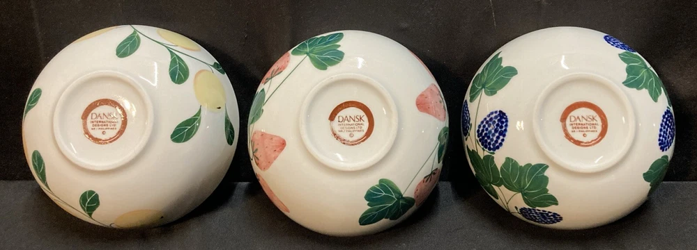 The set of 3 Dansk cereal bowls features a berries pattern: blackberry, strawberry, and peach. Each bowl has a diameter of 5.25 inches and a height of 2.25 inches. The set is pre-owned and comes in good, clean condition with no chips, cracks, or breaks. Please see pictures for details. If you have any questions or concerns, please do not hesitate to contact us. Check out our other items and message us if interested in more than one listing as combining items could save you money on shipping.