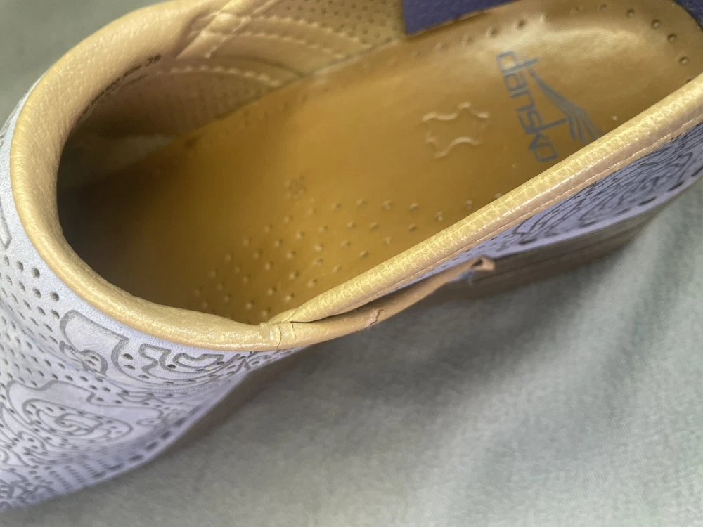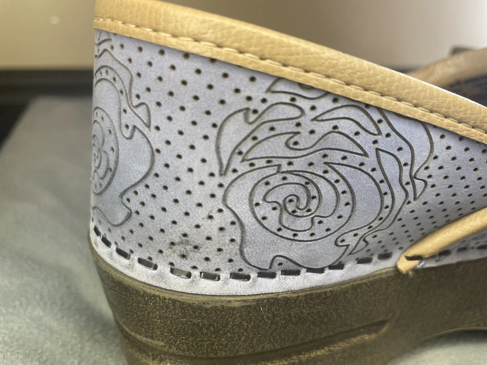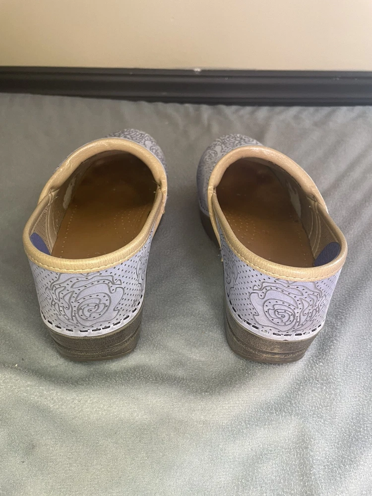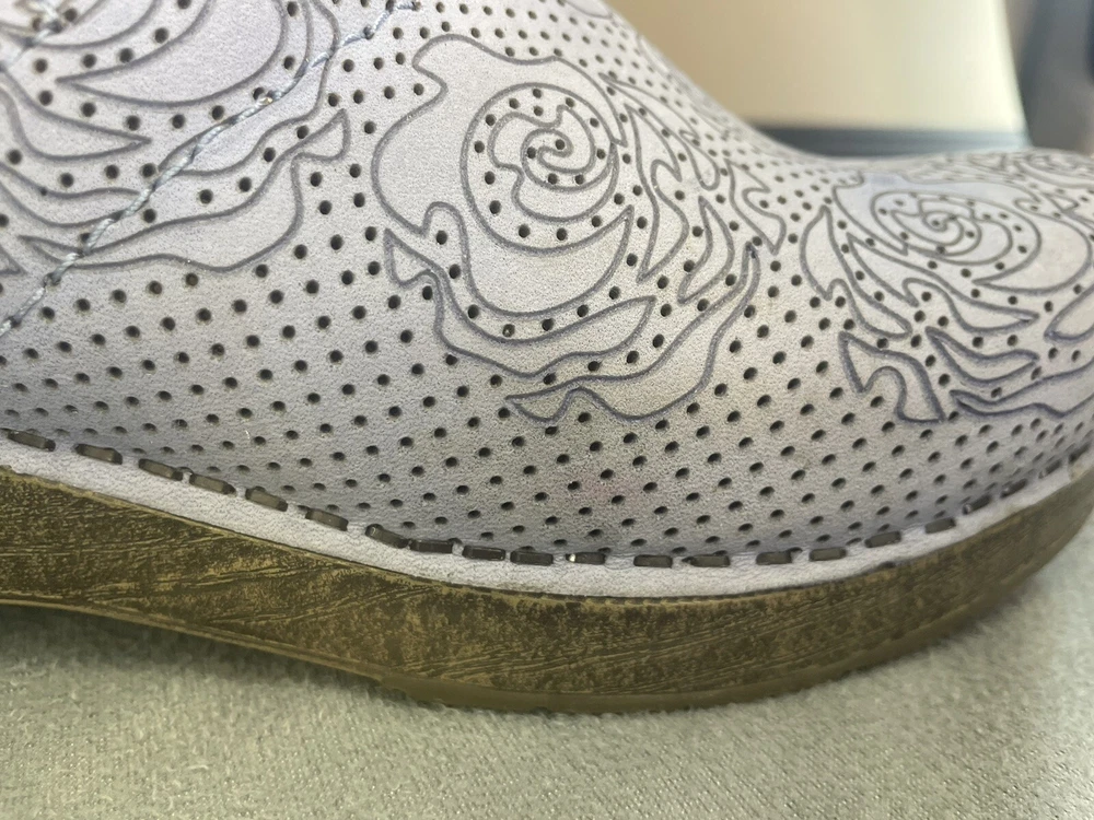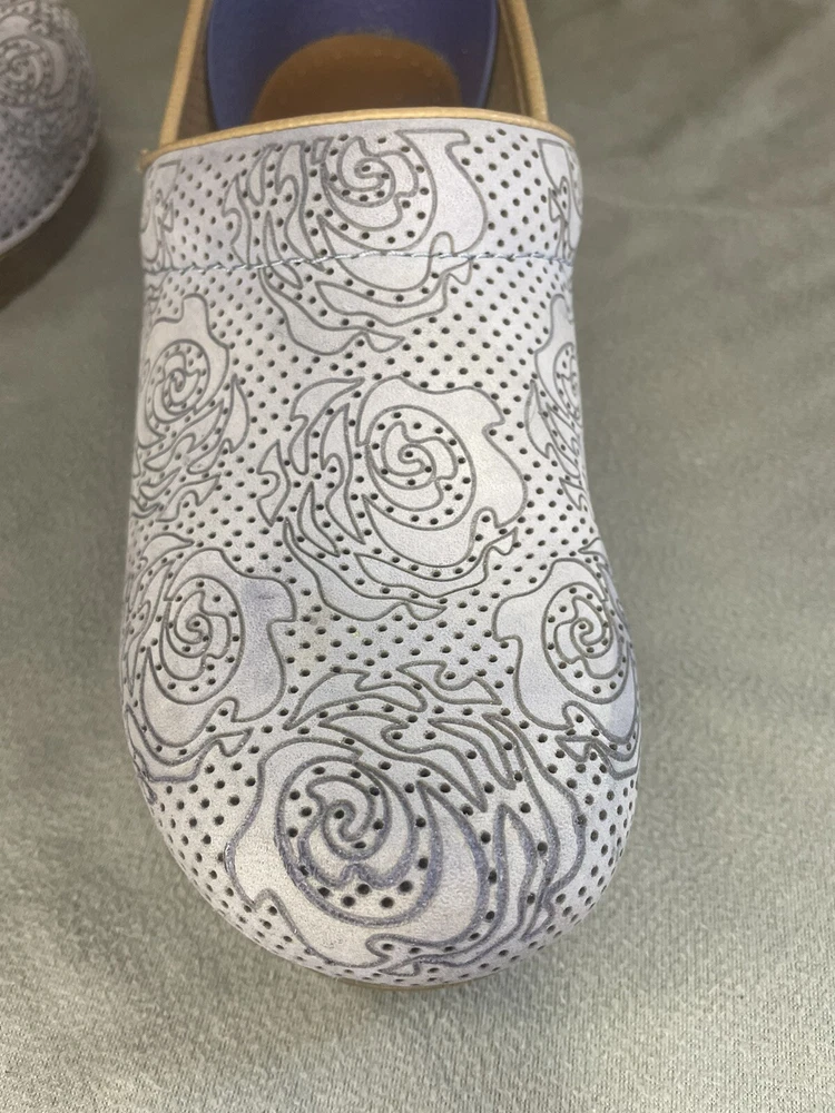 Dansko clogs are perfect for women who want both style and comfort. These blue suede clogs feature a round toe shape, slip-on closure, and a mid-height rocker heel style. The shoes are cushioned and have a comfortable feel, making them suitable for casual and workwear occasions. The clogs are perforated with a floral pattern, which adds a touch of bohemian and classic style to them. These shoes are handmade in China and are available in a standard shoe width. They are perfect for walking and are available in all seasons, including winter, summer, fall, and spring. The lining material is leather, and the upper material is also leather. These shoes are a great addition to any wardrobe and are perfect for those who want a comfortable and stylish pair of shoes.
