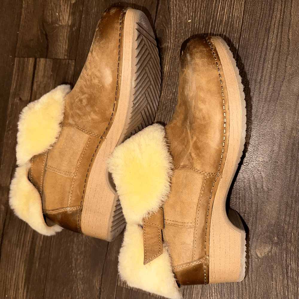 Dansko ortho, comfortable, Sherpa lined, distressed, tan, slip on, European clogs. In good, gently used condition. From a pet and smoke free house.