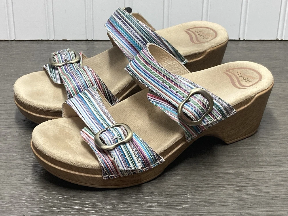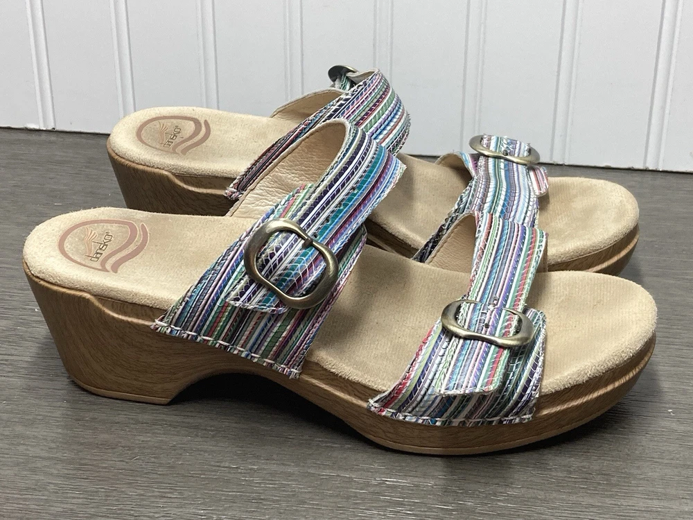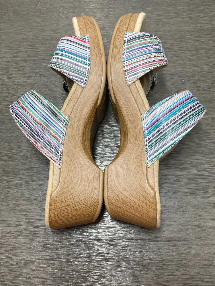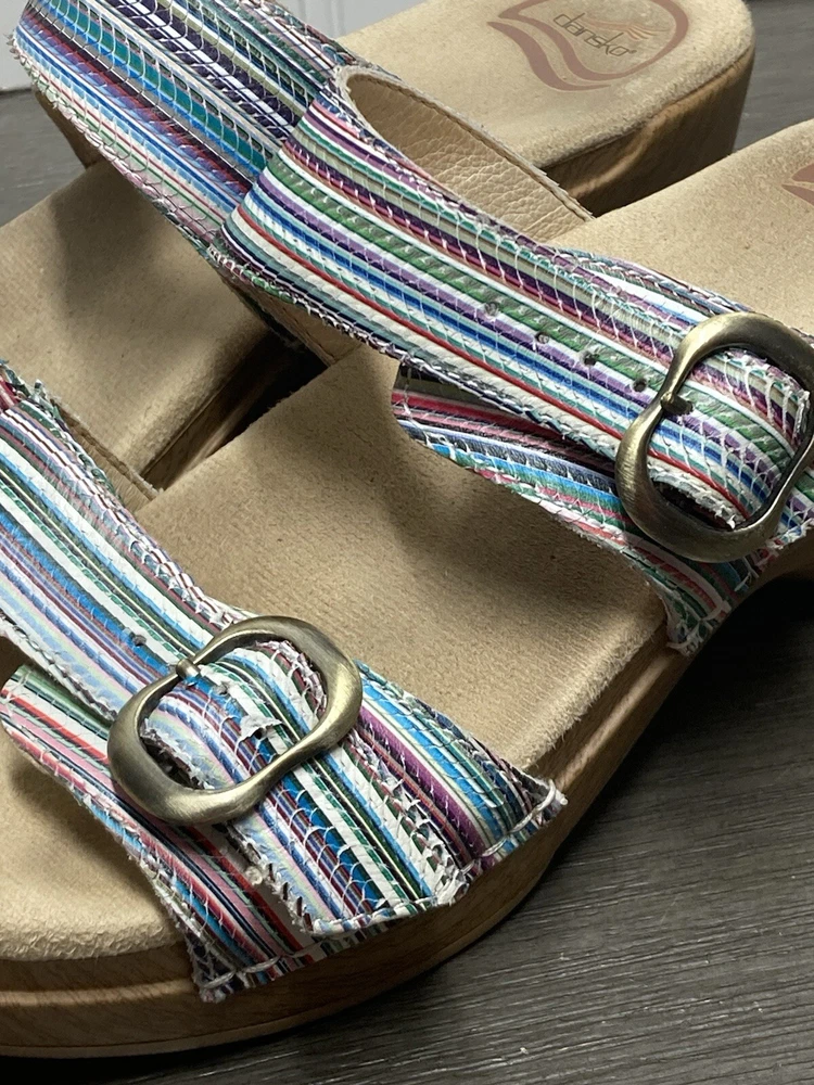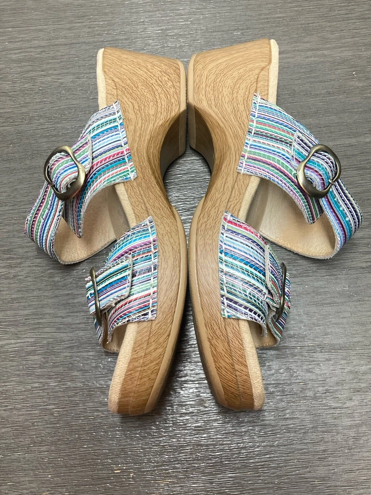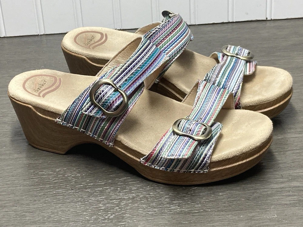 These Dansko Sophie sandals are perfect for the woman who loves both comfort and style. They are slip-on with adjustable buckle straps for closure and the perfect fit. Made of leather and featured in a multicolor striped pattern with a faux wood exterior. They are suitable for travel and casual wear. Available in a women’s EU size 39. They are in great condition with no damage. Add these stylish sandals to your shoe collection today! FAST SHIPPING!!