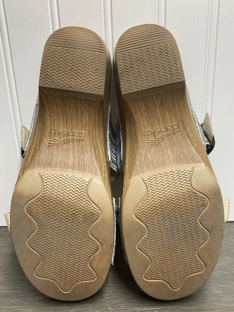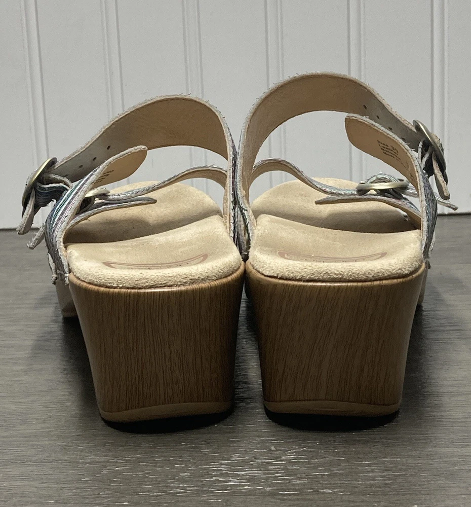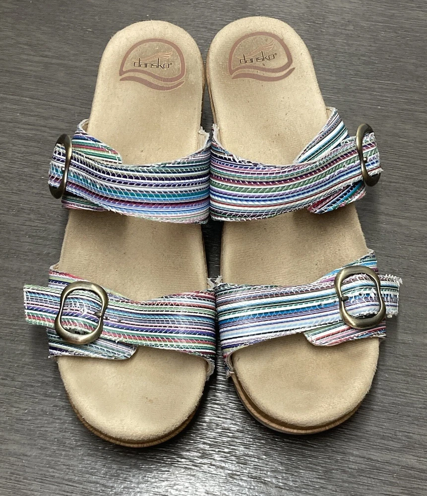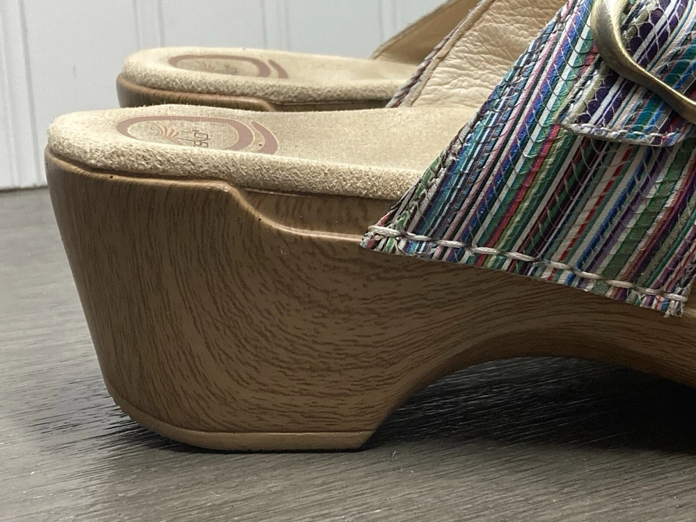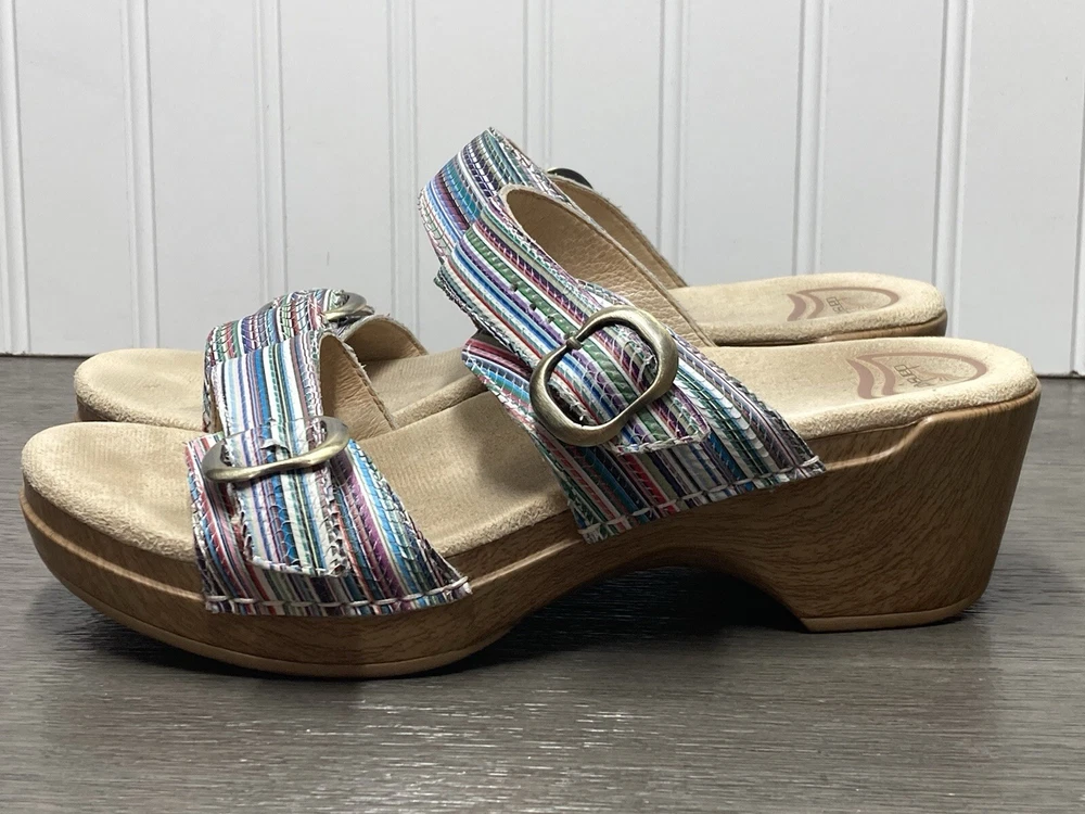 These Dansko Sophie sandals are perfect for the woman who loves both comfort and style. They are slip-on with adjustable buckle straps for closure and the perfect fit. Made of leather and featured in a multicolor striped pattern with a faux wood exterior. They are suitable for travel and casual wear. Available in a women’s EU size 39. They are in great condition with no damage. Add these stylish sandals to your shoe collection today! FAST SHIPPING!!
