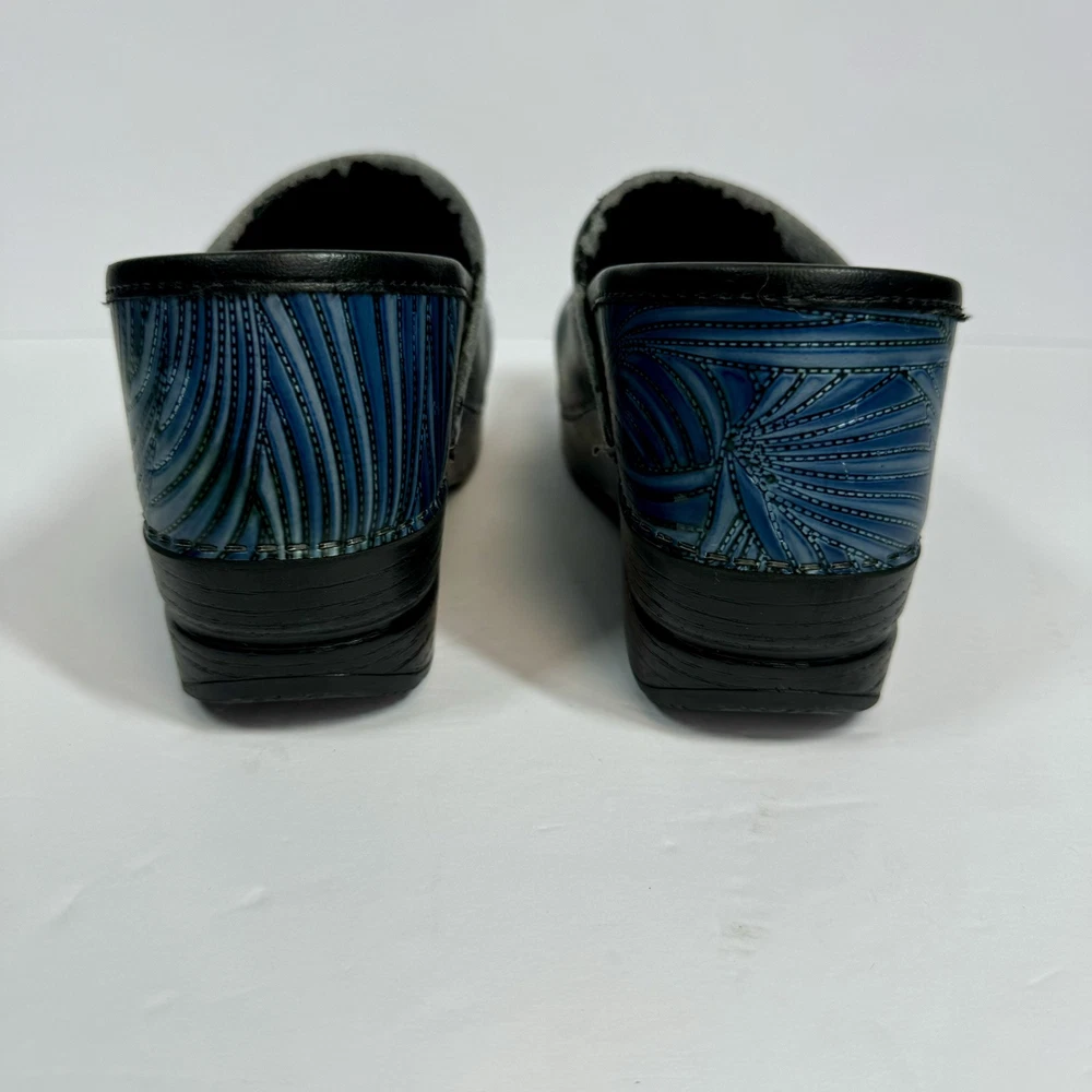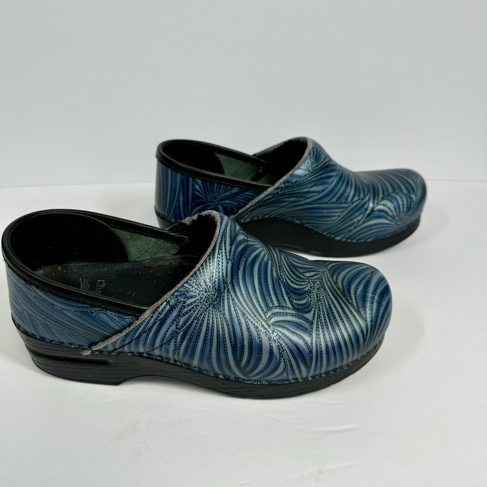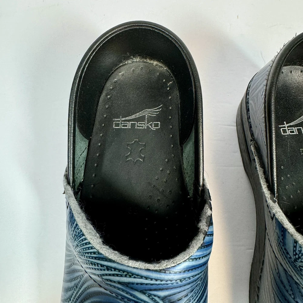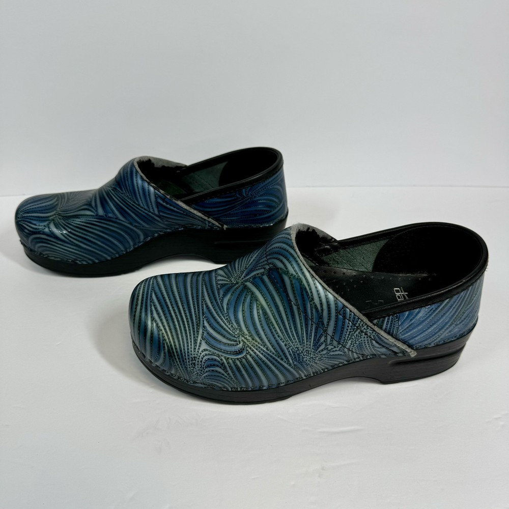 Experience ultimate comfort and style with these Dansko clog shoes featuring a beautiful blue swirl pattern. These shoes are perfect for women who love walking and want a pair of shoes that provide arch support and comfort. The slip-on design makes them easy to wear, while the rubber outsole ensures durability and stability. Crafted from high-quality leather, these clogs are designed to last and are perfect for travel, workwear, or casual occasions. The round toe shape and standard width make them a great fit for most women. These shoes are perfect for those who love classic and vintage designs, with a touch of modernity.