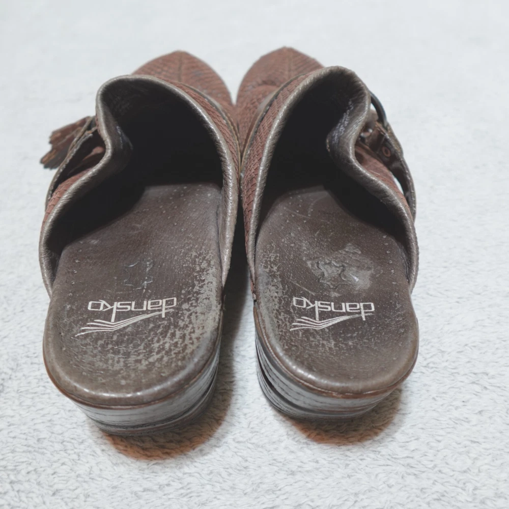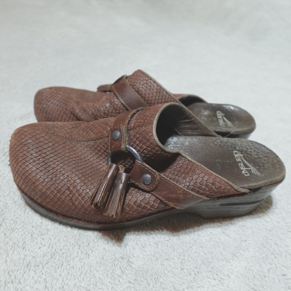 Dansko Clogs Shoe Womens EU 40 US 9.5 Shandi Brown Leather Snake Print 174807878. Good condition, no stains or tears, one minor white scuff on the outside edge of the right shoe as pictured, minimal wear noted on the soles/bottoms, please review all photos. If we missed something, don’t worry, we offer free returns. Just indicate, “just didn’t like it,” for any reason, and we’ll pay for the return. Thanks for visiting!