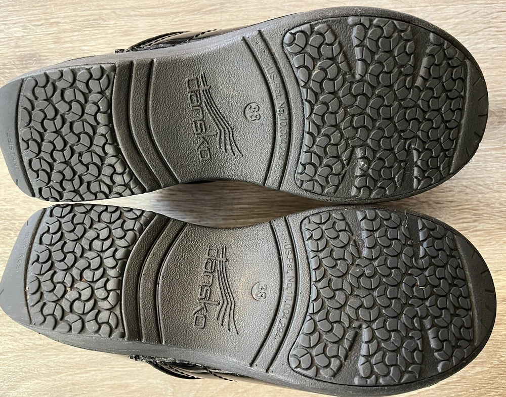 The Dansko XP 2.0 Patent Leather Clogs in black are designed for women in size EU 38/US 7.5. These slip-resistant clogs feature a round toe, mid heel height, and comfortable block heel style. They are ideal for casual or workwear occasions, with a classic style and logo accents. Made with patent leather upper material, leather lining, and rubber outsole, these clogs provide both style and functionality for walking activities. Perfect for all seasons, these Dansko Professional clogs offer a standard shoe width and are a timeless addition to any wardrobe. Awesome shoe. Like new!!!!! Comfortable!!!
