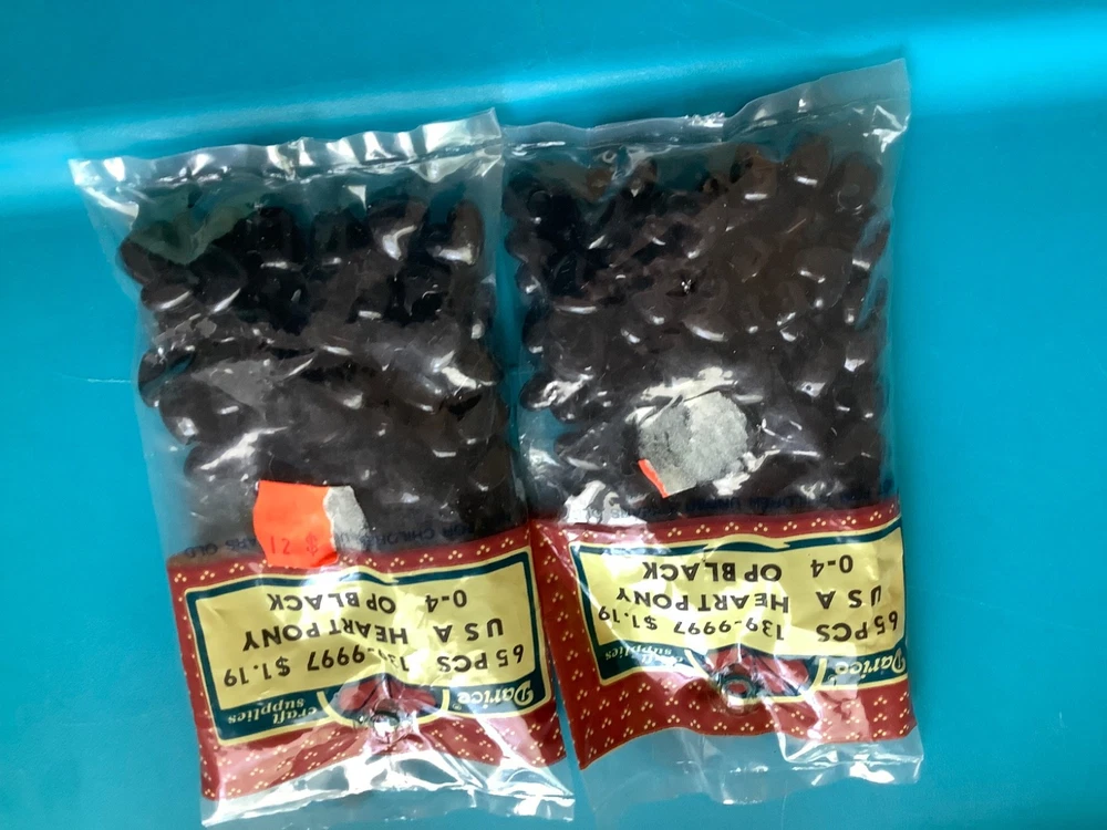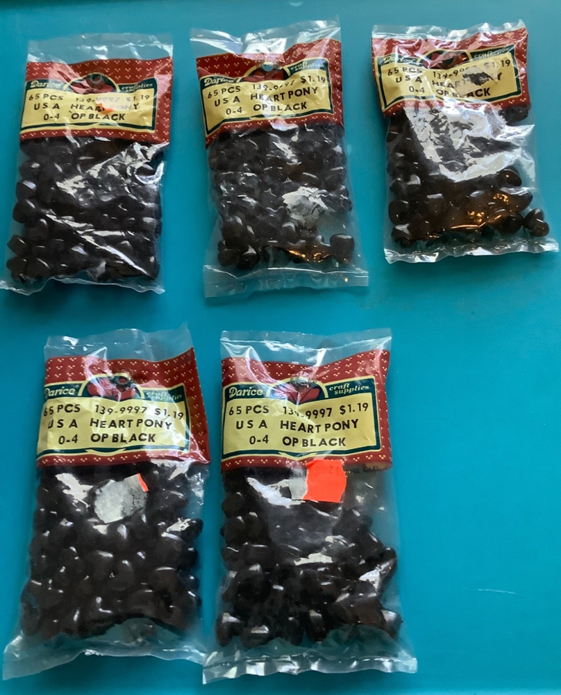 Darcie vintage Black Heart Pony Beads USA NEW 325 pieces LOT NEW 5 packages Heart Pony Beads 139-9997 USA 04 OP black 65 pieces per bag = 325 beads Please ask questions, no returns please, no international shipping If you find something wrong, please contact me first. ***Check out other beads listed and other items; I will combine shipping. Please let me know what you want to combine for shipping.