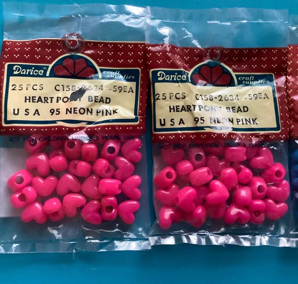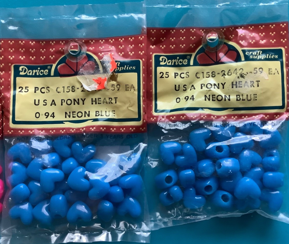 Darcie vintage Neon Pink and Neon Blue Heart Pony Beads USA NEW 100 pieces LOT 2 packages Heart Pony Beads C158-2634 95 Neon Pink 25 pieces per bag = 50 beads 2 packages Heart Pony Beads C158-2642 94 Neon Blue 25 pieces per bag = 50 beads Please ask questions, no returns please, no international shipping If you find something wrong, please contact me first. ***Check out other belts listed and other items; I will combine shipping. Please let me know what you want to combine for shipping.