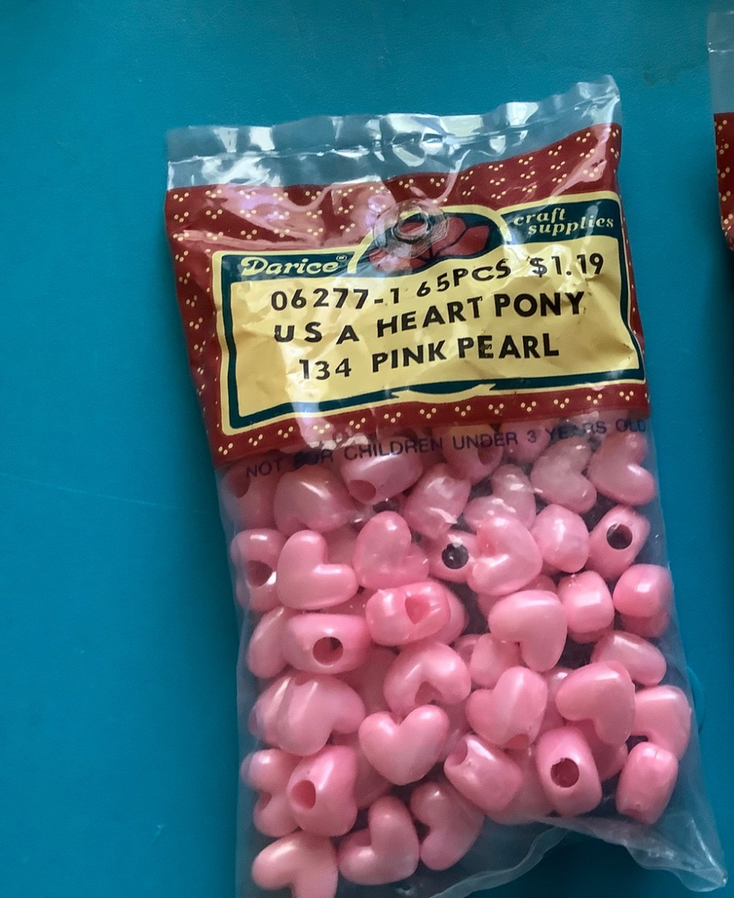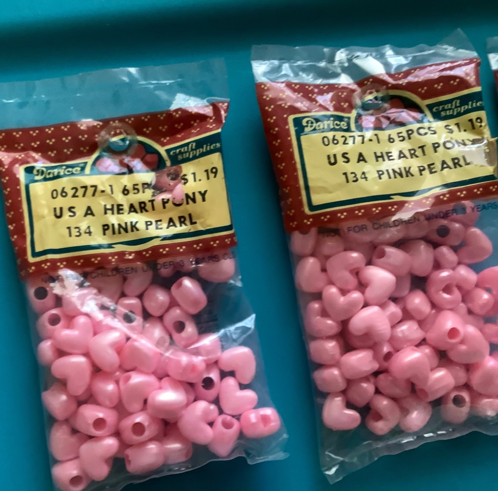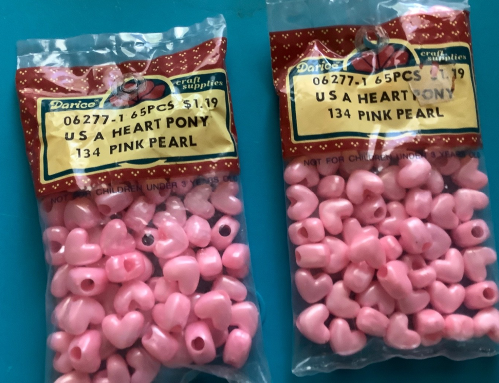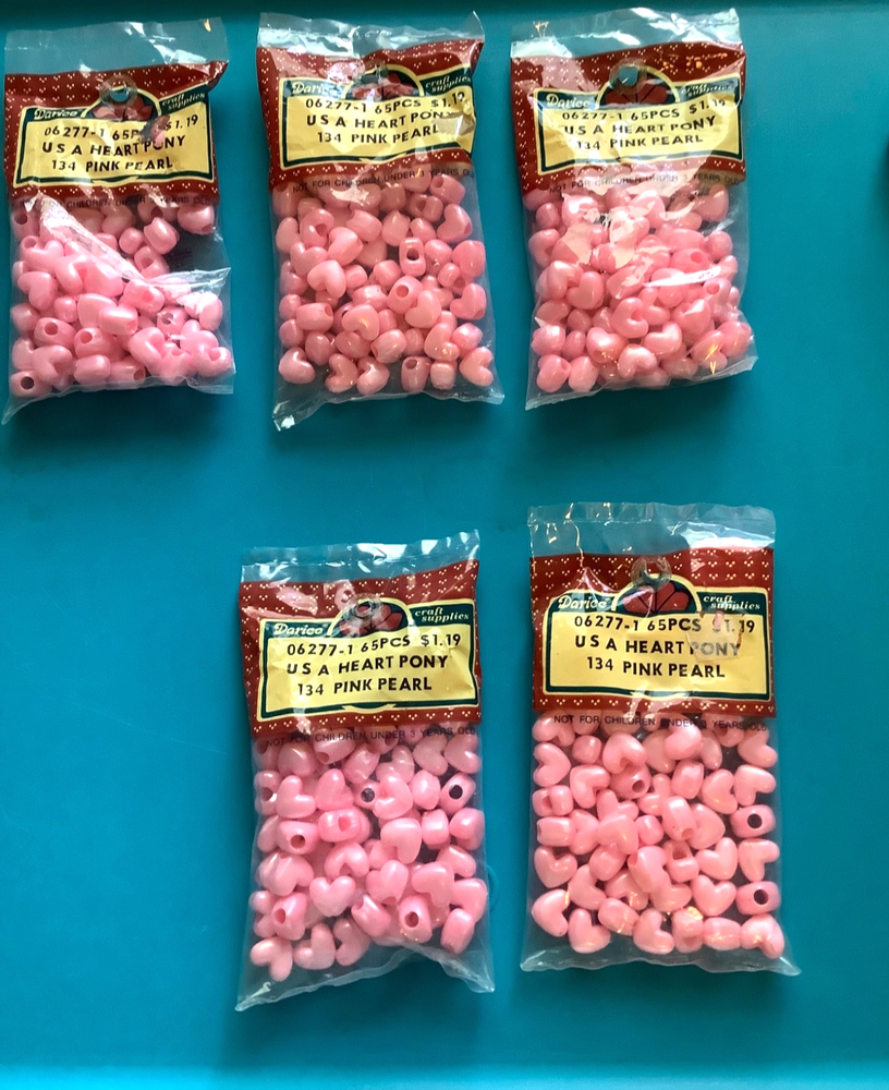 Darcie vintage pink pearl Heart Pony Beads USA NEW 325 pieces LOT NEW 5 packages Heart Pony Beads 06-2271 USA 134 - Pink Pearl 65 pieces per bag = 325 beads Please ask questions, no returns please, no international shipping If you find something wrong, please contact me first. ***Check out other beads listed and other items; I will combine shipping. Please let me know what you want to combine for shipping.