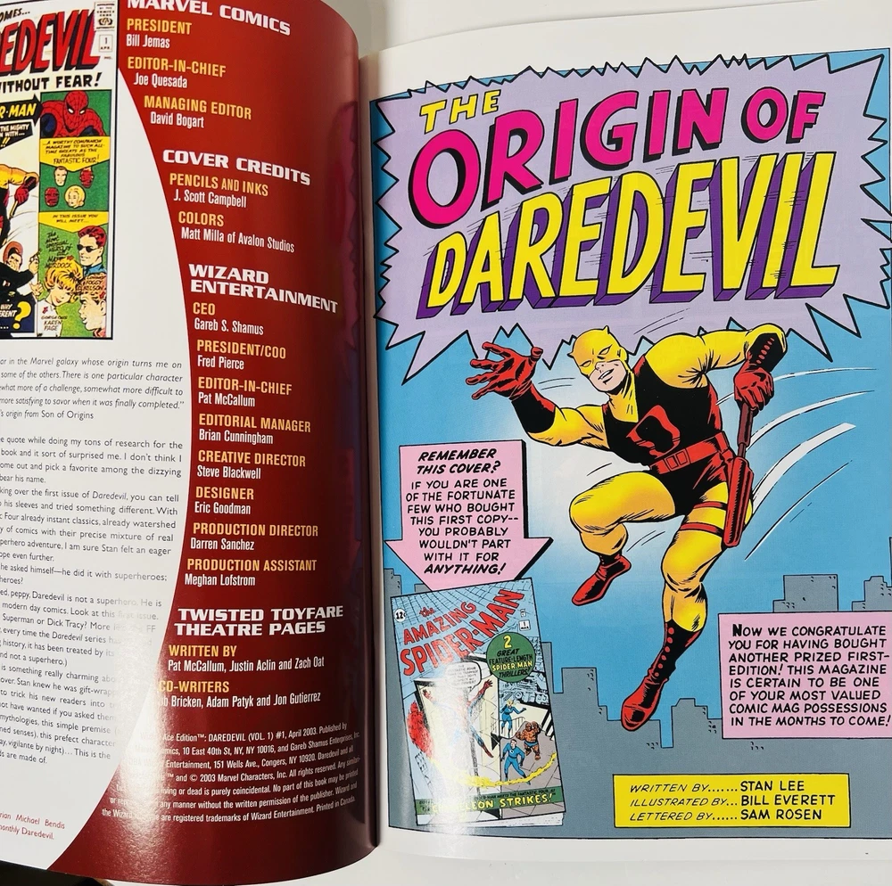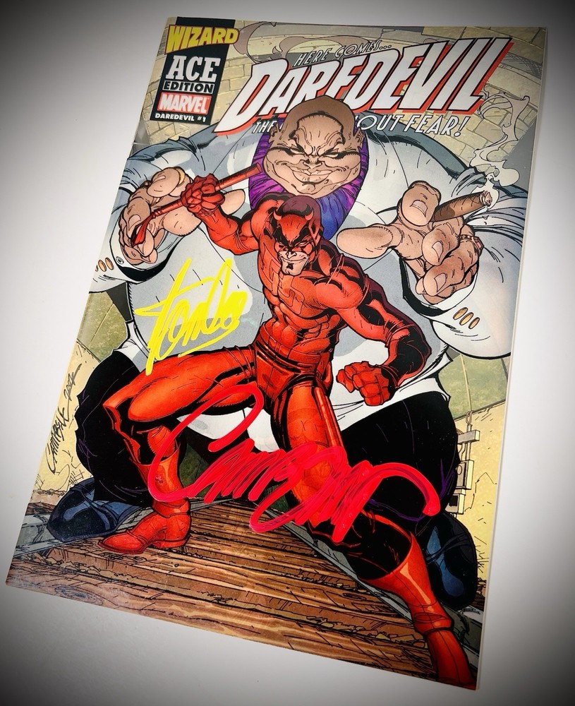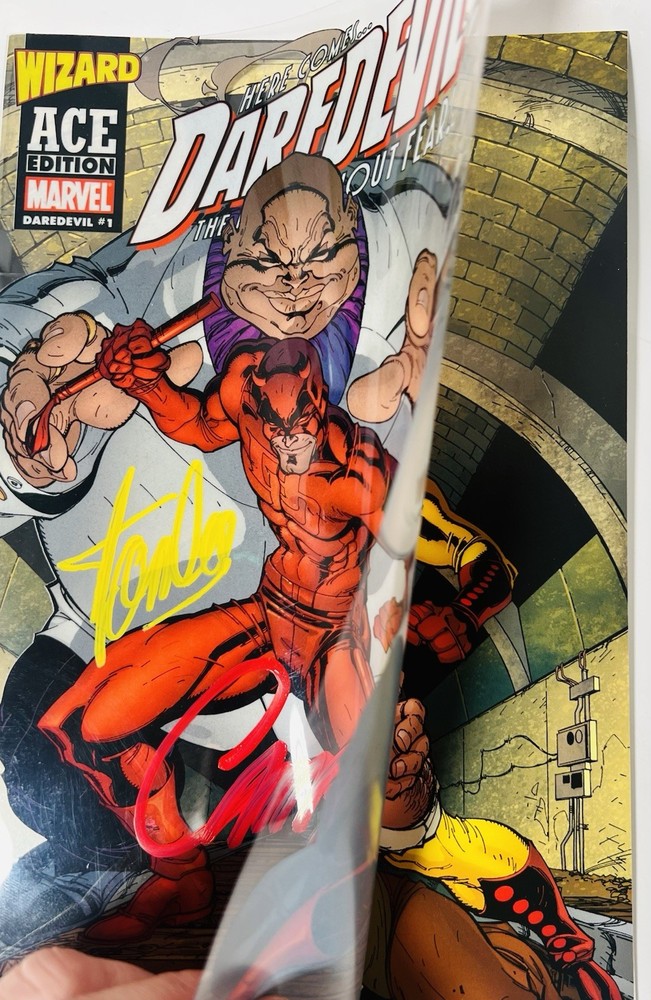 The Daredevil 1 Wizard Ace Edition comic book features an acetate cover by artist J. Scott Campbell, signed by both Campbell and Stan Lee. This modern age comic from Marvel's universe is a single issue variant with a unique artist cover. The origin story follows the iconic character Daredevil, making it a must-have for fans of superheroes and US comics. This limited edition collectible is a valuable addition to any comic book collection.