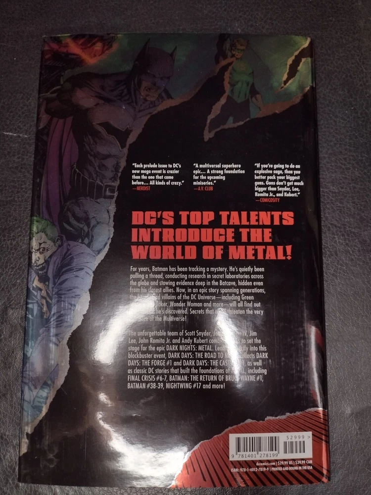 Genre: Superheroes Era: Modern Age (1992-Now) Series Title: Dark Days: the Road to Metal Publication Year: 2018 Publisher: DC Comics Tradition: US Comics Character: Linda West, Green Lantern (Kilowog), Joan Garrick, Green Lantern (Kyle Rayner), Green Lantern Corps Green Lantern (Guy Gardner), June Robbins (Apparent Deaths), Houngan, Vixen (Mari Mccabe), Chief Savage (Vandal Savage), Mister Miracle (Shilo Norman), Wildcat, Batman (Bruce Wayne), Hourman (Rick Tyler), Mind Grabber Man, Checkmate White King Michael Holt, Pig Iron, Halo (Gabrielle Doe), Human Flame (Mike Miller) (Villain), Radiant (Sister Clarice), Black Canary (Dinah Laurel Lance), Lord Eye, Old Man (Corpse), Other Past Incarnations of Carter and Shiera, Khufu, Hawkgirl (Kendra Saunders), Anthro, Jai West, Catwoman, Death, Atom Smasher (Albert Rothstein), Miss Martian (M'gann M'orzz), Hawkman (Carter Hall), Superman (Us President Calvin Ellis) (Earth-23), Green Lantern (Sodam Yat), Checkmate Black King (Taleb Beni Khalid), Monitor (Nix Uotan), Silent Knight (Flashback), Immortal Man, Libra (Villain), Apollo (Earth-50), Big Barda, Dr. Madison, Tattooed Man (Mark Richards), OMACs, Dr. Light (Kimiyo Hoshi), Lex Luthor (Villain), Jimmy Olsen, Kamandi, Also Shown Alive in the Past, Joker, Power Girl, Ms. Seward, Dubbilex, Doc Magnus (Dr. Will Magnus), Flash (Wally West), Wonder Woman (Diana Prince), Mary Marvel (Mary Batson) (Possessed by Desaad), Iman (Diego Irigoyen), Red Ryan, Sonny Sumo, Ocean Master (Orm) (Villain), Kal-El, Mirror Master (Evan Mcculloch) (Villain), Wonder Girl (Cassie Sandsmark), Aquaman (Arthur Curry), Brainiac (Earth-23), Rip Hunter, Mandrakk Monitor, Global Peace Agency (Question (Renee Montoya)), Blackhawks Blackhawk (Janos Prohaska), Sunshine Superman, Red Robin (Tim Drake), Captain Marvel (Billy Batson) (Earth-5), Rocky Davis, Man-Of-Bats, S.T.R.I.P.E. (Pat Dugan), Amphitrion (Winged Creature), Plastic Man (Shaped like an Egg), Morticoccus Villain, The Wizard Shazam, Blue Devil (Daniel Cassiday), Nighthawk (Flashback), Katana, J.A.K.E. #6 (G.I. Robot), Spectre (Crispus Allen), Doc Tornado (Earth-44), Ultraman Antimatter Earth, Blood Mob, Mr. Majestic (Lord Majestros), Highfather, Pax Dei, Mr. Terrific, Ra's Al Ghul, Dr. Thaddeus Sivana (Villain), Green Lantern (John Stewart), Black Adam, Linda Park-West, Flash (Jay Garrick), Also As Man of Bats, Elaine Thomas, White King Michael Holt, Overman (Earth-10), Green Lantern (Guy Gardner), Most Excellent Superbat, Frankenstein's Monster, Starman (Thom Kallor), Speedy (Mia Dearden), Calculator (Noah Kuttler) (Villain), Shiny Happy Aquazon, Captain Carrot and His Zoo Crew Captain Carrot, Monitors Prime Monitor (Hermuz), Iris Allen, Zatanna, Tawky Tawny, Yankee Poodle, Kalibak (Villain), Well-Spoken Sonic Lightning Flash, Villain, Lady Blackhawk, MAN, Justice League of America Jla, Mr. Terrific (Michael Holt), Green Lantern Corps Green Lantern (Arisia), Metal Men (Earth-44), Hath-Set (Flashback), Nix Uotan (Monitor), Stargirl (Courtney Whitmore), The Outsiders Metamorpho (Rex Mason), Justifiers (Villains), Green Lantern (Soranik Natu), Brainiac 5, Liberty Belle (Jesse Chambers), Black Racer, Overgirl (Earth-10), Atom (Ryan Choi), Talia al Ghul, Cinnamon (Flashback), Green Arrow (Oliver Queen), Supergirl (Kara Zor-El), Geo-Force (Brion Markov), Green Lantern (Alan Scott), Mister Miracle (Scott Free), Ganthet, Perry White, Surly, Super Young Team Big Atomic Lantern Boy, Black Lightning (Jefferson Pierce), Chop-Chop, Cyclone (Maxine Hunkel), Atom (Ray Palmer), Hawkgirl (Shiera Hall) (Flashback), Prof Haley, Justice Society of America JSA, Lightray, Monitor Weeja Dell, Teen Titans Red Devil (Eddie Bloomberg), Traci Thirteen, Monitor (Tahoteh), Streaky, Dr. Mid-Nite (Pieter Cross), Dax Novu (Villain), Darkseid Villain, Shazam (Freddy Freeman), Bulleteer (Alix Harrower), The Chief (Niles Caulder), BOY, Darkseid (Villain), Green Lantern (Hal Jordan), Ray (Ray Terrill), Giganta (Dr. Doris Zuel) (Villain), Lois Lane, Giant, Metron, Blue Beetle (Jaime Reyes), Question (Renee Montoya), Ron Troupe, Shy Crazy Lolita Canary, Duke Thomas, Superman (Clark Kent), Hawkgirl (Shiera Hall), Batwoman (Kate Kane), Lady Blackhawk, Other Unidentified Blackhawks, Wonder Woman (Nubia) (Earth-23), Wildcat (Tommy Bronson), Batman (Bruce Wayne) Corpse, Booster Gold, A Bacterium, Red Arrow (Roy Harper), Unidentified Hooded Man, Captain Cold (Len Snart) (Villain), Iris West, Flash (Barry Allen) Superhero Team: Challengers of the Unknown Cover Artist: Scott Williams, Jim Lee, Alex Sinclair Artist/Writer: Drew Geraci, Rodney Ramos, Jesús Merino, Scott Williams, Eddy Barrows, Pete Pantazis, Tim Seeley, Marco Rudy, Jeremiah Skipper, Guy Major, Karl Story, Klaus Janson, Eber Ferreira, Alex Sinclair, Andy Kubert, Javier Fernández, Scott Snyder, Christian Alamy, Chris Sprouse, Chris Sotomayor, Adriano Lucas, Fco Plascencia, Walden Wong, Norm Rapmund, Jim Lee, Greg Capullo, Tony Aviña, J. G. Jones, Carlos Pacheco, John Romita Jr., Grant Morrison, Doug Mahnke, Tom Nguyen, Danny Miki, James Tynion IV Language: English