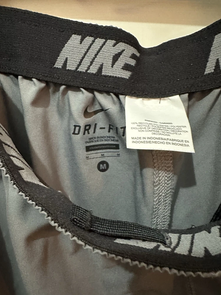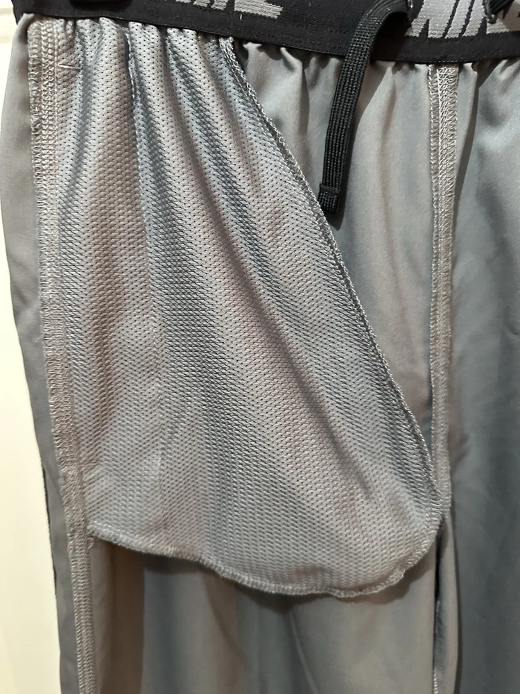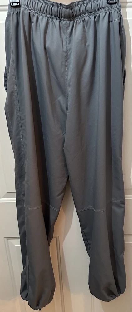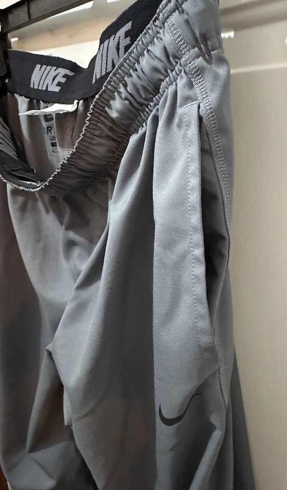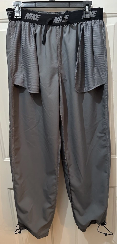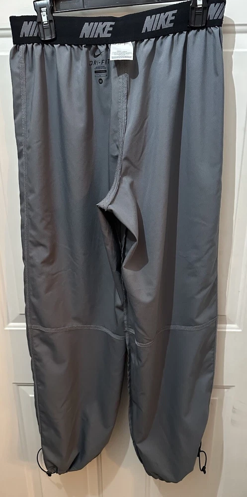 Preloved condition. These dark gray Nike Dri-Fit Windbreaker Pants in size Medium are designed for athletic wear. Made of 100% polyester blended fabric, they feature an elastic waist and pockets for convenience. With a solid pattern and Nike branding, these track pants are suitable for various activities like gym training, basketball, and running. The pants are machine washable and ideal for all seasons.