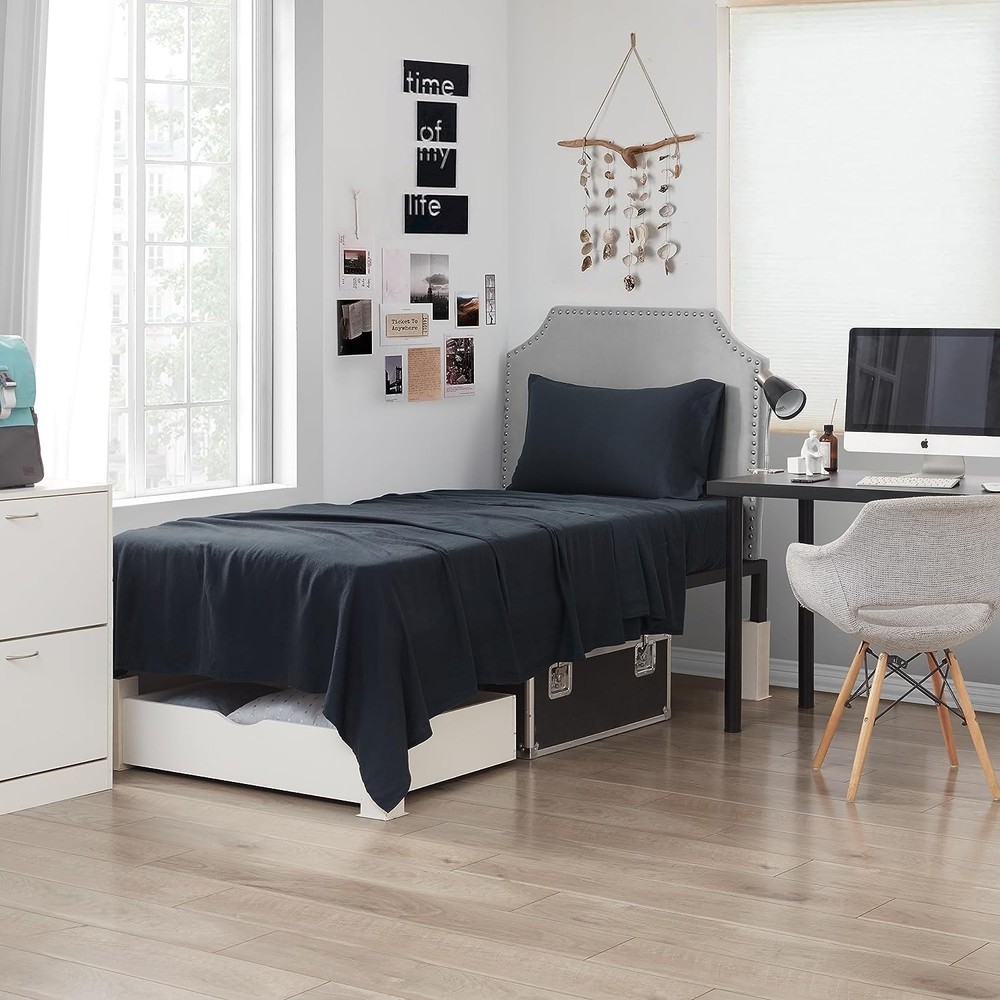 This luxurious sheet set was made in Portugal using the finest in comfortable bedding materials. The craftsmanship that goes into this European made bedding makes it an essential part of your bedroom. The soft to the touch, breathable feel of each piece of this sheet set will add a layer of comfort to your cozy bedding. With incredible style and the best in bedding materials, this extraordinary sheet set is a luxurious choice for any bedroom.Features: Material: Made of 55% Linen sourced from France and Belgium, and 45% Viscose from Bamboo sourced from India. OEKO-TEX® certified. Construction: Garment washed for a soft, breathable feel that is suitable for year-round use and ideal in warm weather. The unique blend combines the best of both materials to provide an airy and smooth, soft to Free Shipping Over $49.99* Details Dark Sky Reserve® - Bamboo Linen Sheet Set - Portugal Made - Nightfall Navy Product Description: This luxurious sheet set was made in Portugal using the finest in comfortable bedding materials. The craftsmanship that goes into this European made bedding makes it an essential part of your bedroom. The soft to the touch, breathable feel of each piece of this sheet set will add a layer of comfort to your cozy bedding. With incredible style and the best in bedding materials, this extraordinary sheet set is a luxurious choice for any bedroom. Features: MaterialMade of 55% Linen sourced from France and Belgium, and 45% Viscose from Bamboo sourced from India. OEKO-TEX® certified. ConstructionGarment washed for a soft, breathable feel that is suitable for year-round use and ideal in warm weather. The unique blend combines the best of both materials to provide an airy and smooth, soft to the touch feel. Important InformationBeautiful European sheet set designed and made in Portugal for a luxury addition to your bedding essentials. Care InstructionsMachine Washable - Gentle Cycle / Cold Wash Drift off to sleep feeling like you're being embraced by the night sky itself, thanks to our Dark Sky Reserve® - Bamboo Linen Sheet Set - Portugal Made - Nightfall Navy. Crafted from high quality Bamlin bedding materials, these sheets feature a unique blend of soft linen and silky bamboo to cover your entire bed in incredible comfort! Made from European linen treated with a special garment-dyeing technique, and enhanced with silky bamboo, this Portuguese sheet set goes above and beyond in delivering a luxurious experience beyond compare. The combination of lightweight linen and breathable bamboo creates a soothing, cooling effect, making these dark blue sheets in King, Queen, or Twin XL sizes the perfect choice for hot sleepers and warm climates. Choosing this high-end sheet set in King, Queen, or Twin XL, as part of our exclusive Dark Sky Reserve® bedding brand, means surrounding yourself with the epitome of European bedding excellence! Dimensions: Twin XL Size IncludesFitted Sheet (39" x 80" x 12"), Flat Sheet (66" x 96"), 1 Pillowcase (20" x 30") Queen Size IncludesFitted Sheet (60" x 80" x 12"), Flat Sheet (90" x 102"), 2 Pillowcases (20" x 30") King Size IncludesFitted Sheet (78" x 80" x 12"), Flat Sheet (106" x 104"), 2 Pillowcases (20" x 40")