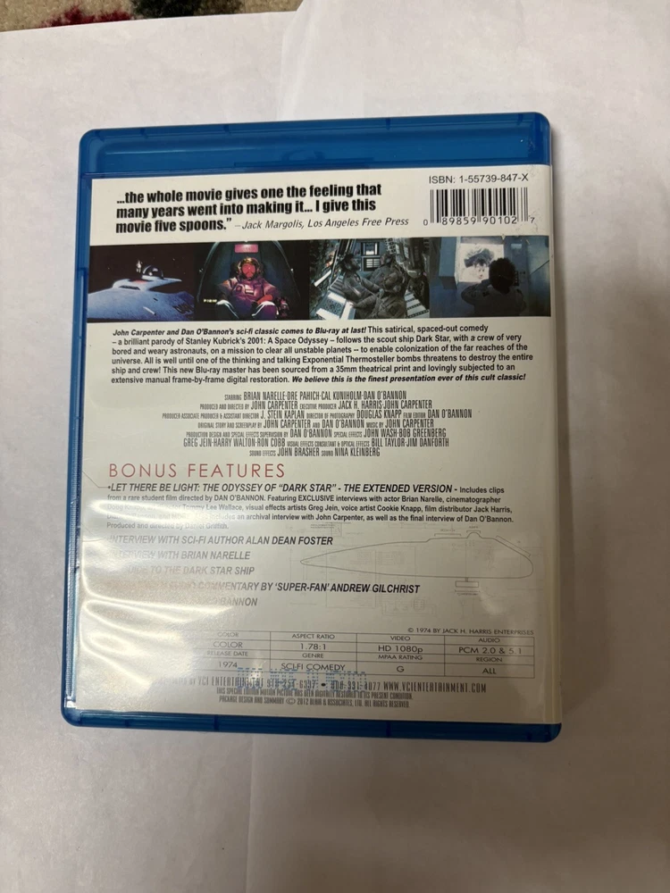 gtin13:0089859901027Sub-Genre:Comedy VideoUPC:0089859901027Run Time:83 min.Movie/TV Title:Dark Star (Hyperdrive Edition)Studio:VCI VideoGenre:Science FictionProducer:J. Stein Kaplan, Jack H. Harris, John CarpenterAspect Ratio:1.78:1Director:John CarpenterFormat:Blu-ray