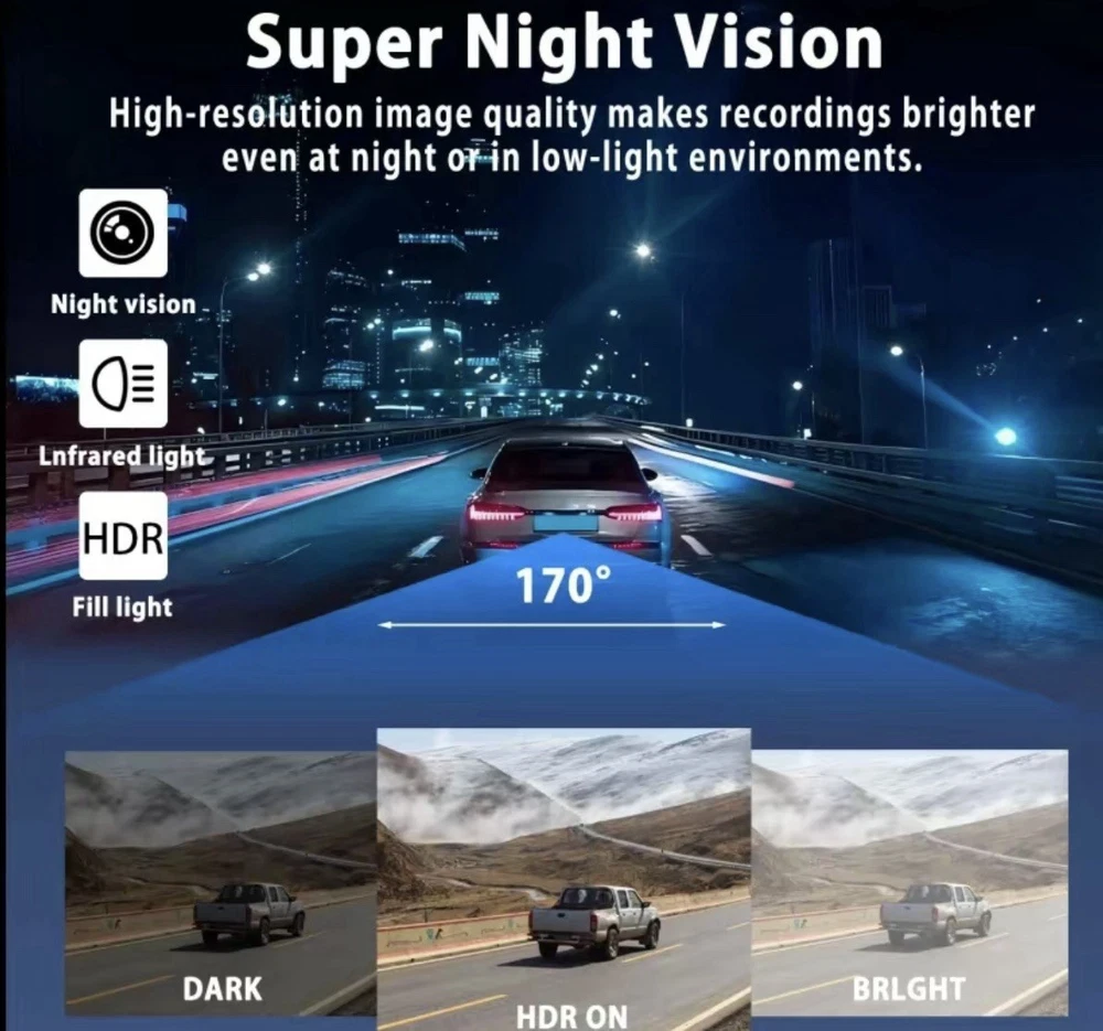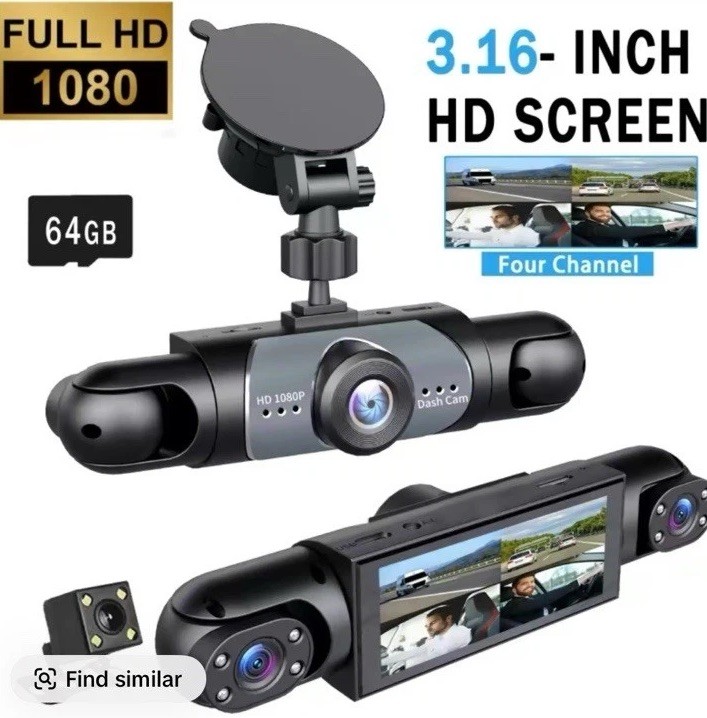 Type: Dash Camera Recording Resolution: 1080 p Screen Size: 3 in Display Size: 3" Dash Cam Loop Recording: 1min/3min/5min/off Photo Format: JPG APP: Roadcam (For IOS, Android) View angle: 170° Frames Per Second: 30 fps Manufacturer Part Number: Does Not Apply Photo Resolution: 20MP Mic: Support G-sensor: Built in Country of Origin: China Camera Connection Type: Wireless Features: Auto On/Off, date and time, Display Screen, Dual Lens, DVR, Full HD, G-sensor (motion detection) Wifi: Support Power interface: 5V 2.5A Video Format: MP4 Color: Black Video Code: H.264, MP4 Max External Memory: Max 64 GB, Class 10 or Above (Not Included) Screen Display: LCD TF card: includes 64GB TF card Number of Cameras: 4 Screen/Monitor Type: Front & Cabin & Rear camera Brand: Unbranded