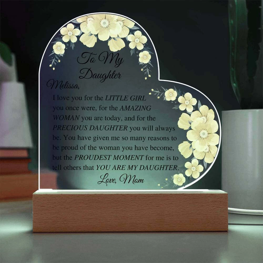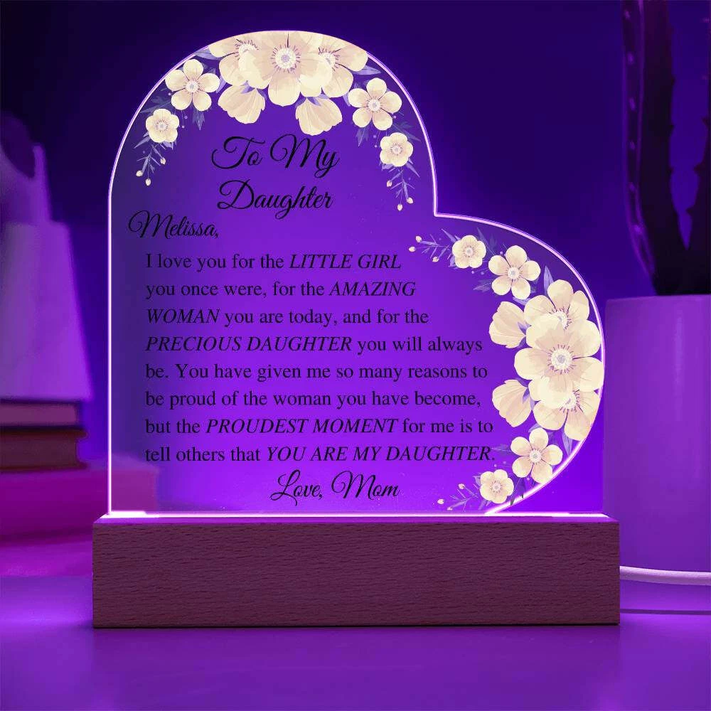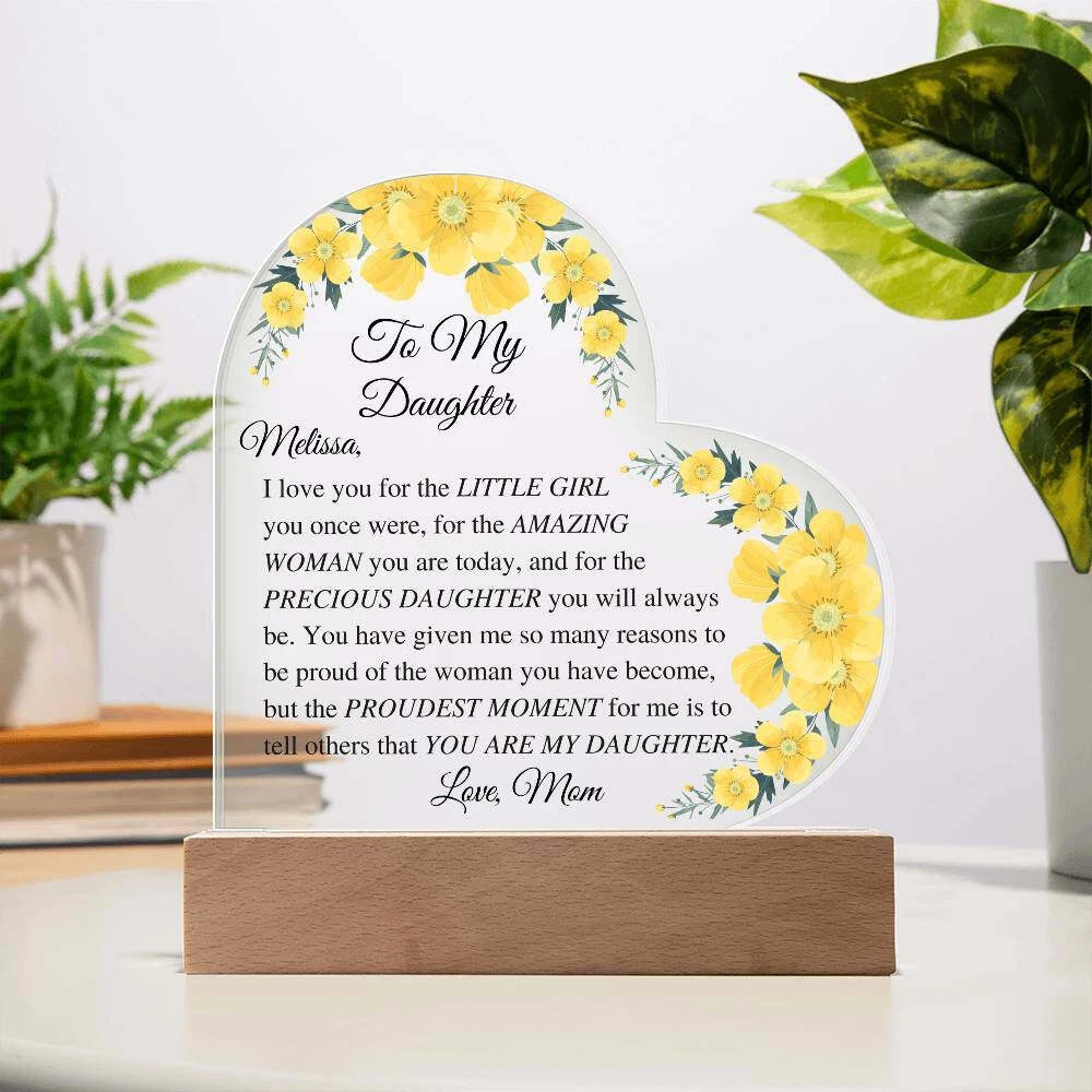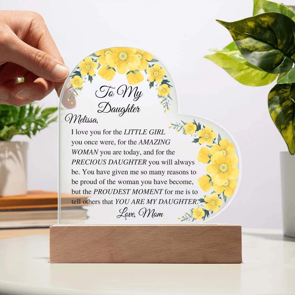 Let your daughter know how much you appreciate her with this beautiful Daughter Acrylic Heart Plaque. This sentimental gift is perfect for a wedding day from mother to bride, birthdays, Christmas, going off to college, or just because. She will be touched to tears upon receiving this heartfelt gift. Add warmth and love to any room with our Printed Heart Acrylic Plaque. Handcrafted with premium acrylic and a vibrant printed design, this sign is a beautiful addition to any home or a meaningful gift for someone special. Show your love and appreciation for your partner, family members, or dear friends on anniversaries, birthdays, or any occasion with this unforgettable gift. Our plaque is made with high quality materials and features a professionally printed design. The sleek wooden base adds an elegant touch, but you can upgrade to the wooden LED base with a USB plug-in for an even more impressive presentation. Product specifications: - Premium acrylic material - Size with wooden base: 6.4" (162mm) height x 5.3" (135mm) width - Acrylic depth: 0.1" (5mm) - Base size: 1.2" (30mm) height x 5.9" (150mm) width x 1.8" (45mm) depth - Sharp and detailed printed design Each order is thoughtfully packaged and ready to be treasured for a lifetime! This Daughter Acrylic Heart Plaque is a meaningful way to express your love and affection. Avoid using exaggerated language and sales tactics. Instead, use sensory language to describe the features of this product. Incorporate relevant keywords in a natural way, without simply listing them. Preserve the original tone and voice of this listing description while providing important information for buyers. Trademarks and patents will be respected. Only one product description is needed.