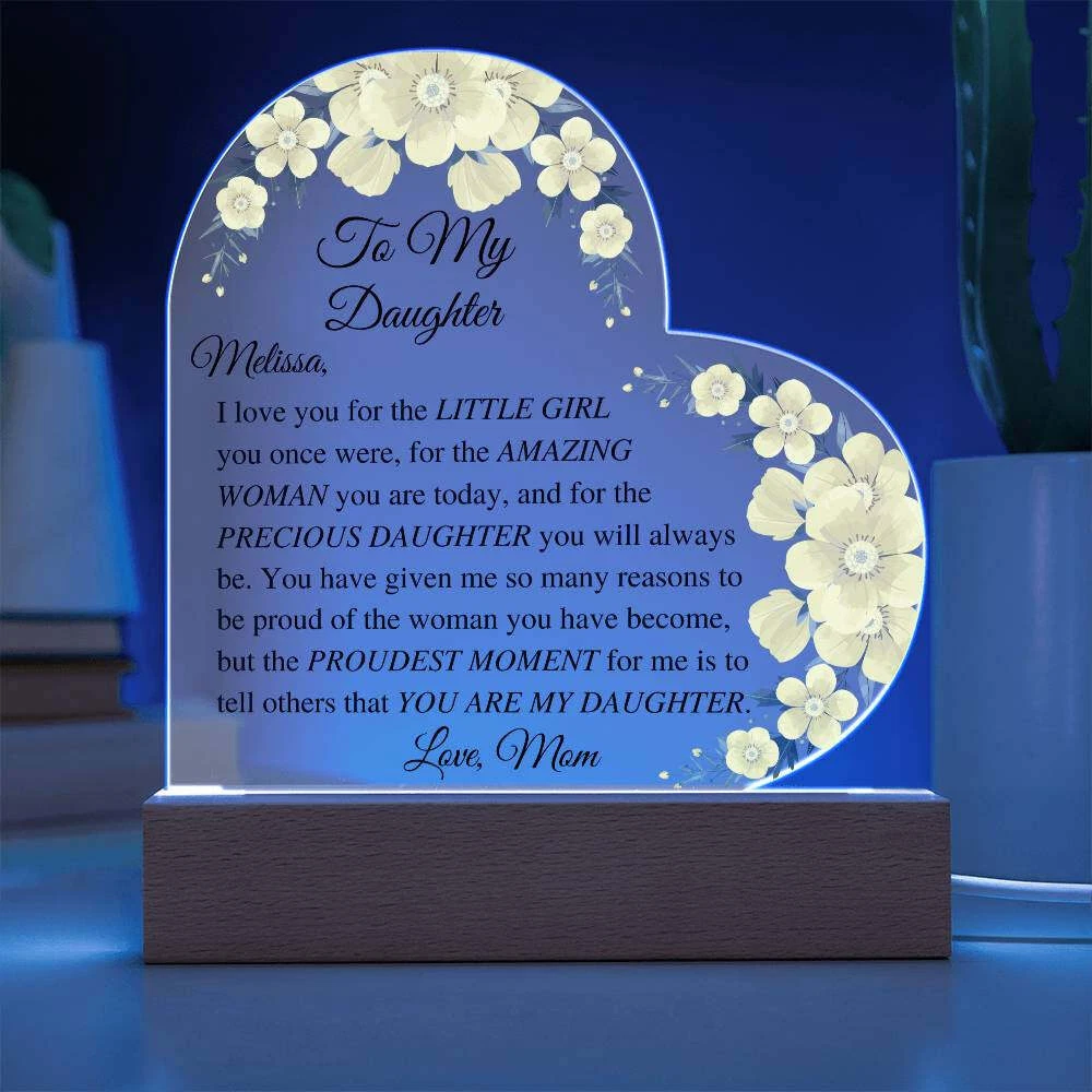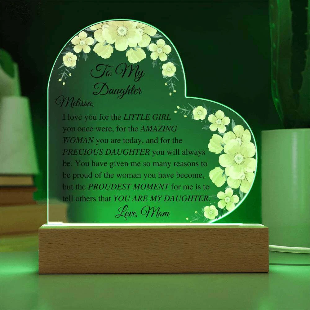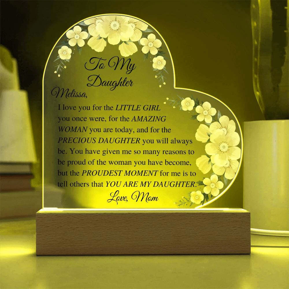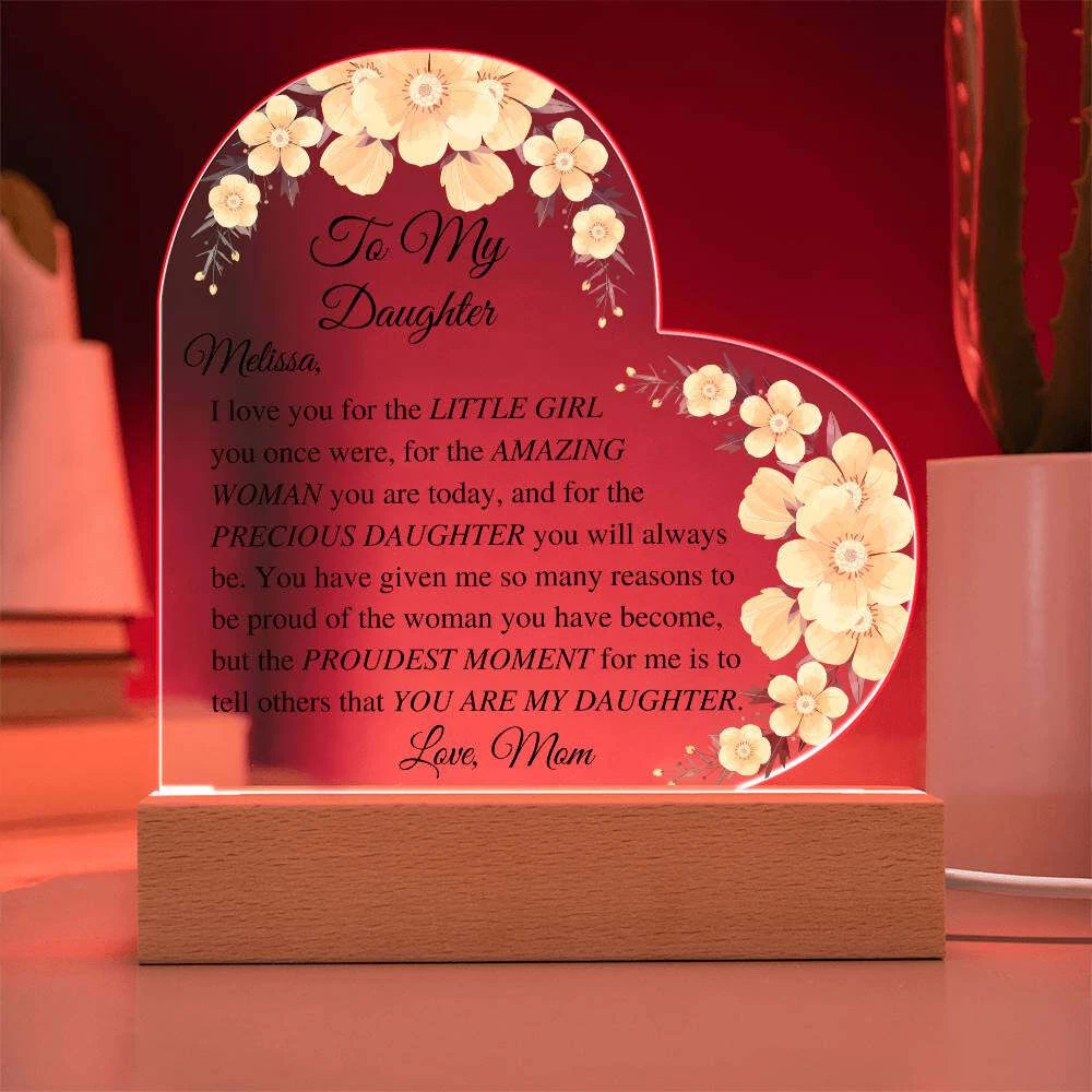 Let your daughter know how much you appreciate her with this beautiful Daughter Acrylic Heart Plaque. This sentimental gift is perfect for a wedding day from mother to bride, birthdays, Christmas, going off to college, or just because. She will be touched to tears upon receiving this heartfelt gift. Add warmth and love to any room with our Printed Heart Acrylic Plaque. Handcrafted with premium acrylic and a vibrant printed design, this sign is a beautiful addition to any home or a meaningful gift for someone special. Show your love and appreciation for your partner, family members, or dear friends on anniversaries, birthdays, or any occasion with this unforgettable gift. Our plaque is made with high quality materials and features a professionally printed design. The sleek wooden base adds an elegant touch, but you can upgrade to the wooden LED base with a USB plug-in for an even more impressive presentation. Product specifications: - Premium acrylic material - Size with wooden base: 6.4" (162mm) height x 5.3" (135mm) width - Acrylic depth: 0.1" (5mm) - Base size: 1.2" (30mm) height x 5.9" (150mm) width x 1.8" (45mm) depth - Sharp and detailed printed design Each order is thoughtfully packaged and ready to be treasured for a lifetime! This Daughter Acrylic Heart Plaque is a meaningful way to express your love and affection. Avoid using exaggerated language and sales tactics. Instead, use sensory language to describe the features of this product. Incorporate relevant keywords in a natural way, without simply listing them. Preserve the original tone and voice of this listing description while providing important information for buyers. Trademarks and patents will be respected. Only one product description is needed.