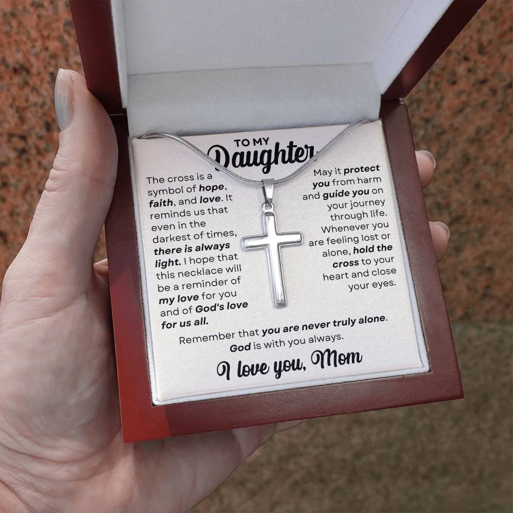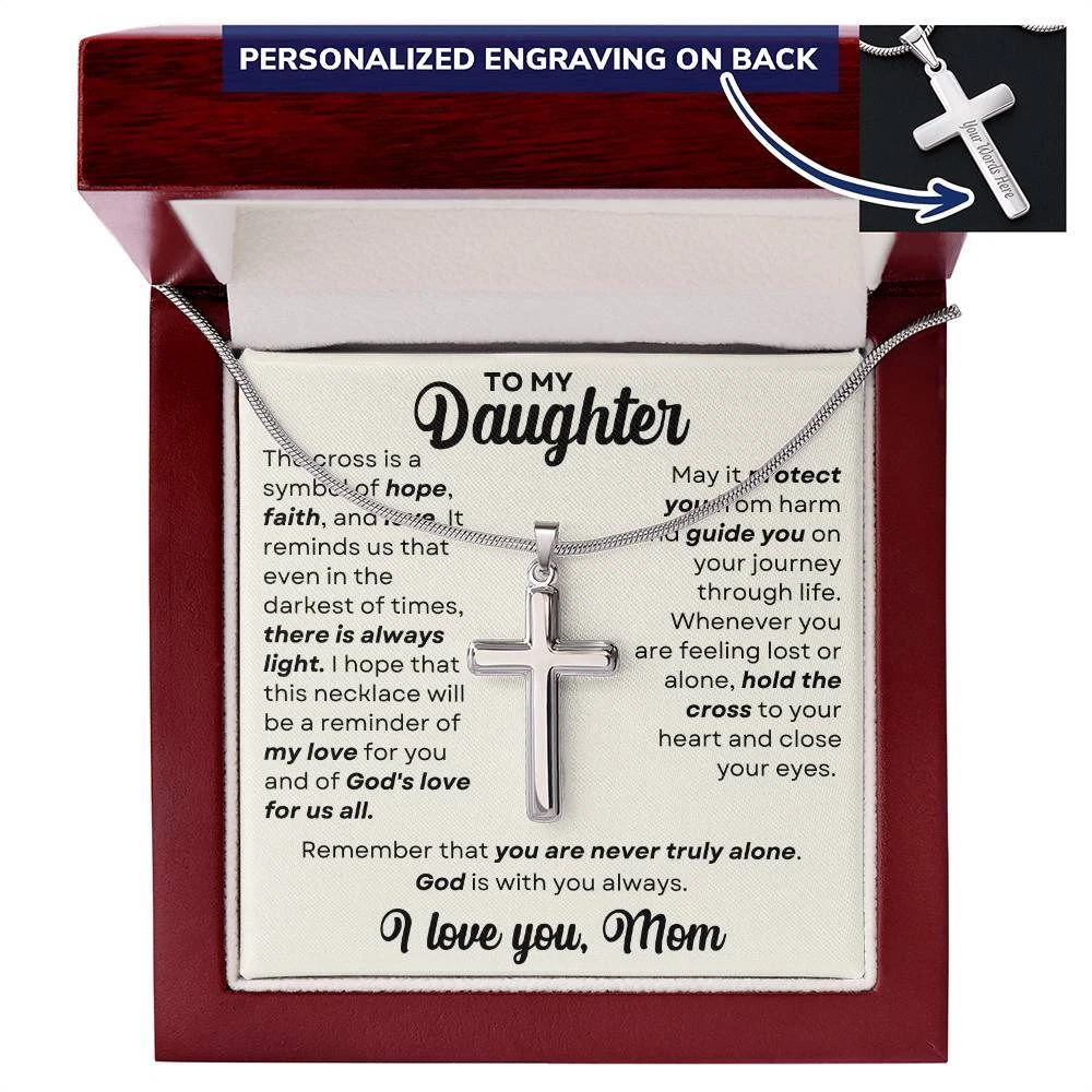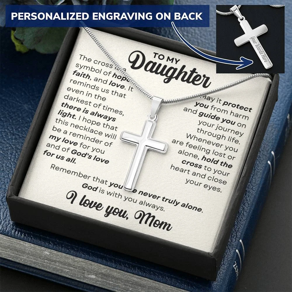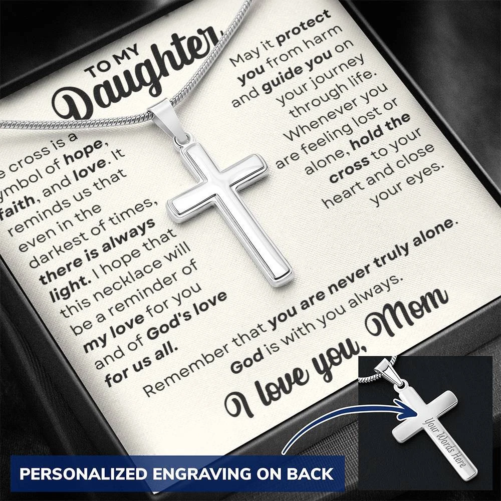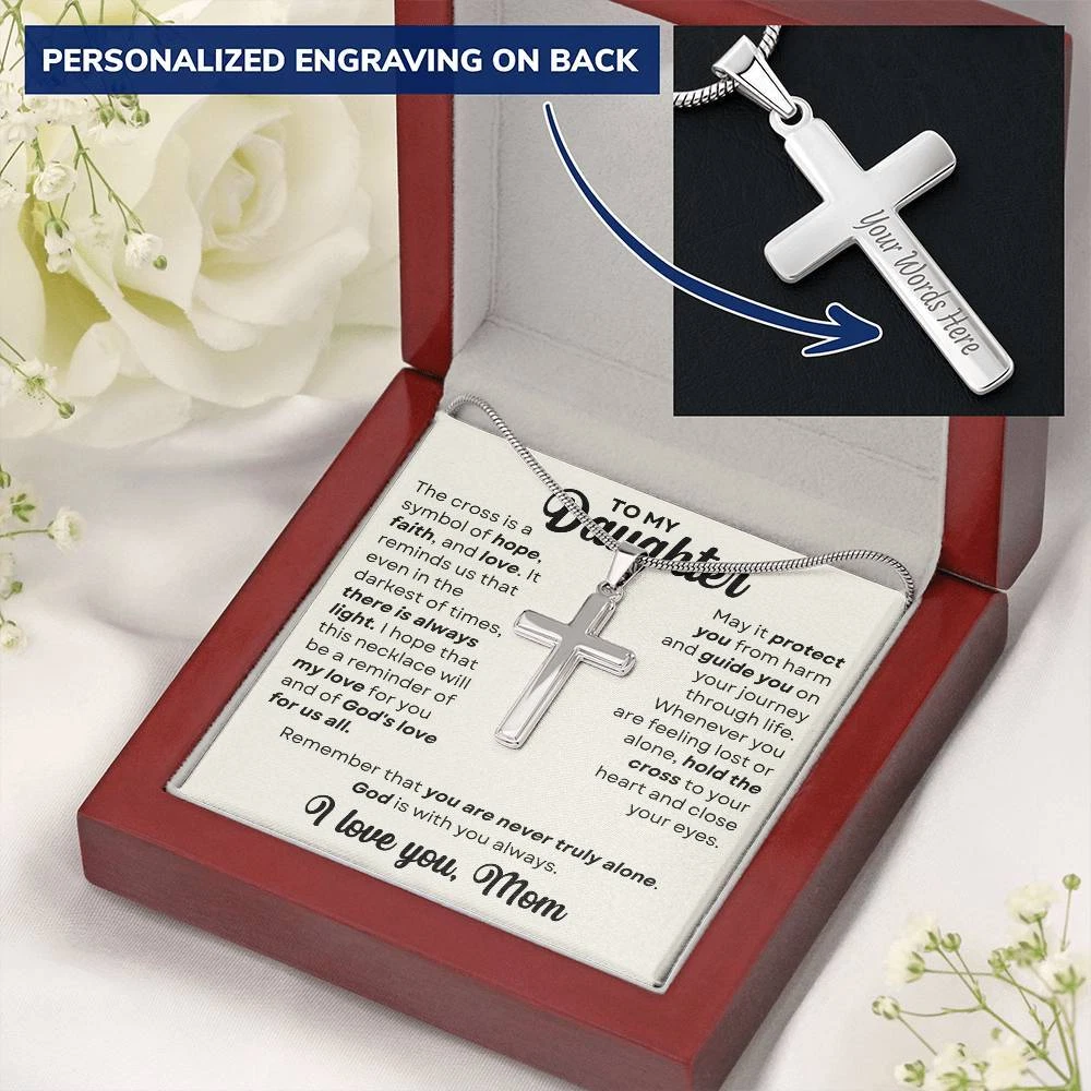 The cross is symbol of faith, hope, and love. .. Remember that you are never truly alone. God is always with you. I love you, Mom Wear your faith proudly with this Personalized Cross Necklace . Perfect for special occasions or everyday wear, our Personalized Cross Necklace is a wonderful gift idea for you or your loved one. The gorgeous pendant can be further personalized on the back with a name, date, or short message, up to 20 characters. This is a gift that will surely be treasured for years to come! Sizing is appropriate for all ages, and tasteful for both men and women. Crafted in high polished stainless steel, this piece will resist tarnishing and is hypoallergenic for sensitive skin. Includes a luxury adjustable snake chain (18" - 22") and attaches with an easy to use lobster clasp. Cross Necklace Details • Polished stainless steel • Pendant height: 1.3" (33.5mm) • Pendant width: 0.8" (19mm) • Adjustable snake chain (18" - 22") • Lobster clasp closure