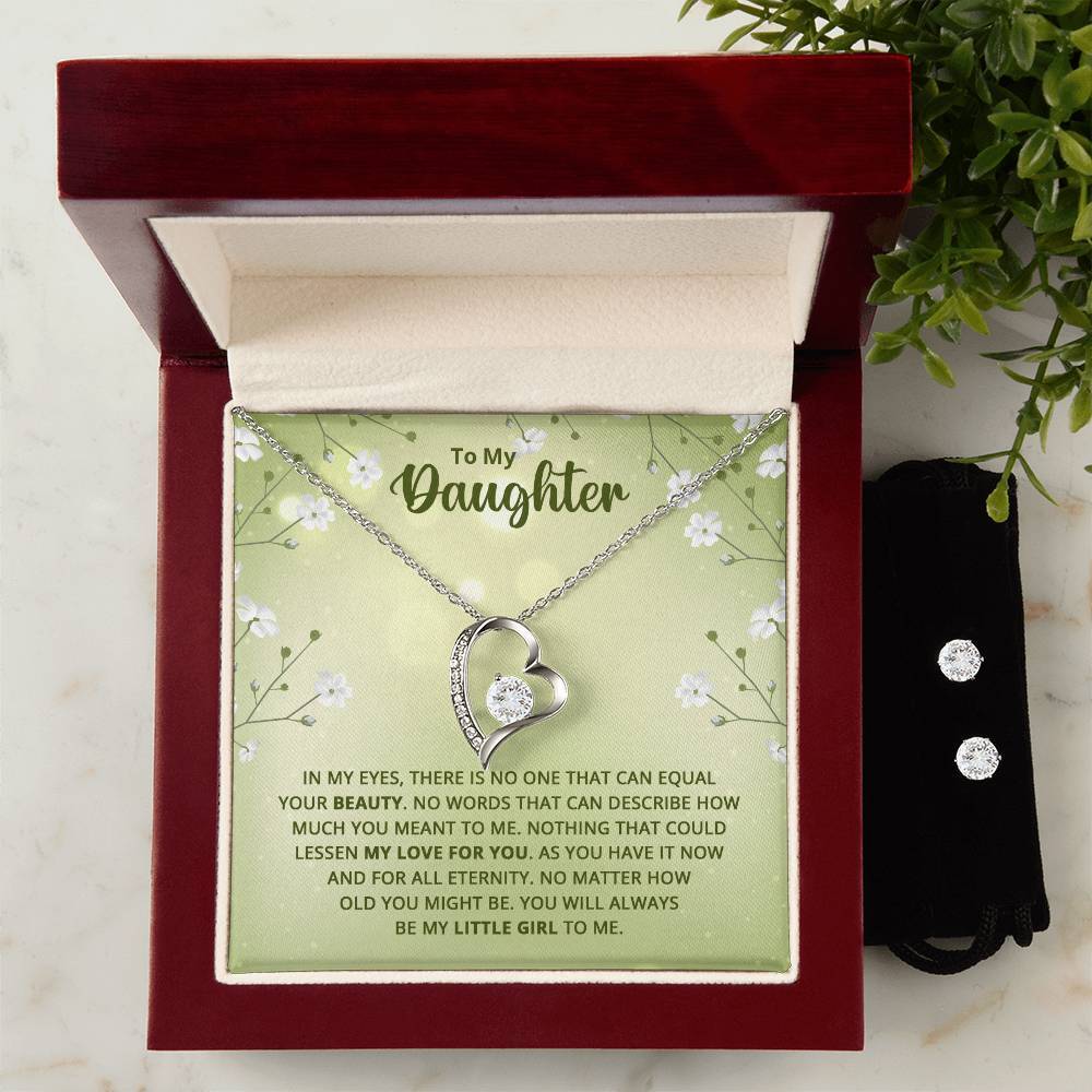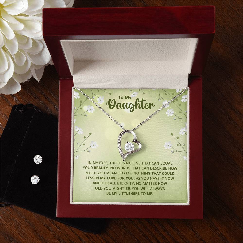 Give your loved one a gift that will make their heart swell! The Forever Love Necklace and Cubic Zirconia Earring Set is sure to do the trick. This necklace and earring pairing provides dazzling sparkle when worn together or separately, and is perfect for any occasion! Do not miss out on this special offering! Necklace Specifications 14k white gold finish 6.5mm round cut cubic zirconia crystal 0.8" (2.2cm) / 0.7" (1.8cm) Adjustable cable chain: 16" - 22" Lobster clasp attachment Earring Specifications 14k white gold finish 6mm round cut cubic zirconia crystals Post style backing Your piece is lovingly packaged in a complimentary soft touch box for easy gifting. Elevate your presentation by upgrading to the mahogany style luxury box, which features a brilliant LED spotlight.