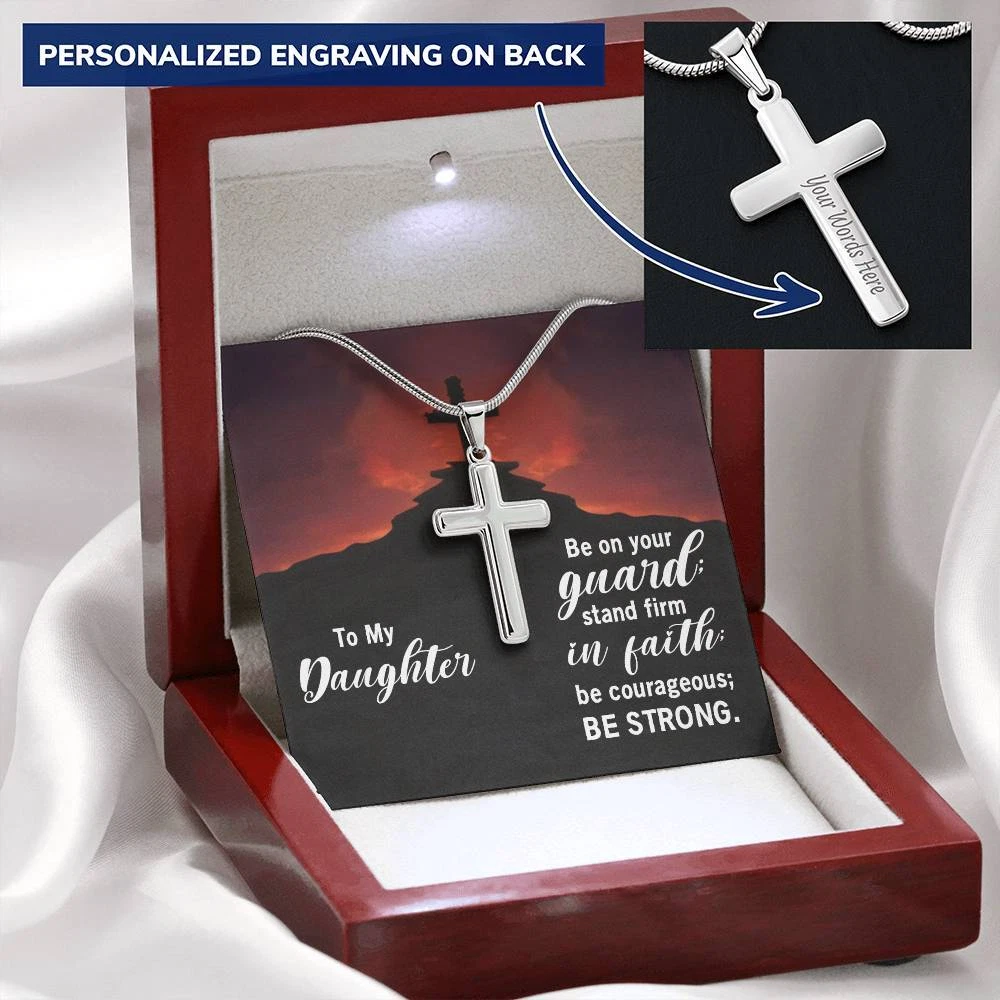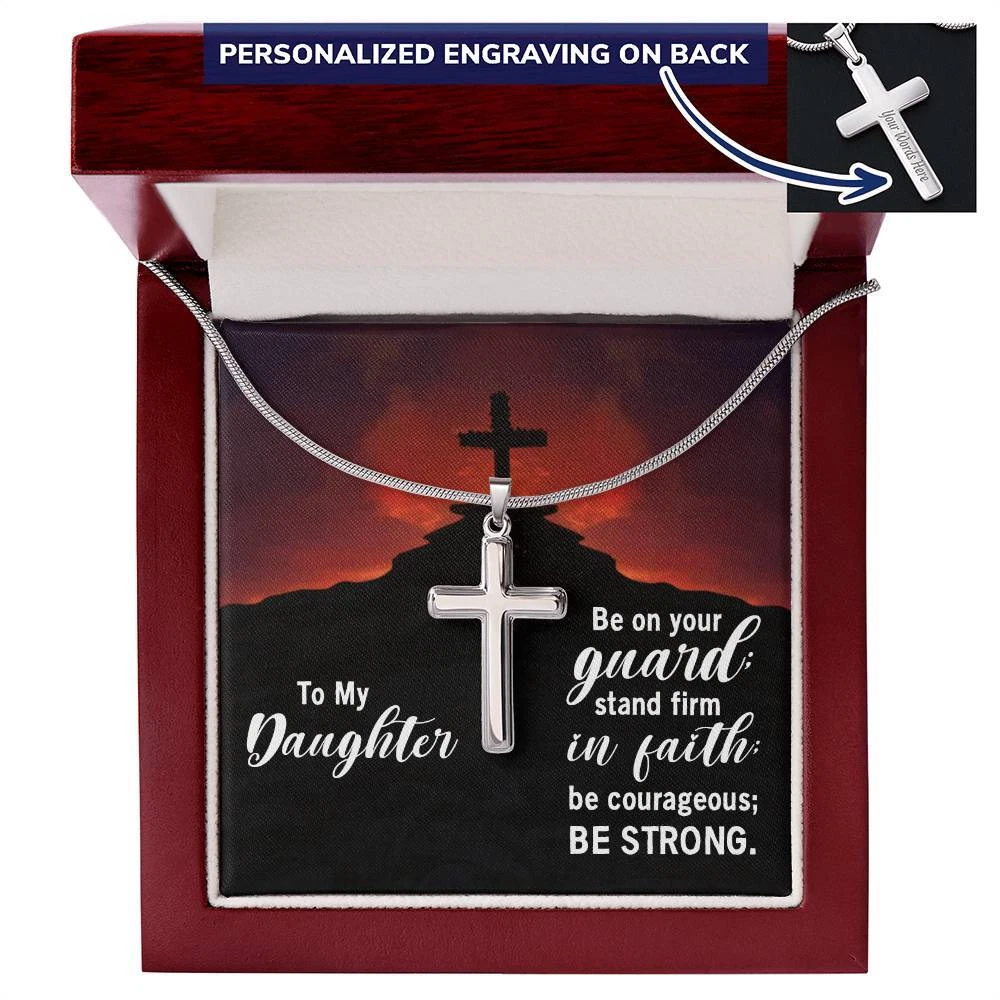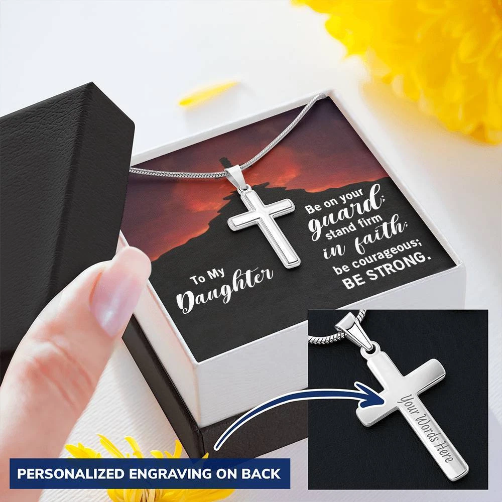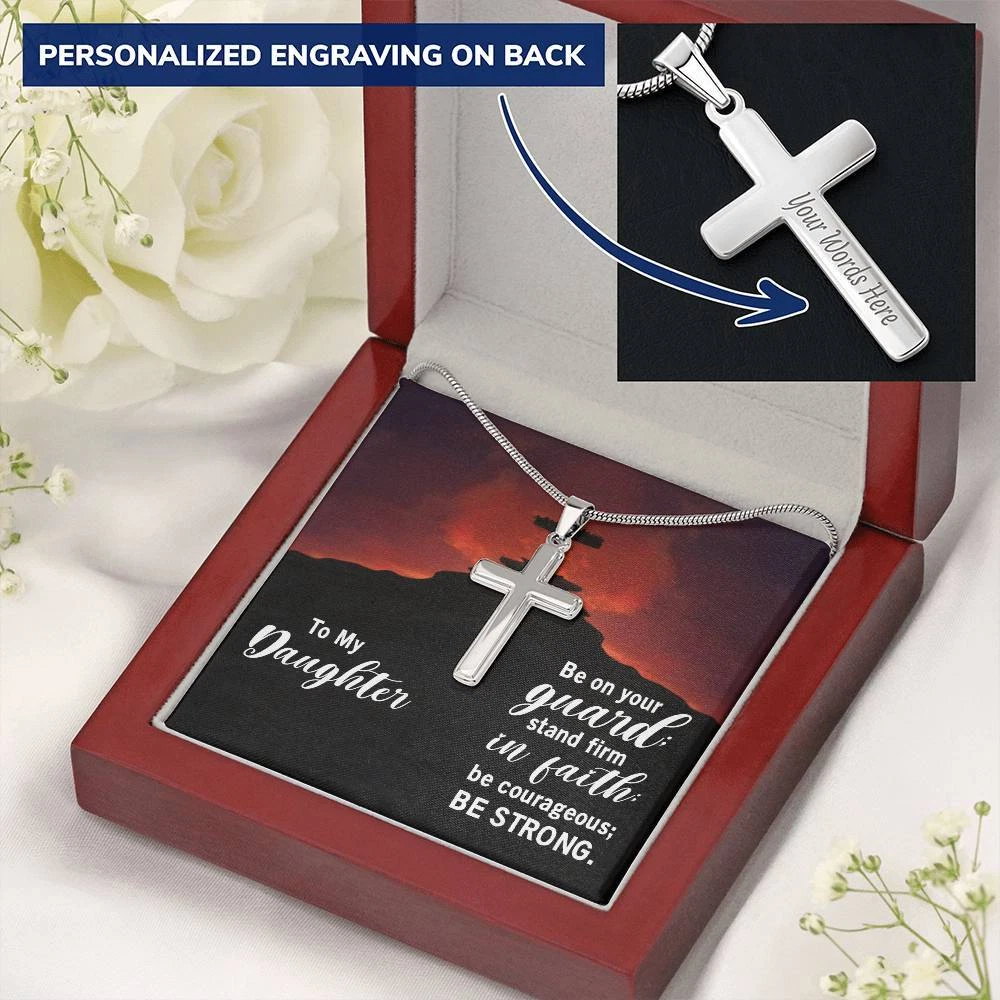 Wear your faith proudly with this Personalized Cross Necklace . Perfect for special occasions or everyday wear, our Personalized Cross Necklace is a wonderful gift idea for you or your loved one. The gorgeous pendant can be further personalized on the back with a name, date, or short message, up to 20 characters. This is a gift that will surely be treasured for years to come! Sizing is appropriate for all ages, and tasteful for both men and women. Crafted in high polished stainless steel, this piece will resist tarnishing and is hypoallergenic for sensitive skin. Includes a luxury adjustable snake chain (18" - 22") and attaches with an easy to use lobster clasp. Cross Necklace Details • Polished stainless steel • Pendant height: 1.3" (33.5mm) • Pendant width: 0.8" (19mm) • Adjustable snake chain (18" - 22") • Lobster clasp closure