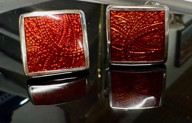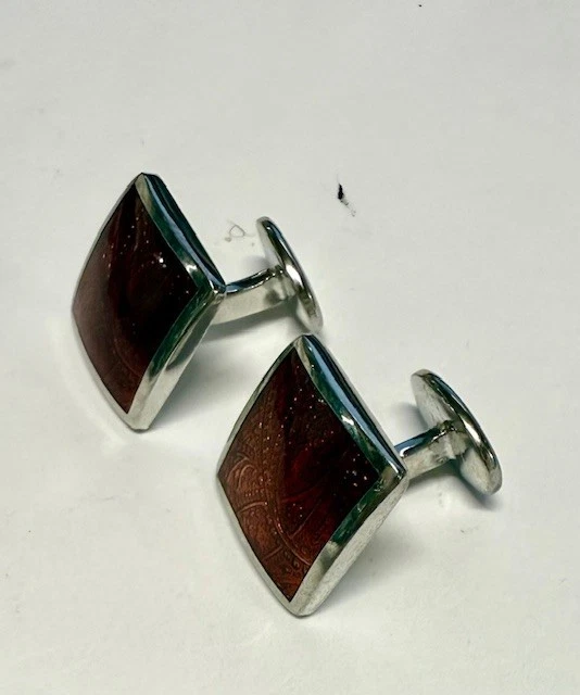 These David Donahue Cufflinks are elegant pieces made of 925 sterling silver featuring a square design shape. The Center of the Cufflinks are Enamel - we believe Guilloche Enamel, with a unique paisley pattern in a beautiful Orange-Rust Color. The cufflinks are suitable for various occasions including engagements, weddings, anniversaries, birthdays, and more. With Christmas and The Holidays just weeks away- they make a great gift or present for yourself. These marked DD Cufflinks are a stylish accessory for men and are signed by the brand, David Donahue, making them a thoughtful and sophisticated gift option. They are in very good condition even though pre-owned. Normal Wear. No Abuse. These cufflinks are a timeless and classy addition to any man's jewelry collection. The color of the enamel changes with more or less light. Please see all photos. 18.7 g, approx 5/8" square. The cufflinks come in a free gift box (not the original box). Local Collection is available in Boca Raton, Florida. Free USA Shipping.