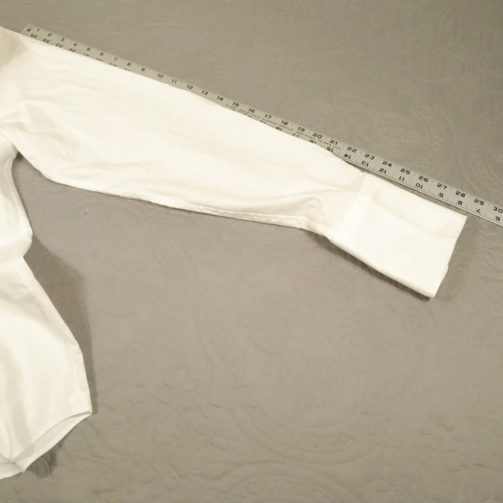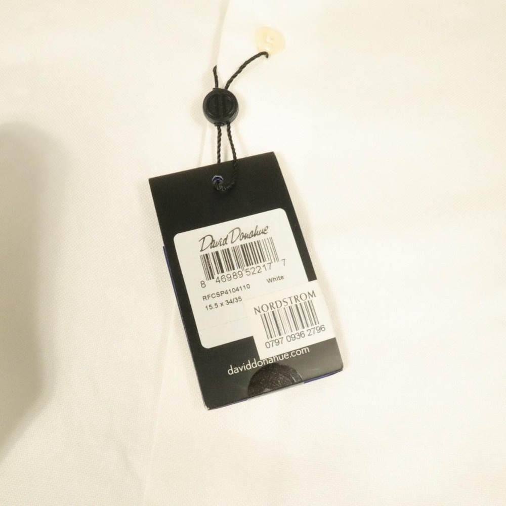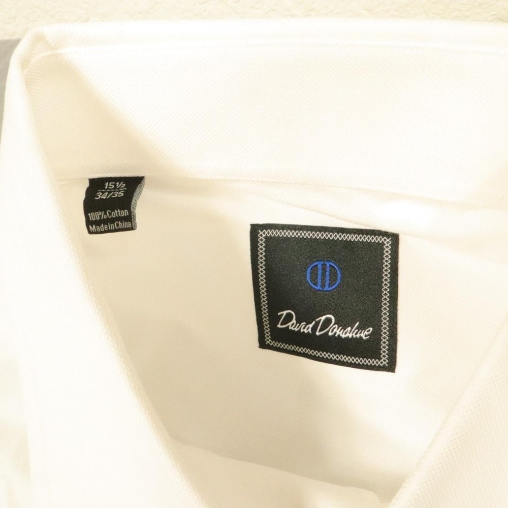 Brand: David Donahue Style: Mens long sleeve dress shirt with button front closure, point collar, and barrel cuffs. Color: Solid white. Size on tag: Mens 15.5 neck, 34/35 sleeve. Material: 100% cotton. Some dirt around shoulders and collar, also some at crease of end of sleeve. PLease see all pictures. May wash out.