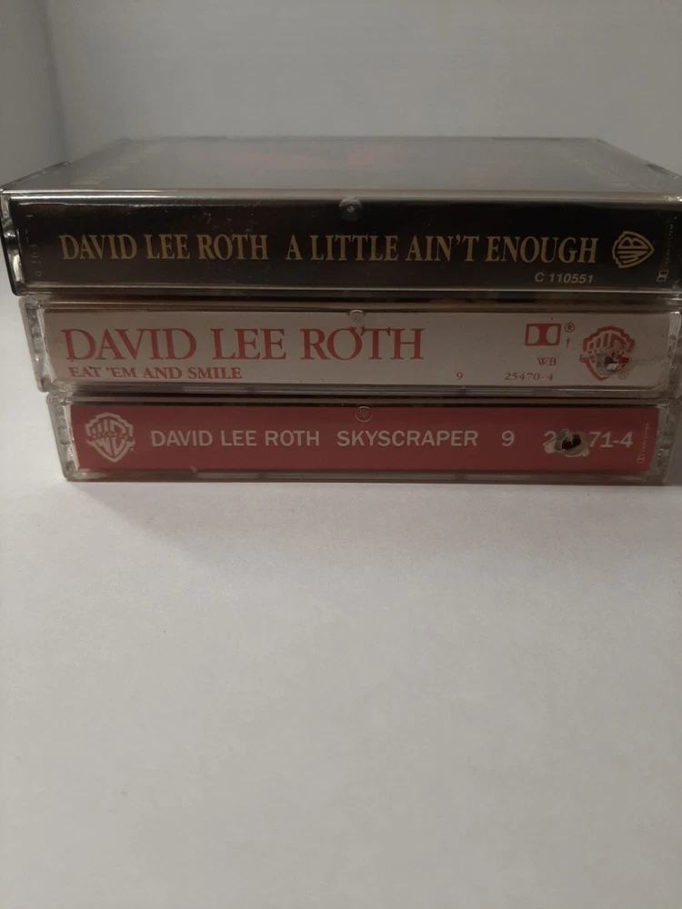 David Lee Roth Lot Of 3 Cassette Tapes A Little Ain't Nothing Skyscraper & Eat'em & Smile In good pre-owned condition may show signs of wear from use/handling/storage/display. Please view all pics for condition/details/flaws/issues. SOLD AS IS There are marks/spots/dirt/debris please see photos 1-10, there may be paint loss/sticker loss please see photos 1-10, there is lite discoloration please see photos 1-10, there are surface scratches to item please see photos 1-10, please see all photos for condition/issues/details.