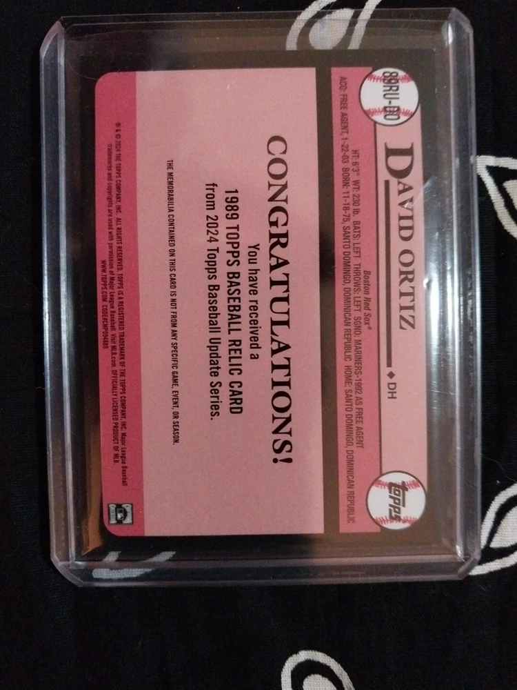 This is a rare and valuable David Ortiz 2024 Topps Update 1989 Topps Insert Game Used Relic #89RU-DO PAPI trading card. It features the Boston Red Sox legend in his baseball uniform and is a must-have for any avid collector. The card is a limited edition parallel variety and also includes a game-worn relic, making it a unique and special addition to any collection. The card is manufactured by Topps and is part of the Major League Baseball (MLB) league. It is a sports trading card and is a single card from the 2024 Topps Update Series. The card number is 89RU-DO and it is an insert card from the 1989 Topps Baseball Relics set. The season is 2024 and the card is a memorabilia item, making it a great gift for any sports fan.
