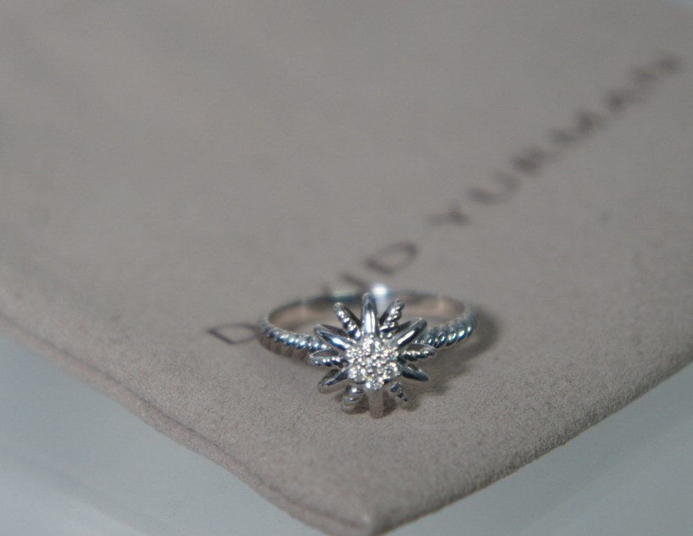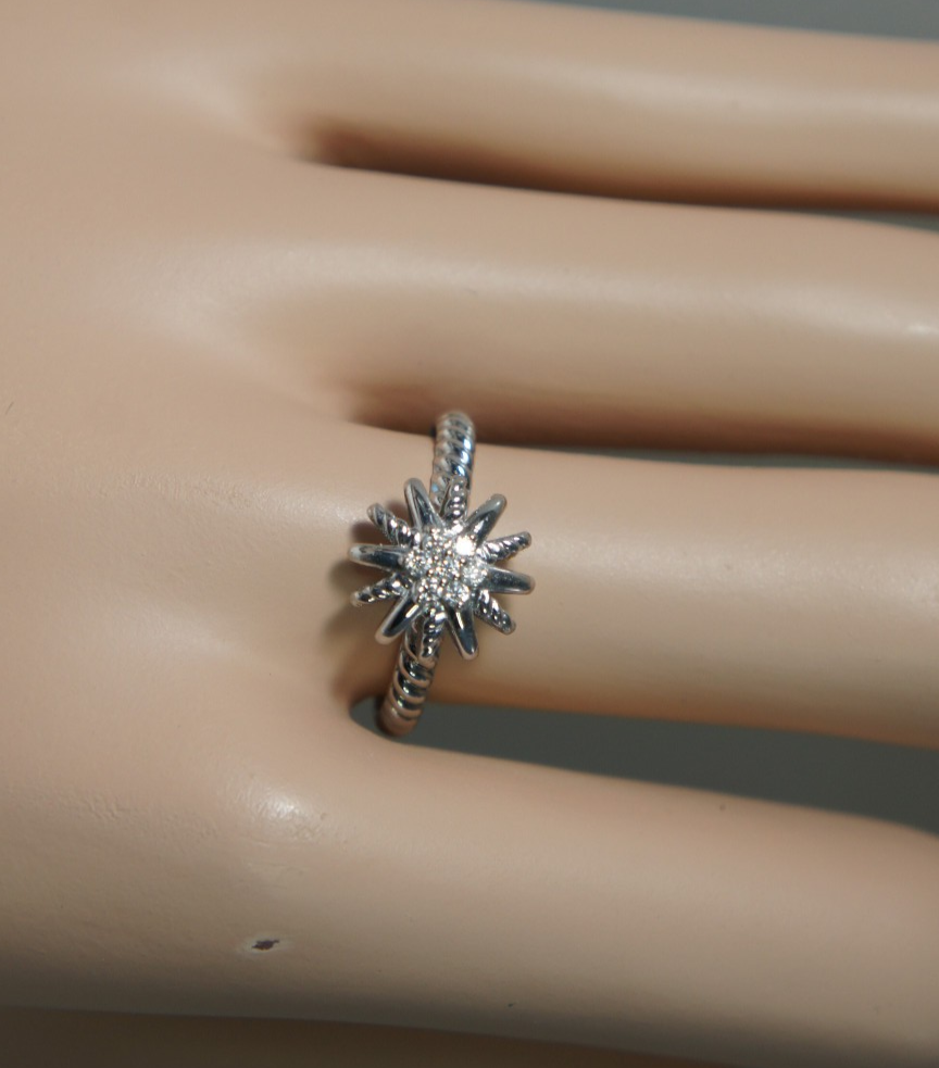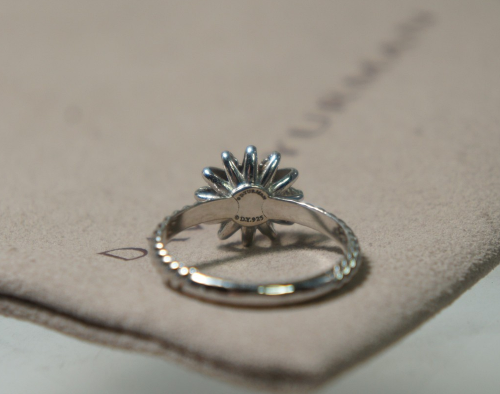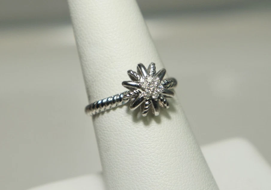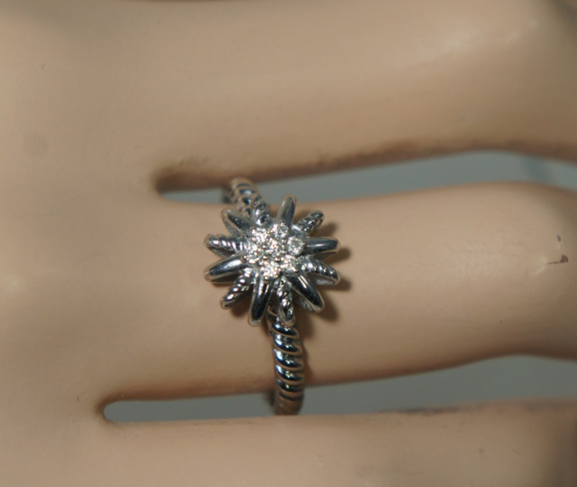 David Yurman Petite Starburst Ring. 925 Sterling silver. The "Star" measures 10mm across. 7 Diamonds, clustered in the center. Size 7 Weighs 2 grams. FREE domestic shipping International shipping through ebay shipping ONLY All of my jewelry listings were purchased pre owned. I am listing them as they were represented to me, when I purchased/received them. I am NOT an expert, nor do I represent the maker of the jewelry. I am capable of making an honest mistake. IF for ANY reason you are not 100% satisified with your purchase, I will send you a pre paid return label, and refund your payment in full through PayPal. Please contact me right away with any concerns. I appreciate the courtesy of YOU giving me the opportunity to resolve the problem BEFORE leaving negative feedback. Leaving poor feedback does not resolve anything. Please email any questions, you will receive an answer promptly! Customer service and satisfaction is my #1 Priority!