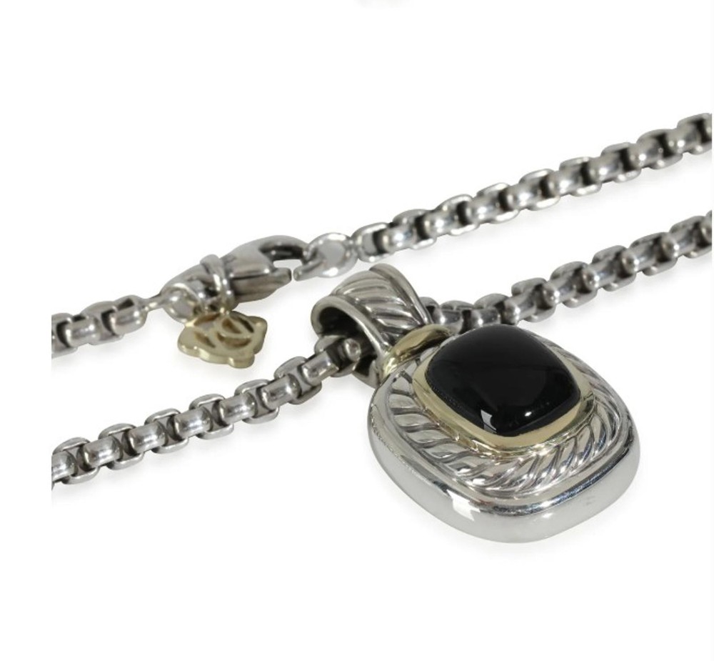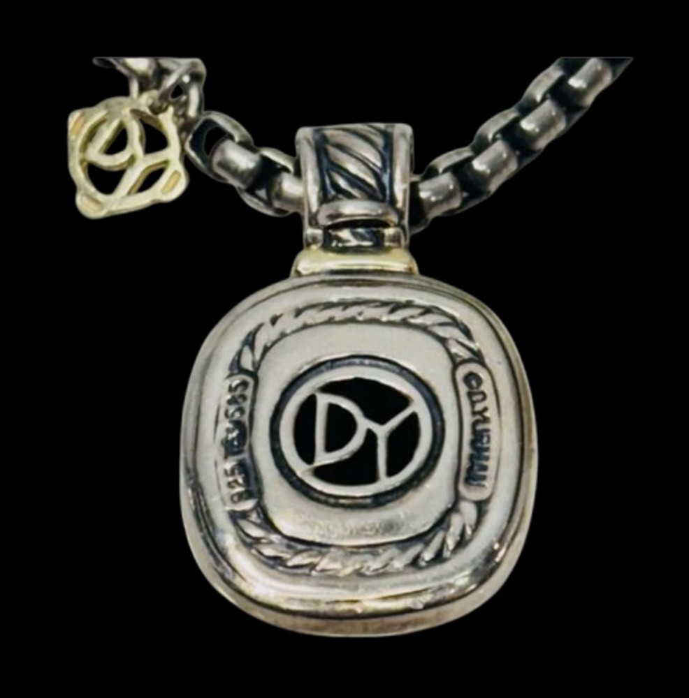 Elegant and timeless, this authentic David Yurman necklace features the brand’s iconic cable design in sterling silver, paired with a striking black onyx pendant. The square cushion-shaped pendant is framed with Yurman’s signature twisted cable detailing, creating a bold yet sophisticated look. The rich black onyx centerpiece adds depth and contrast, making this piece perfect for both everyday wear and evening styling. The lobster clasp closure ensures secure wear, while the classic design makes it a versatile addition to any fine jewelry collection. A refined statement piece that embodies modern luxury and enduring craftsmanship. Details • Designer: David Yurman • Metal: Sterling Silver / 14K Gold • Stone: Black Onyx • Signature cable design • Lobster clasp closure • Weight 37 grams • Necklace Length: 16" • Pendant: 1.25" x 0.75" • Timeless, versatile style • MSRP $1,150 Keywords David Yurman necklace, David Yurman cable necklace, David Yurman onyx pendant, sterling silver designer necklace, black onyx pendant necklace, luxury silver jewelry, designer jewelry women, Yurman cable pendant, authentic David Yurman, fine jewelry gift, statement silver necklace