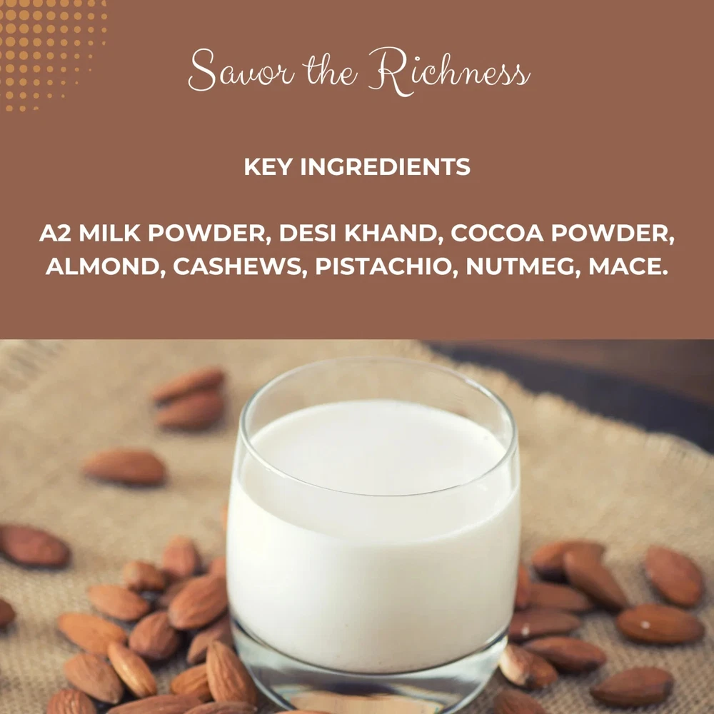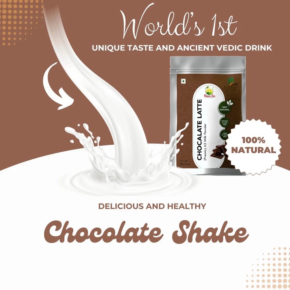 Chocolate Shake Premix 50 gm | Made from Dawnlees Chocolate Latte, Desi Khand, A2 Milk Powder | Authentic Unique Taste and Ancient Vedic Formula “Combining the rich, indulgent flavors of premium cocoa with the mamra almonds, our chocolate shake offers a luxurious treat that you can enjoy anytime, anywhere.” 100% Natural. Create a cool, refreshing drink. Authentic and Traditional India’s best Instant Chocolate Shake Premix. Enjoy a delicious and comforting chocolate shake in minutes. Use of Desi Khand instead of White Refined Sugar No Permittable Food Colors, No Preservatives and No Chemicals PACKAGE INCLUDES- 1 qty Chocolate Shake Premix 50 Gram Safely packed in Pouch Indian Chocolate Shake Premix Combining the rich, indulgent flavors of premium cocoa with the mamra almonds, our chocolate shake offers a luxurious treat that you can enjoy anytime, anywhere. INGREDIENTS- Made with 100% Natural Ingredients A2 Milk Powder, Desi Khand, Cocoa Powder, Almond, Cashews, Pistachio, Nutmeg, Mace. HOW TO USE- Easy to use Step-1 Mix around 2 tablespoon of premix in 150 ml of boiled water Step-2 Stir well and it is ready to consume. TRADITIONAL DRINK- Treat yourself to the ultimate chocolate indulgence with our ChocoBliss Chocolate Shake. Whether you’re starting your day on a sweet note, taking a break, or enjoying a cozy evening at home, our premix is the perfect companion for all your chocolate-loving moments. HYDRATED DRINKS- -Instant Refreshing And Energy All-Ages Suitability Refined Sugar-free, suitable for all age groups.
