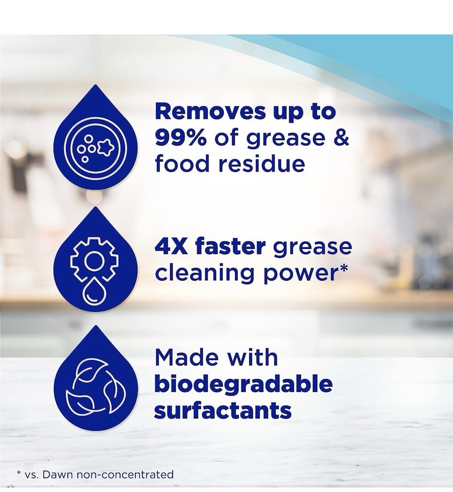 Dawn Platinum Dishwashing Liquid Dish Soap, Dish Soap Liquid, Dish Detergent Liquid, Fresh Rain Scent, 32.7 fl oz Brand Dawn Item Form Gel Scent Rain Specific Uses For Product Dish Set Material Feature Scented Item Volume 54.8 Fluid Ounces 1. POWERFUL CLEANING: Dawn Ultra's powerful formula helps you get through more dishes with less dishwashing liquid (*vs. Dawn Non-Concentrated), making it a powerful dish soap liquid 2. GREASE AND RESIDUE FIGHTING: Dawn platinum's improved dish detergent liquid formula easily fights 99% of grease and food residues *vs. Dawn Non-Concentrated 3. VERSATILE USE: Dawn platinum dishwashing liquid can even be used to clean items beyond the kitchen sink. Use this dish soap to fight grease and grime from tire rims and the outer shroud of a gas grill