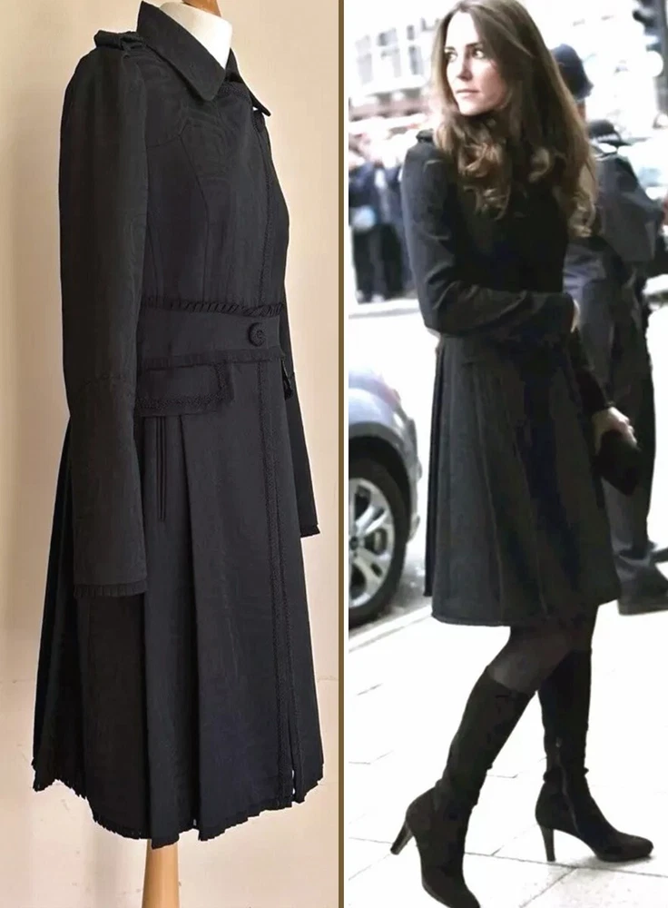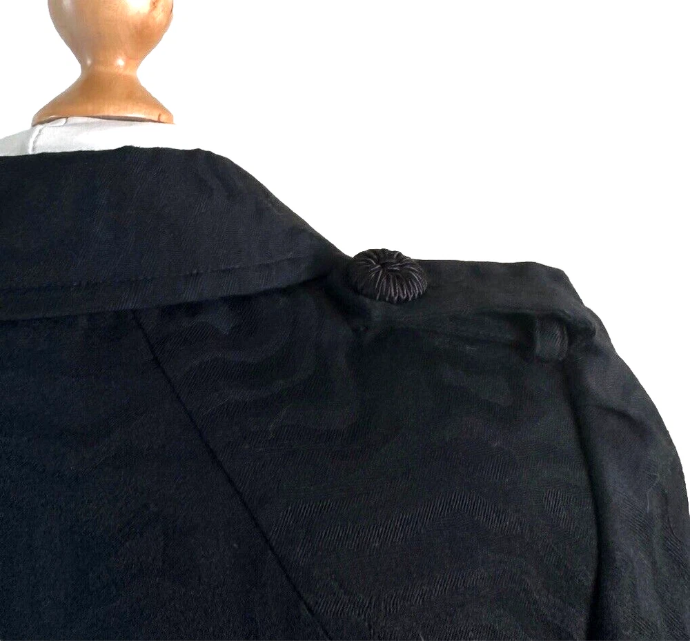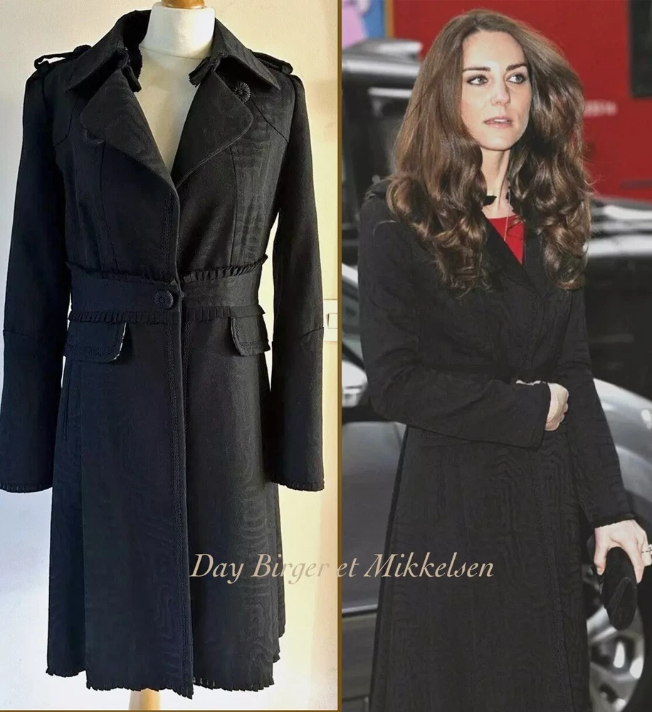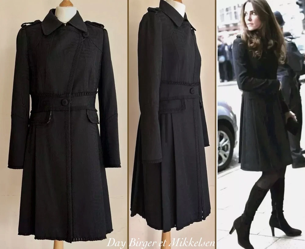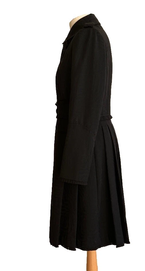 Day Birger et Mikkelsen black brocade embellished pleated coat dress. This is an absolutely gorgeous piece by Danish designer Day Birger et Mikkelsen which is really hard to find. It probably dates from around the early to mid 2000s. There are so many lovely details on it with passementerie braiding trims and buttons, A pleated skirt section. An asymmetric button fastening so coat can be worn buttoned up with a high collar or can be worn open with collars. A pretty waist band seam section with fine pleated ribbon edging finished with an internal concealed press popper fastening and a passementerie style button on the outer. A fine brocade finish patterned fabric believed to be wool mix . Fine pleated ribbon trims at cuffs, hems, waist band section. A swirling print to the satin lining with fine pleated ribbon trim inside.Two mock flap pockets with satin lining on reverse. Two slant side pockets concealed at sides of pleats. Size: To best fit a size small or a UK8 to 10/US4-6 approximately. Quite a fitted waist band seam design. Measurements can be provided. Excellent vintage condition. Day Birger et Mikkelsen brand labels in neckline and at side. No marks stains or damage apparent. It’s in really great shape for its age. It is absolutely beautiful. No returns. Courier shipping.International buyers please check whether customs entry charges will apply in your country at the point of delivery. Please see my other items.