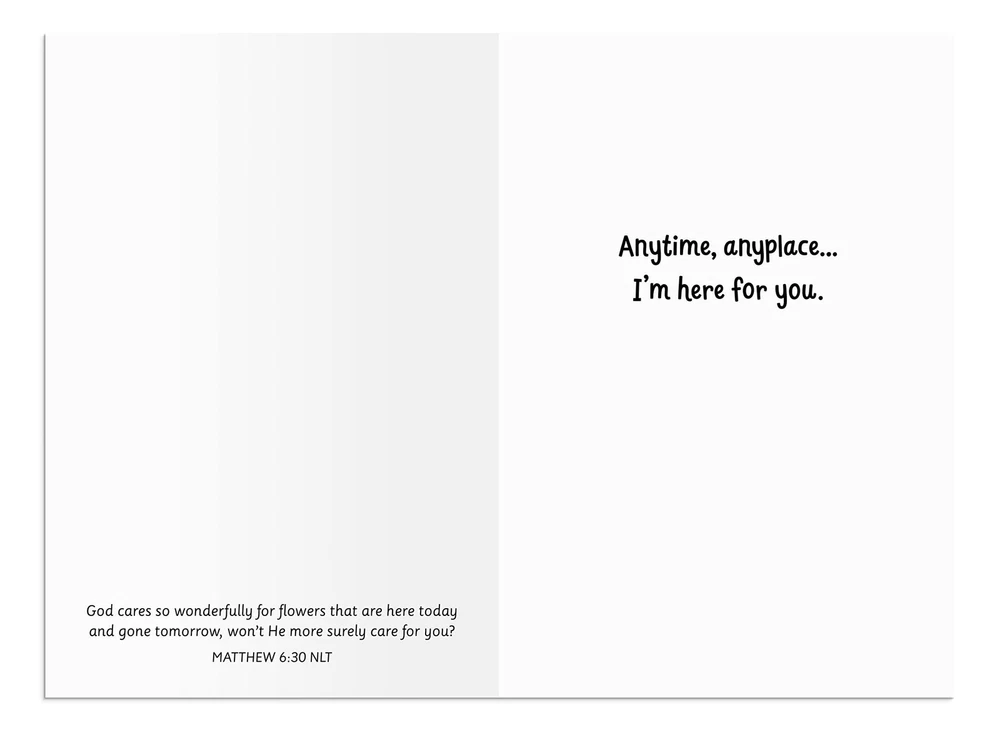 DaySpring - Need a Hug? - 4 Peanuts Greeting Card Assortment with Scripture - 12 Care & Concern Boxed Cards & Envelopes (U1201) Product Details Manufacturer: DaySpring Brand: Dayspring Item Weight: 6.5 ounces Product Dimensions: 6.56 x 4.5 x 0.1 inches Item model number: U1201 Color: Multi Pre-printed: TRUE Number of Items: 5 Manufacturer Part Number: U1201 Date First Available: February 21, 2023 Everybody loves peanuts! An excellent greeting card assortment to share hope and inspiration with friends and family. Everyone can use a little encouragement now and then. Dayspring care & concern boxed cards make it easy to let them know they in your heart and in your prayers. A perfect way to say, hi, you are not alone, you are loved, just thinking of you, way to go, or just hoping your day is special on any occasion. 3 of each sympthathy card in 4 fun, colorful Peanuts art designs: Snoopy, Charlie Brown, Linus and Lucy. Each inspirational care & concern card features an encouraging sentiment with Scripture from from various translations of the Bible. Folded greeting card size: 4 1/2" x 6 9/16". Packaged in a box with printed lid size: 7 3/4" x 5 3/8" x 1 1/8". DaySpring offers Christian Cards and gifts for All OccasionsBirthday, Christmas, Encouragement, Sympathy, and MoreCards to Help Encourage, Celebrate, and Connect with Others! When your friends and family are hurting or need a little extra care as they walk through their life. Expressing your love, sympathy and care is an awesome way to encourage someone that needs it. A personal handwritten card or note is a meaningful way to express how much you care for a hurting person. You may not know what to communicate to your recipient, but you can reflect your heart with the time and care you put into writing and sending a warm greeting card or note of reminder that you are praying for them. DaySpring’s Sympathy Boxed Card boxed assortment with envelopes makes the art of the sympathy card simple. Each card features a beautiful design, a heartfelt sympathetic sentiment, a Bible verse, and ample space for a personal note or prayer. No matter what you say, it’s the thought and the act of sharing your heart that truly counts. Embrace the opportunity to show care and gratitude to others and cherish your relationships! Sympathy Card 1 - Cover: Good grief! Inside: Sending you my best! Scripture: Two are better than one…. For if they fall, one will lift up the other. ECCLESIASTES 4:9, 10 NRSV Card 2: Cover: Need a hug? Inside: I have an endless supply for you. Scripture: There is a time for everything…. There is a time to hug. ECCLESIASTES 3:1, 5 NCV Card 3: Cover: You never have to wonder if someone cares… Inside: I do. Scripture: Share each other’s troubles and problems, and so obey our Lord’s command. GALATIANS 6:2 TLB Card 4: Cover: (blank) Inside: Anytime, anyplace… I’m here for you. Scripture: God cares so wonderfully for flowers that are here today and gone tomorrow, won’t He more surely care for you? MATTHEW 6:30 NLT Product DetailsEverybody loves peanuts! An excellent greeting card assortment to share hope and inspiration with friends and family. Everyone can use a little encouragement now and then. Dayspring care & concern boxed cards make it easy to let them know they in your heart and in your prayers. A perfect way to say, hi, you are not alone, you are loved, just thinking of you, way to go, or just hoping your day is special on any occasion.3 of each sympthathy card in 4 fun, colorful Peanuts art designs: Snoopy, Charlie Brown, Linus and Lucy.Each inspirational care & concern card features an encouraging sentiment with Scripture from from various translations of the Bible.Folded greeting card size: 4 1/2" x 6 9/16". Packaged in a box with printed lid size: 7 3/4" x 5 3/8" x 1 1/8".DaySpring offers Christian Cards and gifts for All Occasions—Birthday, Christmas, Encouragement, Sympathy, and More—Cards to Help Encourage, Celebrate, and Connect with Others!