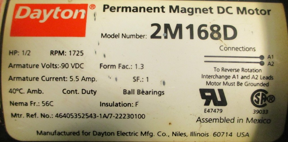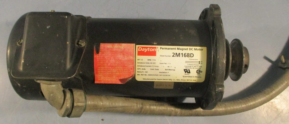 Motor For sale is a Dayton 2M168D Permanent Magnet DC Motor 1725RPM 1/2HP 90VDC 5/8" Shaft Dia. Item appears used and in great condition. Will come as shown and with what is pictured. Item may show minor imperfections from shelf wear but will not impact performance. Shaft Dia: 5/8" Thank you for looking and please let us know if you have any questions. eTech Surplus Rochester, NY Shipping: Charged according to location. Please note that eBay charges sales tax, we do not. We at eTech Surplus strive to honestly and accurately describe each item we sell. Please feel free to contact us with any questions. International Buyers - Please Note: Import duties, taxes and charges are not included in the item price or shipping cost. These charges are the buyer's responsibility. Please check with your country's customs office to determine what these additional costs will be prior to bidding or buying.