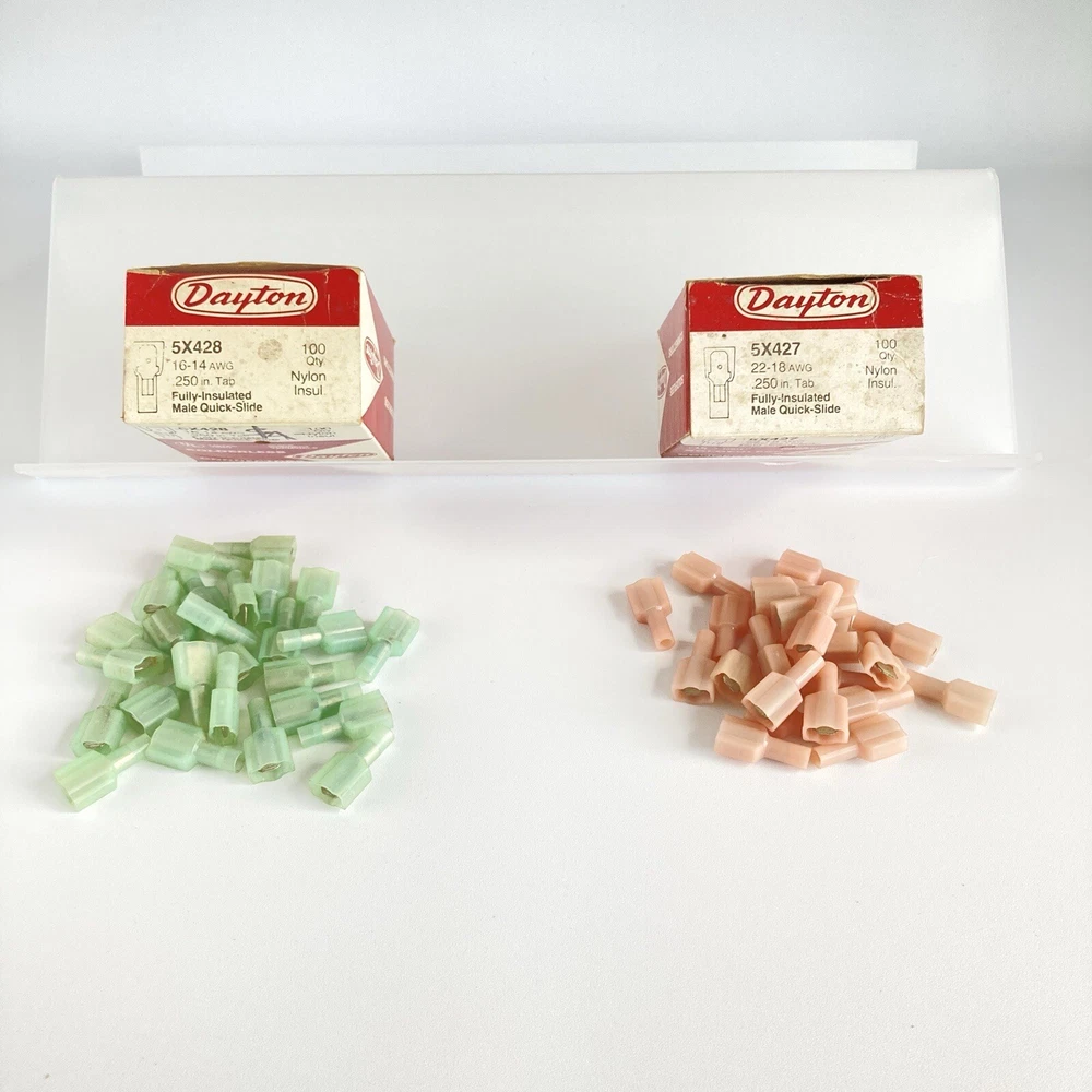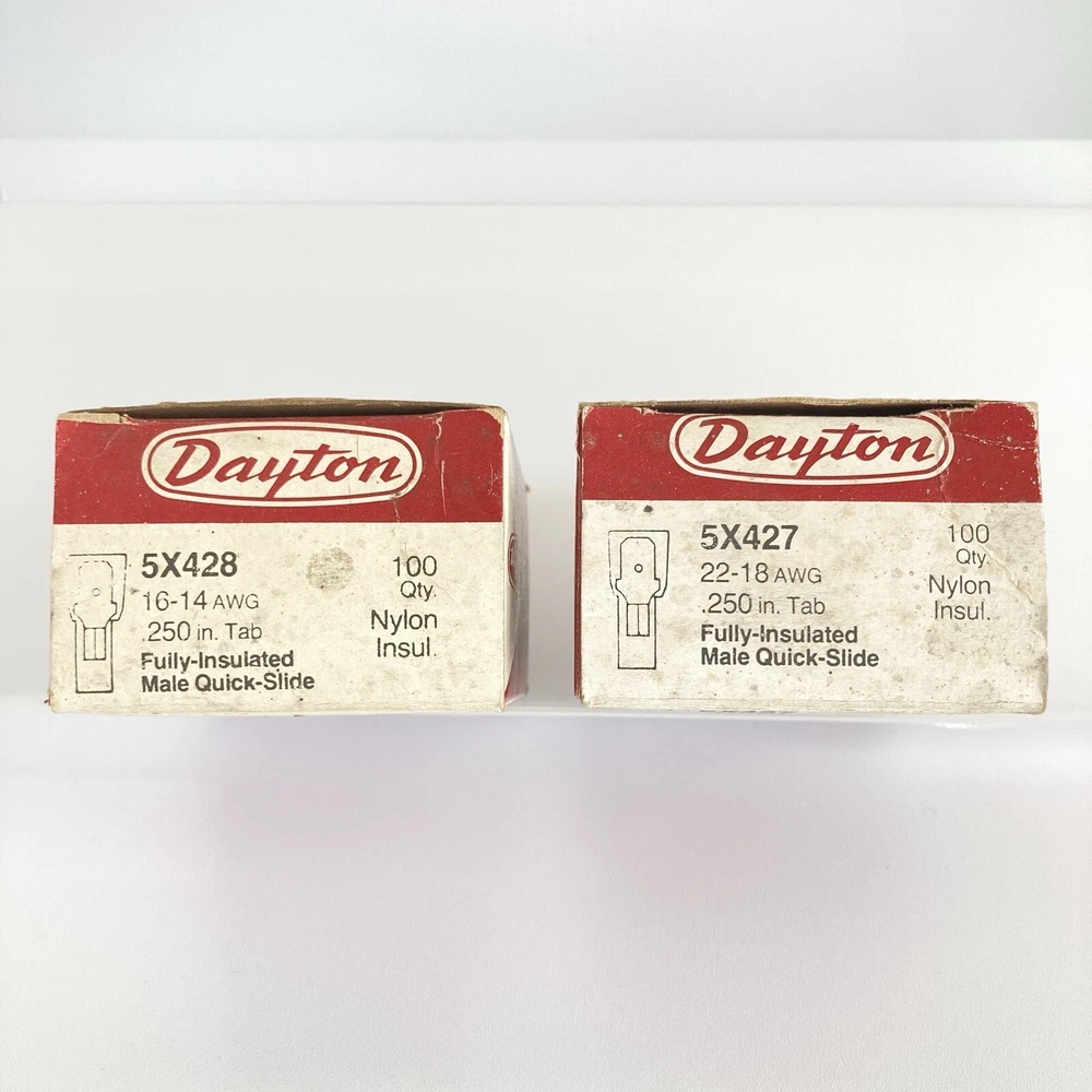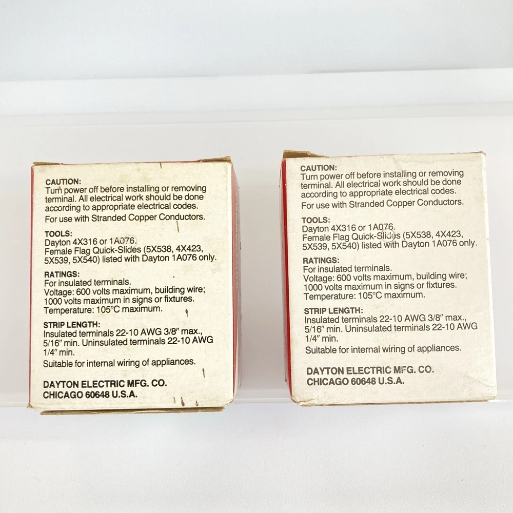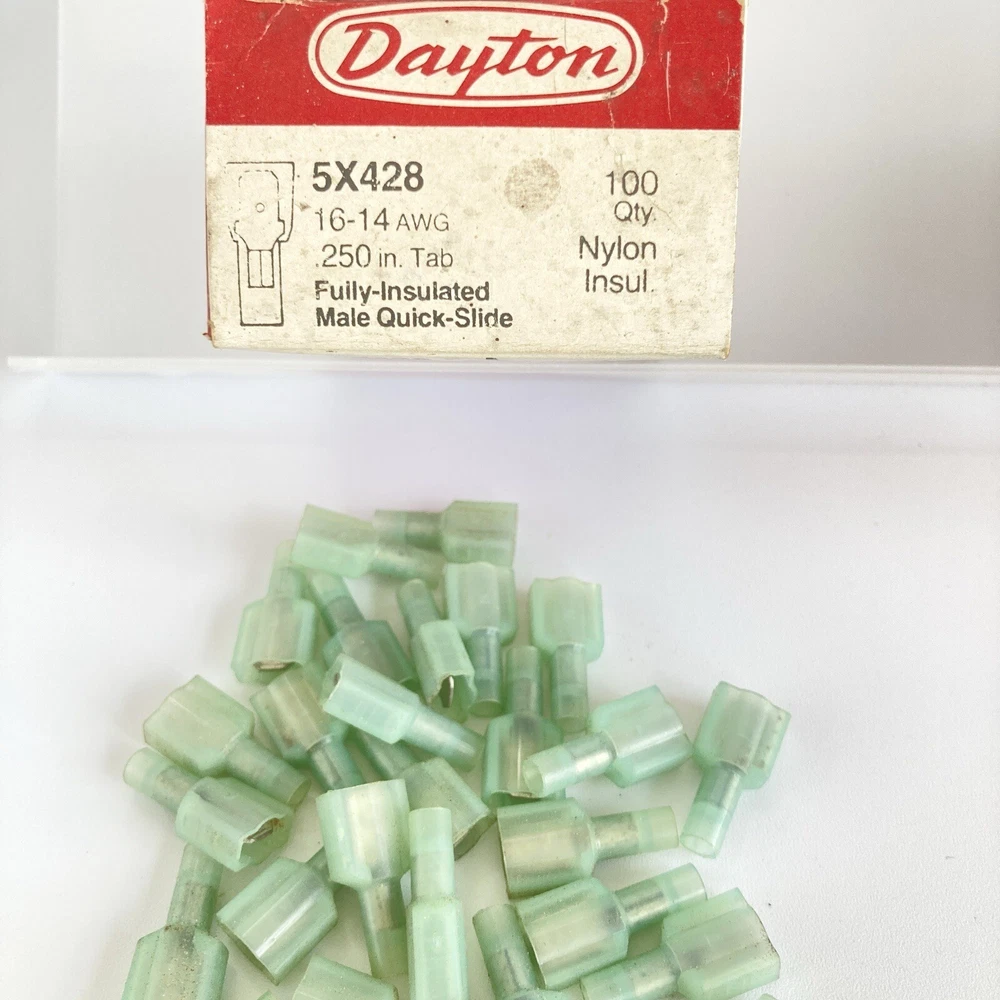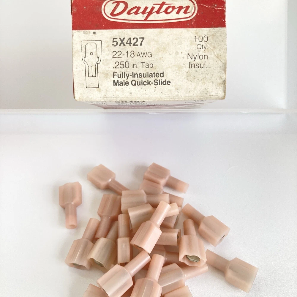 Dayton Quick Connect Terminals Solderless Connectors Fully-Insulated Male Quick-Slide Nylon Insulation 5X427 5X428 22-18 AWG 16-14 AWG .250 in. Tab .250 in. Tab Red Blue Qty - 23 Qty - 26 TOOLS: Dayton 4X316 or 1A076. Female Flag Quick-Slides (5X538, 4X425, 5X539, 5X540) listed with Dayton 1A076 only. RATINGS: For insulated terminals. Voltage: 600 volts maximum, building wire; 1000 volts maximum in signs or fixtures. Temperature: 105 C max. STRIP LENGTH: Insulated terminals 22-10 AWG 3/8" max., 5/16" min. Uninsulated terminals 22-10 AWG 1/4" min. SUITABLE FOR: Internal wiring of appliances.