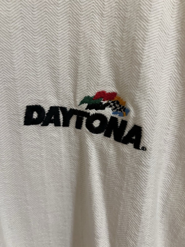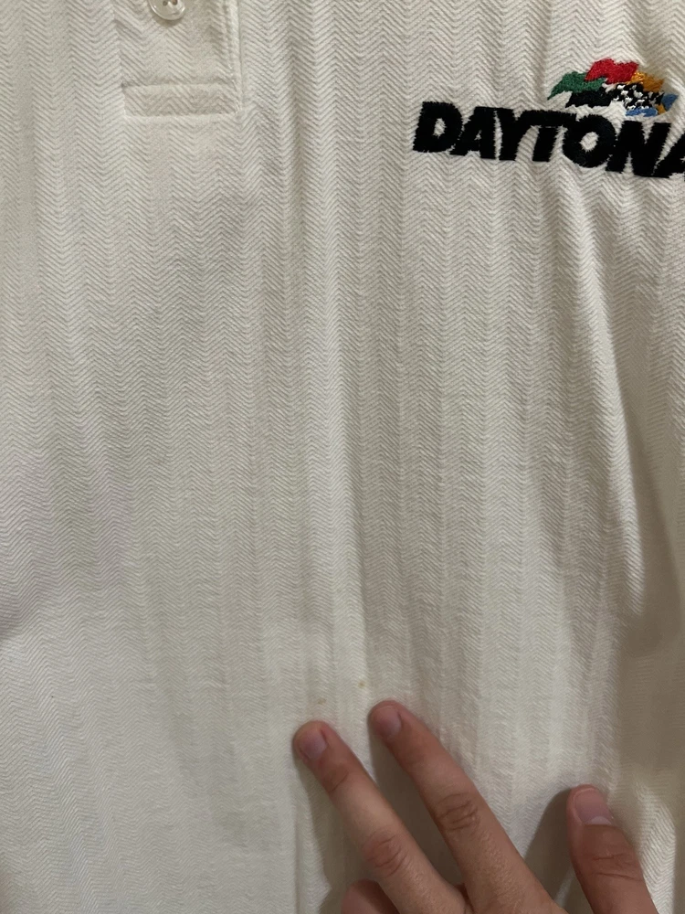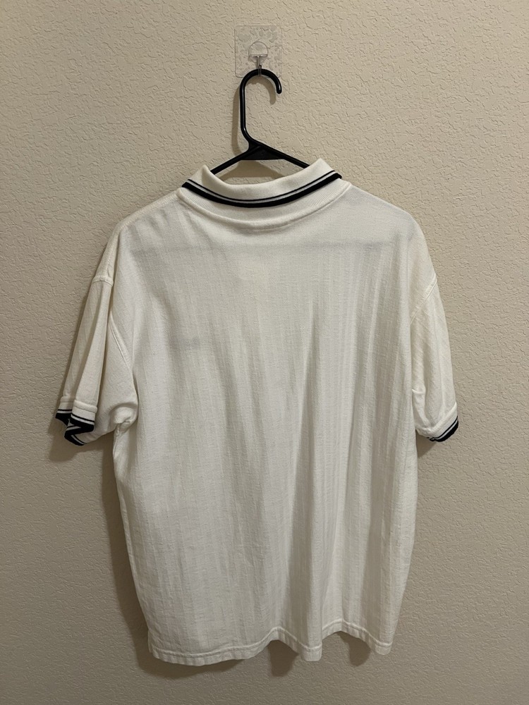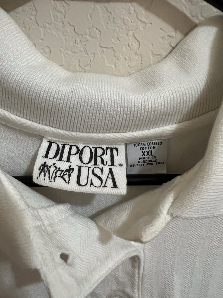 The tag indicates the shirt is an XXL. I believe the shirt is a women’s XXL but it fits like a men’s large. Crafted for comfort and style, this white Diport polo shirt is a timeless addition to any wardrobe. The shirt features a classic, collared neckline with a point collar style and short sleeves that make it ideal for both casual and semi-formal occasions. Its 100% cotton jersey fabric ensures breathability and ease of movement, while the moisture-wicking property keeps you dry throughout the day. With a nod to vintage appeal, this shirt showcases a light fabric wash that complements its nostalgic theme. The solid white color is versatile and easy to pair with a range of bottoms, and the regular fit ensures a relaxed, yet tailored look. Whether you're hitting the links or enjoying a day at the beach, this polo shirt is equipped to handle both leisure and activity with ease.