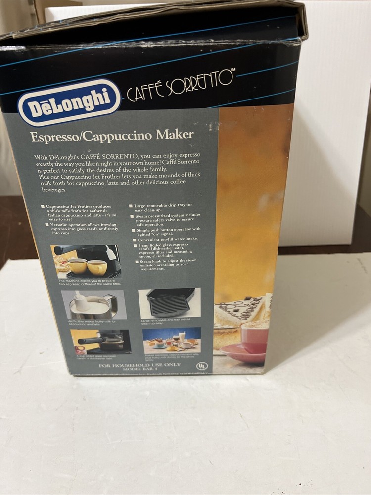 Make your mornings perfect with the De'Longhi Caffe Sorrento Espresso/Cappuccino Maker in black. This machine is designed to make your life easier by producing rich, delicious espresso and cappuccino quickly and easily. With the ability to make up to 4 cups of coffee at a time, you can feed the whole family or enjoy a quiet cup of coffee by yourself. This machine is made of high-quality stainless steel and comes with a removable drip tray and a frother. It also includes a user manual and a measuring scoop, making it easy to get started with your coffee-making journey. The Caffe Sorrento is an electrical machine that makes less than 5 bar pressure, ensuring that you get the perfect extraction of coffee every time. Get yours today and enjoy the perfect cup of coffee every morning!