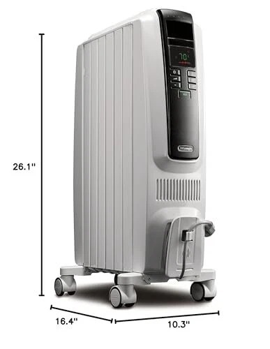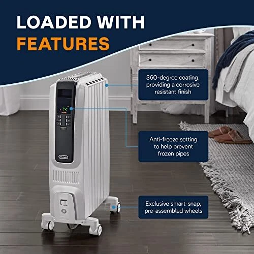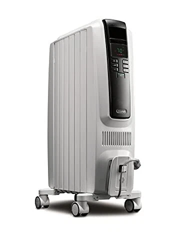 De'Longhi Dragon Digital Oil Filled Radiator Heater, 1500W Electric Space Heater for indoor use, programmable timer, Energy Saving, full room heater with safety features TRD40615E From the inventors of the oil filled category comes a revolutionary new design that effectively and efficiently heats room air by convection and also has 25% more radiant surface to quickly heat people in the room. The new heater design features thermal chimneys to provide maximum heating while ensuring a low surface temperature, making the radiator a nice choice for homes with pets or kids. The user-friendly control panel offers an adjustable thermostat and variable heat settings to customize your heating needs and optimize energy-efficient operation. For added energy savings it also features a 24-hour programmable timer. The anti-freeze setting allows the unit to automatically turn on when the temperature drops below 44 degrees F. Safety highlights include rust-resistant durable metal construction, a modern design, and a thermal cut-off function that automatically turns the heater off if it starts to overheat. Digital control panel with LED display for easy selection includes all the available functions and 24 hour timer. De'Longhi Exclusive: 75% more radiant surface area than RadiaS due to unique design*- the more radiant surface= the more heat transferred to you and your environment Quick Heat Up: Warm air is rapidly distributed thanks to the increased convection heating effect and exclusive battery design. Better Heating- delivers gentle heat minimizing dry air, creating a better breathing environment that is more allergy friendly with no fan to stir up dust, pollen and dander. Integrated handle and control panel allow you to easily operate and relocate your heater at any time during or after use. Exclusive ECO Plus feature optimizes energy consumption by regulating power flow and temperature to efficiently manage your comfort Ergonomic Portability: Enjoy easy movement from room to room thanks to ergonomic front and rear handles Exclusive Smart Snap wheels require no installation and are rubber coated for smooth transition between surfaces. 1500 watts of Long lasting, quiet heat for small to medium spaces Built-in Safety Elements: Important safety features include child lock and a thermal cut-off function that turns off the machine in case of overheating. Additionally, when the temperature dips below 41 degrees F (5C), the Anti-freeze setting automatically switches on the heater Durable & Low Maintenance: High quality steel assembly and permanently-sealed diathermic oil reservoir never needs refilling. A specialized multilayered painting process provides a complete, corrosive resistant finish.