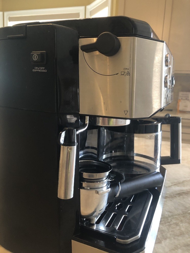 Brand De'Longhi Capacity 10 Cups Color Silver-Black Product Dimensions 11"D x 14.5"W x 12.7"H Coffee Maker Type Espresso Machine Material Glass 1 machine does it all: 1 side makes authentic 15-bar espresso, cappuccino and latte, while the other side brews exceptionally delicious coffee. Flavor savor brew system: De’longhi’s patented coffee brewing system extracts maximum flavor and aroma for a robust coffee experience. Front-loading system: Both water and coffee reservoirs are conveniently located with frontal access for drip coffee – no need to move the machine. Your foam, your way: The advanced cappuccino system mixes steam and milk to create a rich, creamy froth for evenly textured drinks – just the way you like them. Filtered water for a better brew: The advanced active carbon filter keeps water fresh and free of impurities for better-tasting brewed coffee. Included components: Water filter Product specifications Measurements Capacity 10 Cups Item Dimensions D x W x H 11"D x 14.5"W x 12.7"H Item Weight 10.25 Pounds Style Color Silver-Black Style BCO430BM Features & Specs Coffee Maker Type Espresso Machine Filter Type Reusable Specific Uses For Product coofee making , milk frothing Materials & Care Material Glass Top Brand: De'Longhi Highly Rated 100K+ customers rate items from this brand highly Trending 100K+ orders for this brand in past 3 months Low Returns Customers usually keep items from this brand For Espresso and drip coffee lovers alike, The De’Longhi combination pump espresso/drip coffee machine, BCO430BM, offers the best of both worlds. This all-in-1 machine prepares coffee, cappuccino, espresso and even lattes to perfection using an innovative preparation system with simple steps for the at-home user. This new machine can brew two drinks at once, with a full cappuccino system on one side and a drip coffee machine on the other. It features 15 bars of pressure for drawing the most flavor and desired temperature in each cup of espresso, delivering customized, quality flavor every time. For drip coffee, It also features a frontal loading system, which allows you to load water and coffee from the front of the machine without having to move it from under the cabinet. The 24-hour programmable timer allows you to have a pot of coffee waiting for you when you want it. Experience the convenience and quality of this multitasking machine. Rated voltage/frequency (V-Hz): 115 V / 60Hz, Filter (V-shape): Permanent.